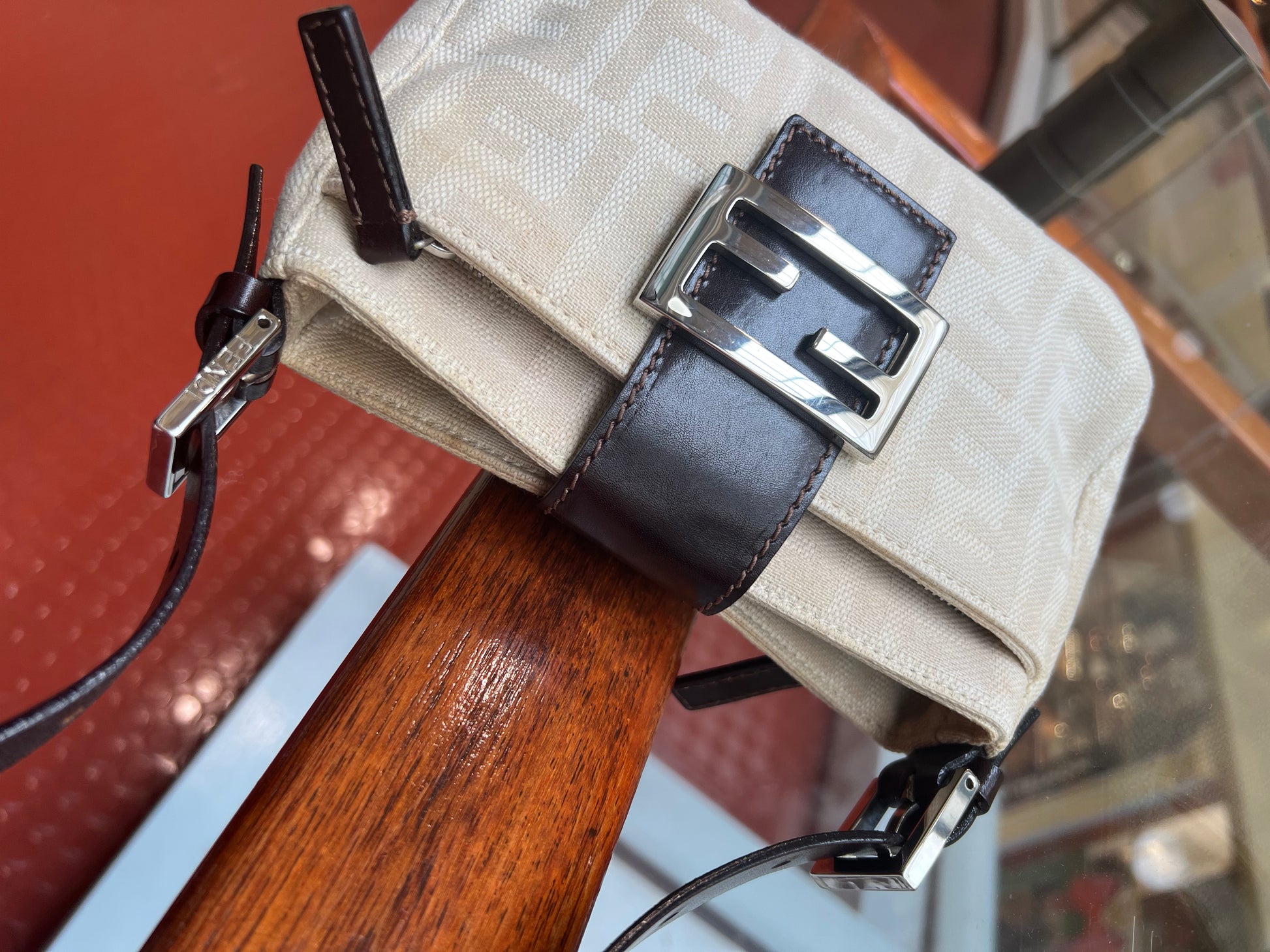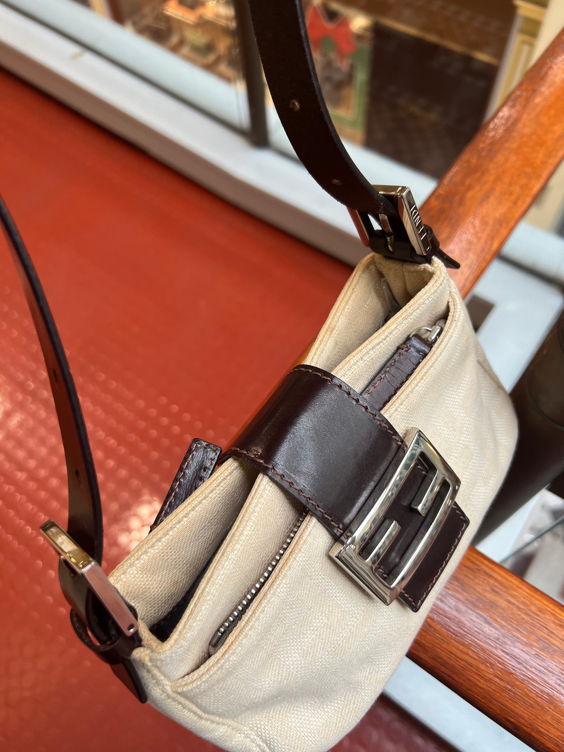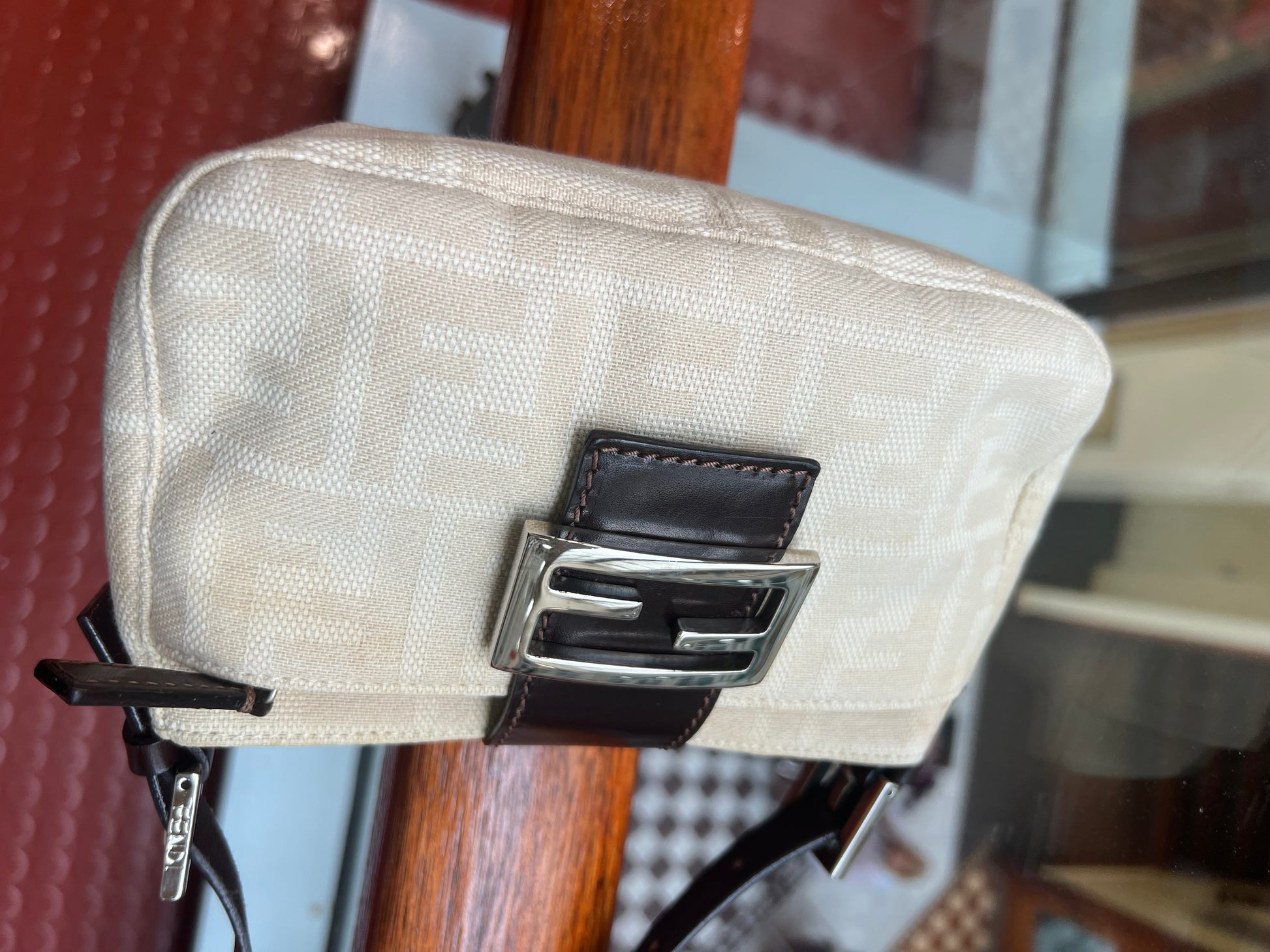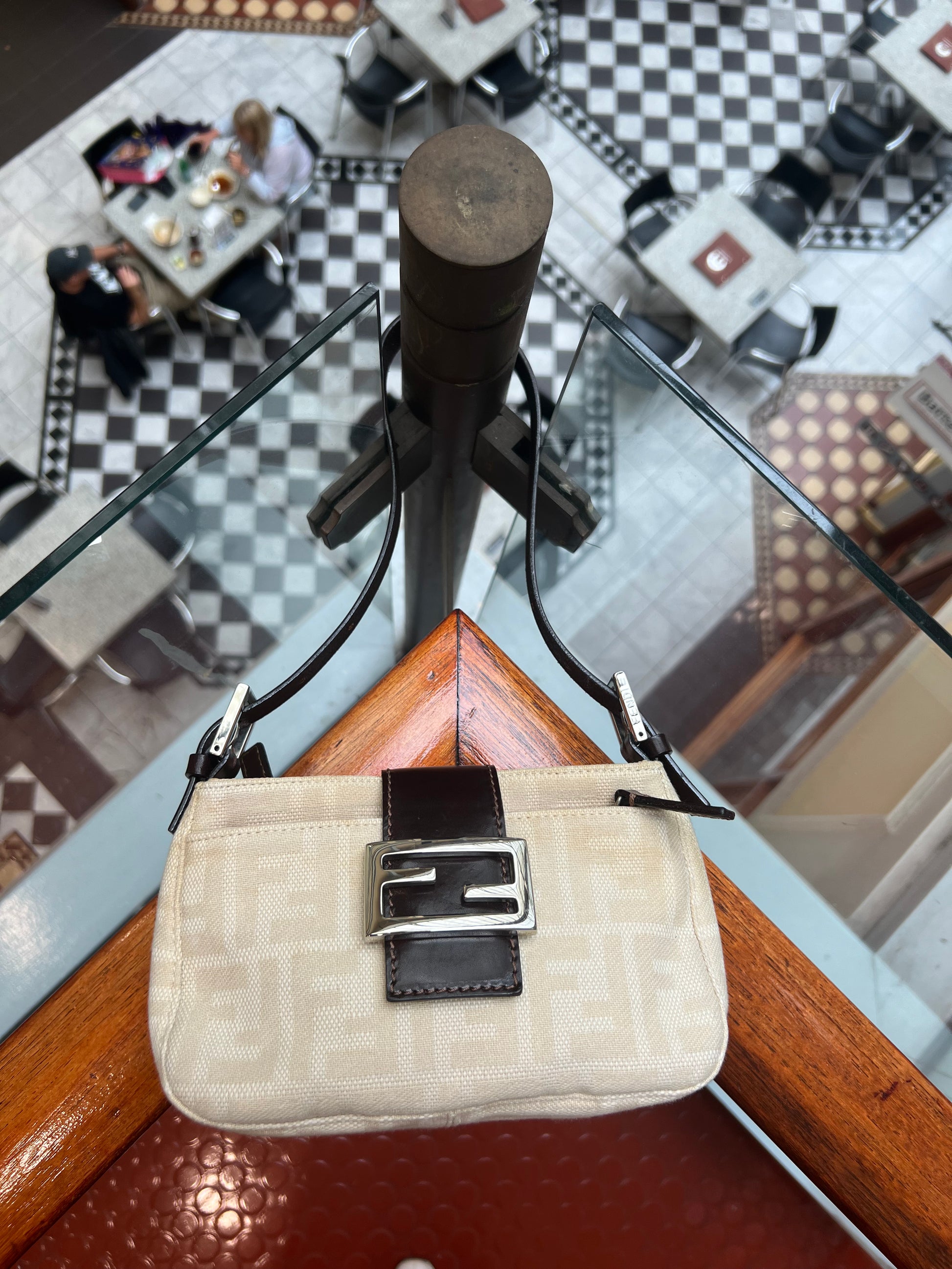 Rare lovely baguette bag in Fendi fabric with adiustable leather shoulder strap. Silver hardware. 1× central open compartment and 1× zipped compartments.