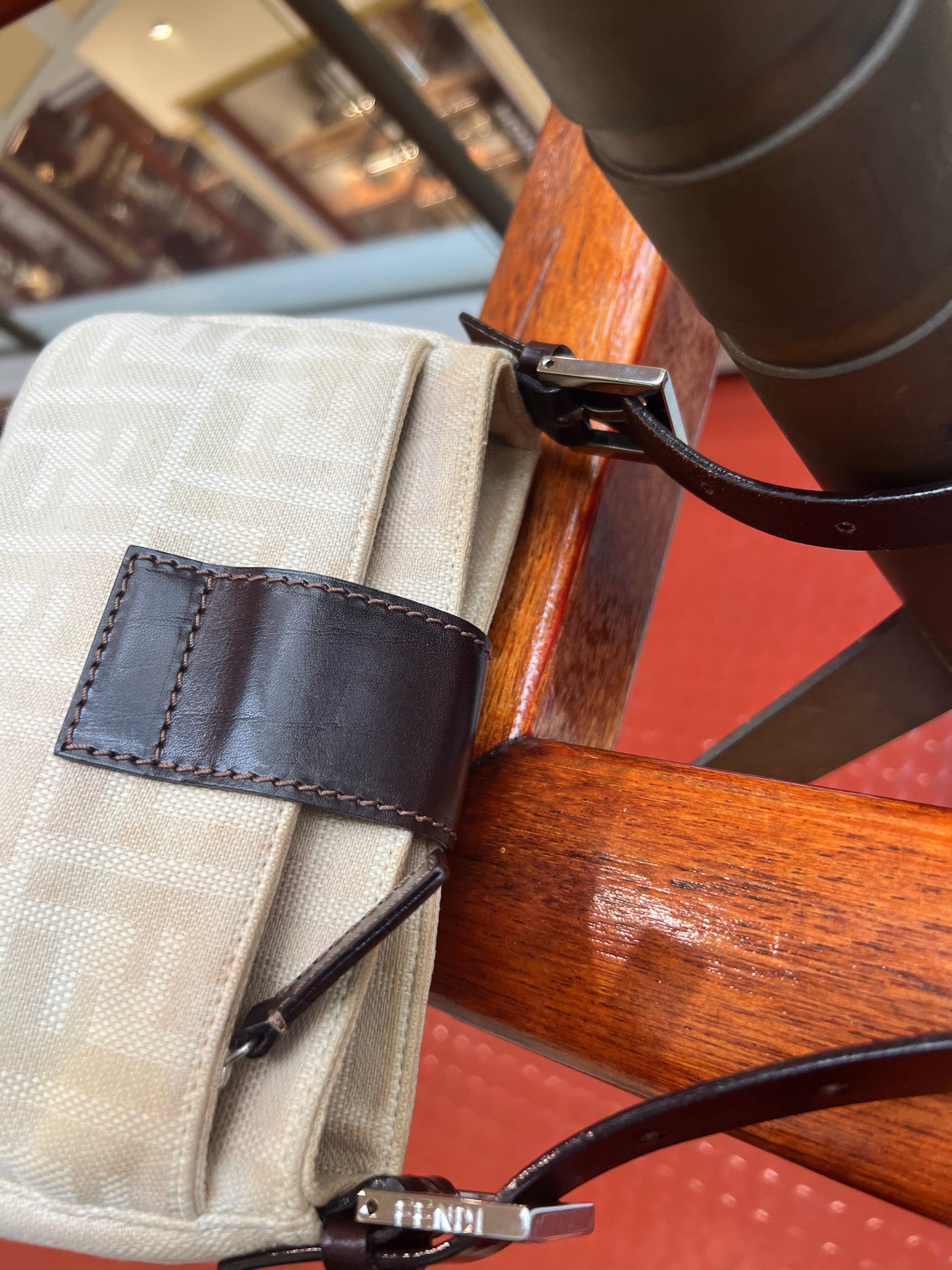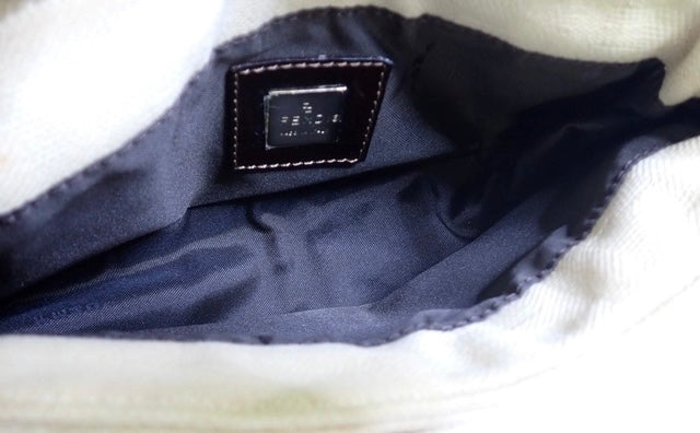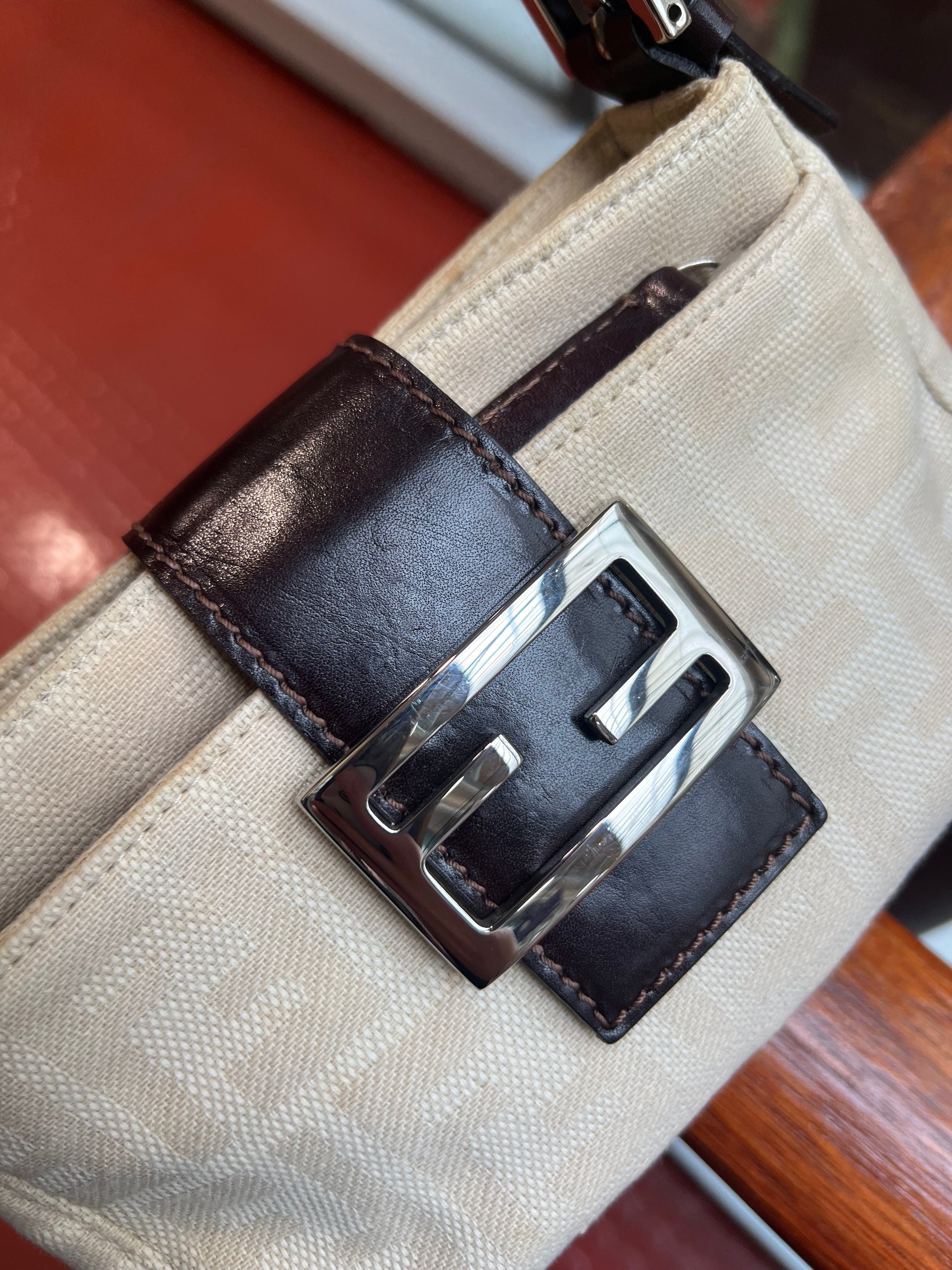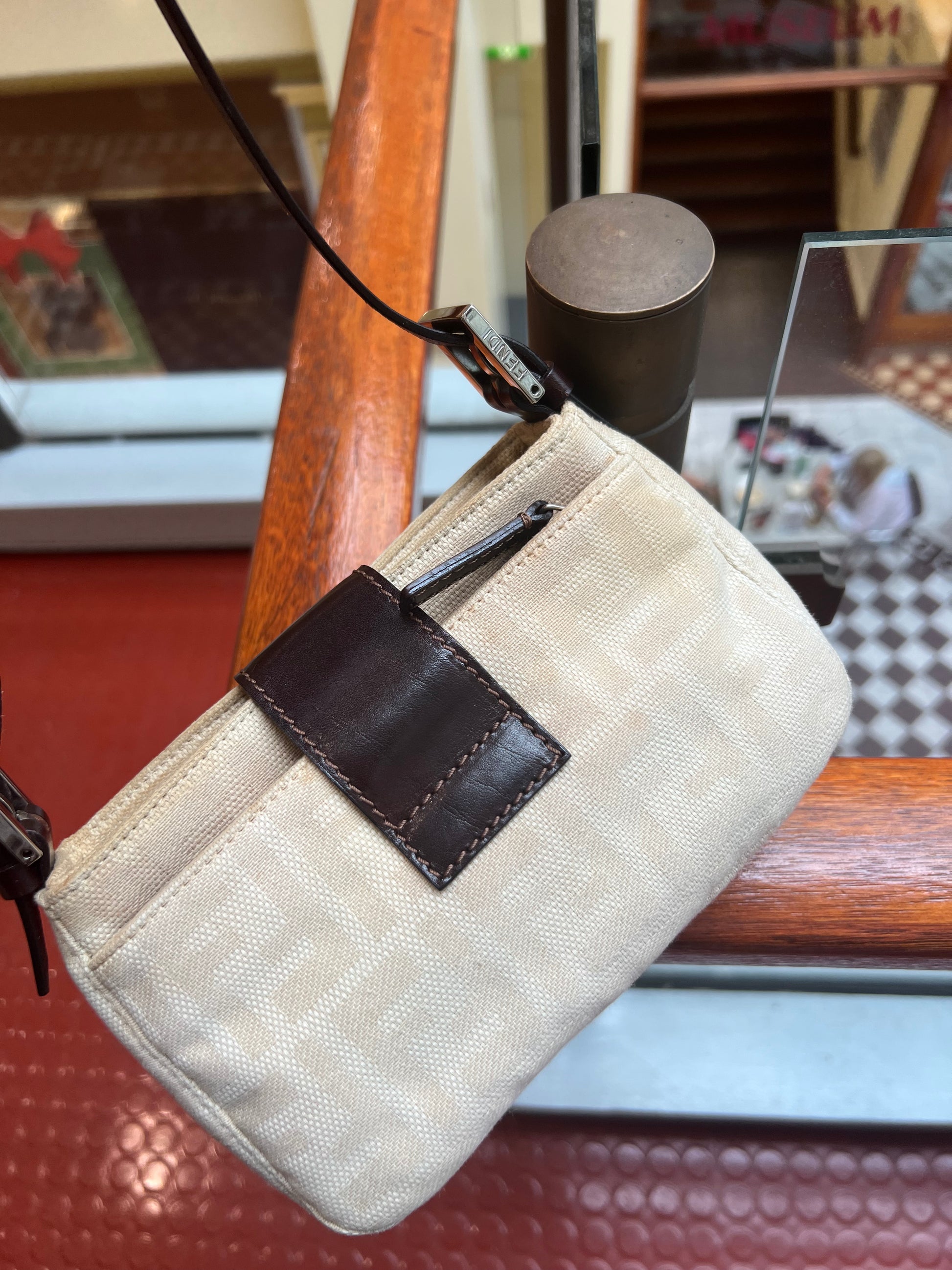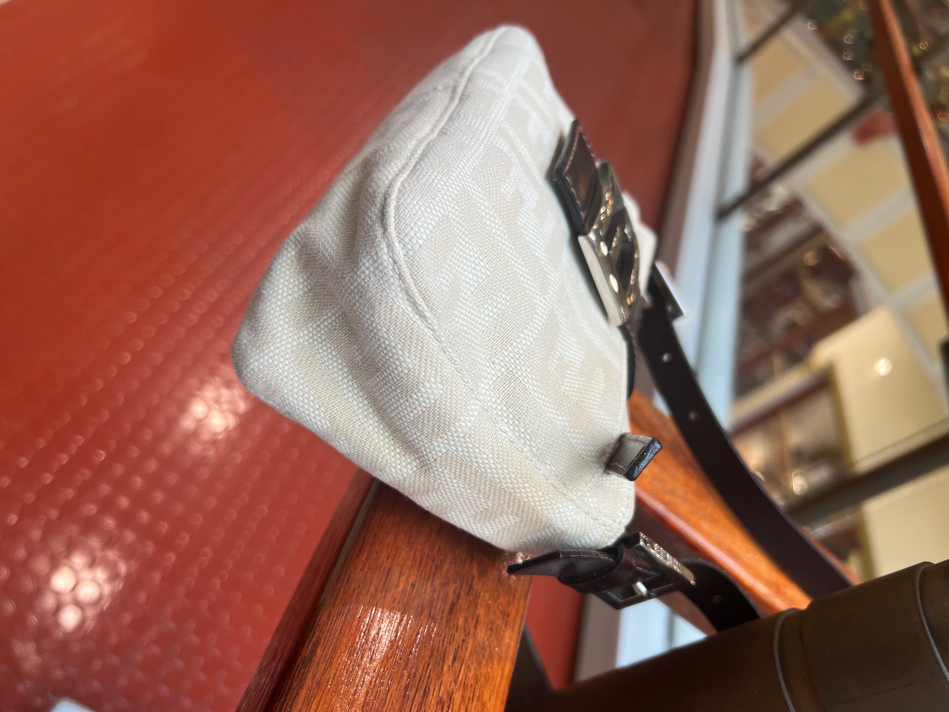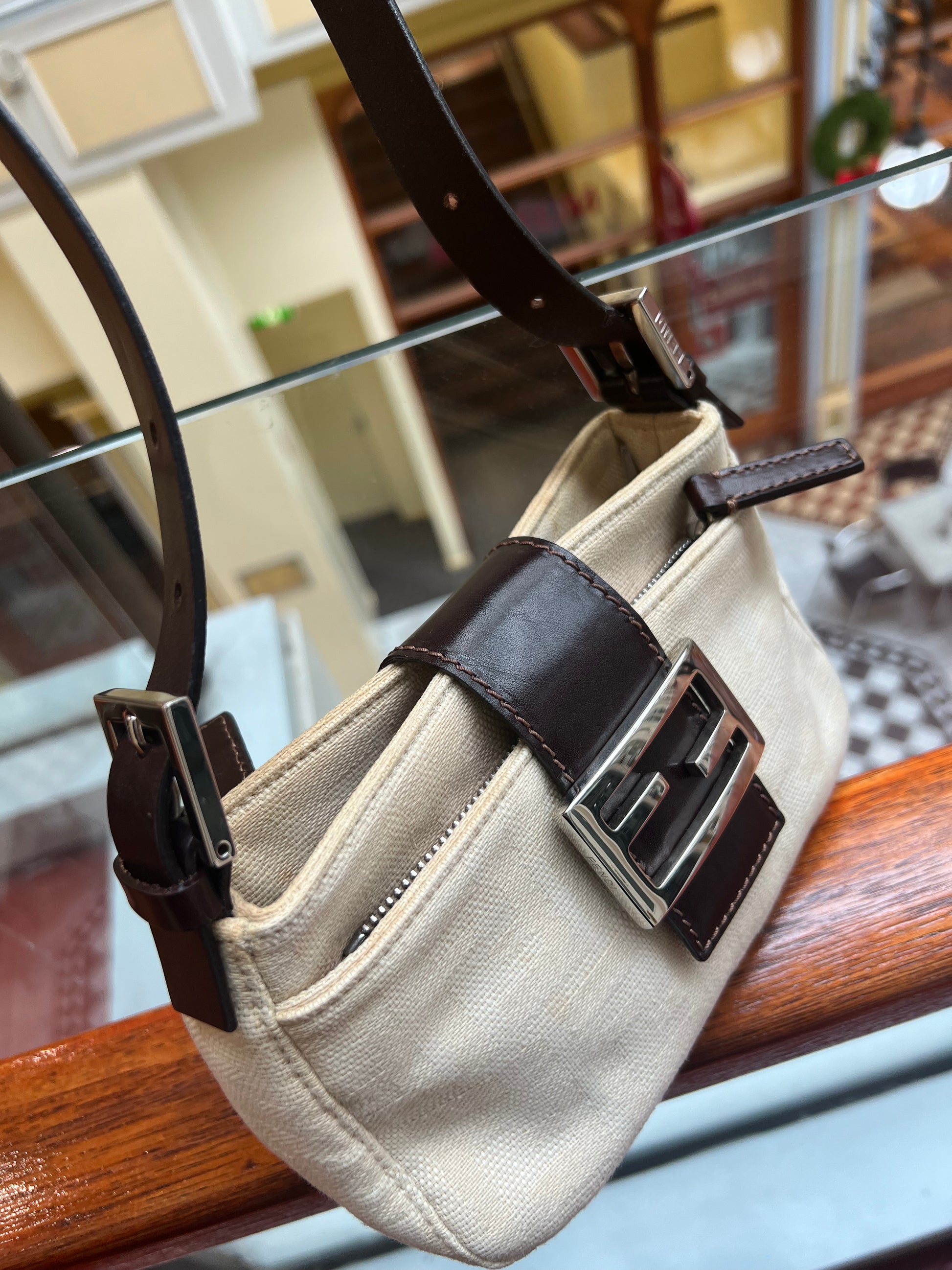 Rare lovely baguette bag in Fendi fabric with adiustable leather shoulder strap. Silver hardware. 1× central open compartment and 1× zipped compartments.