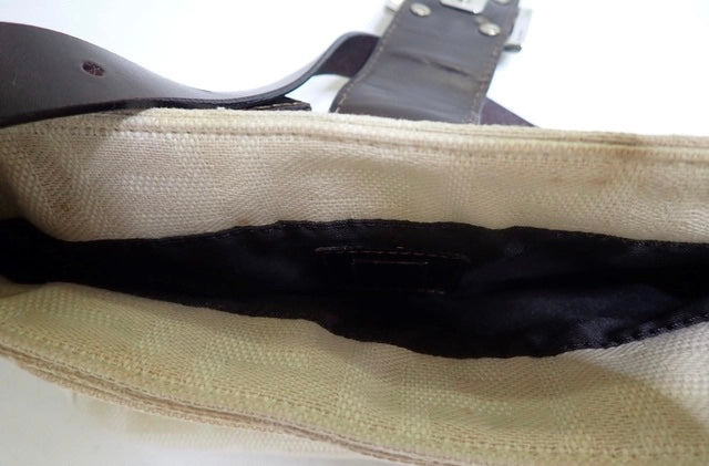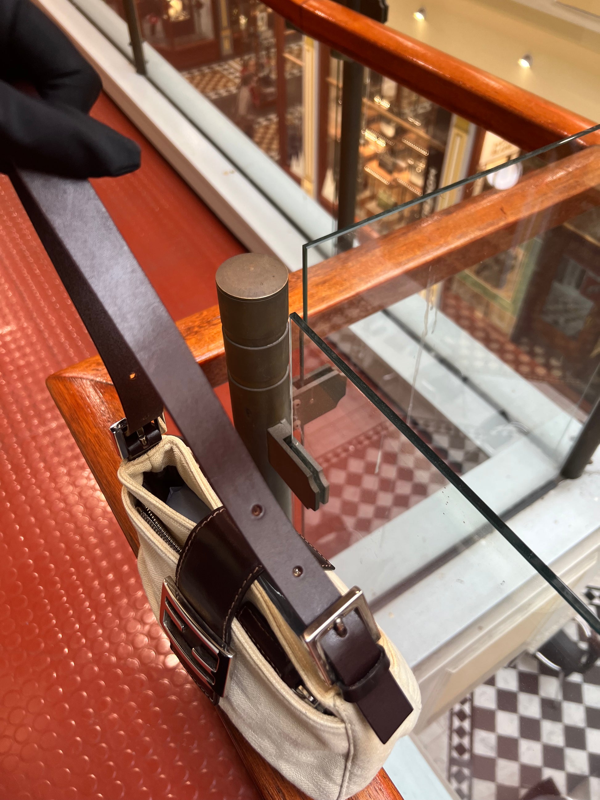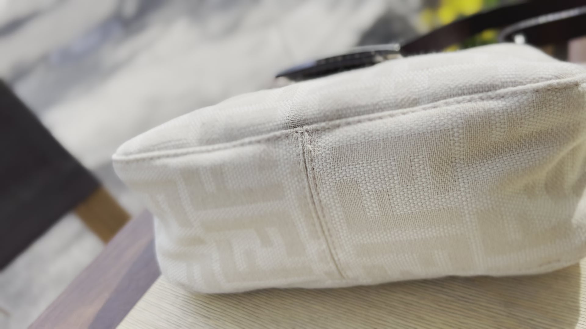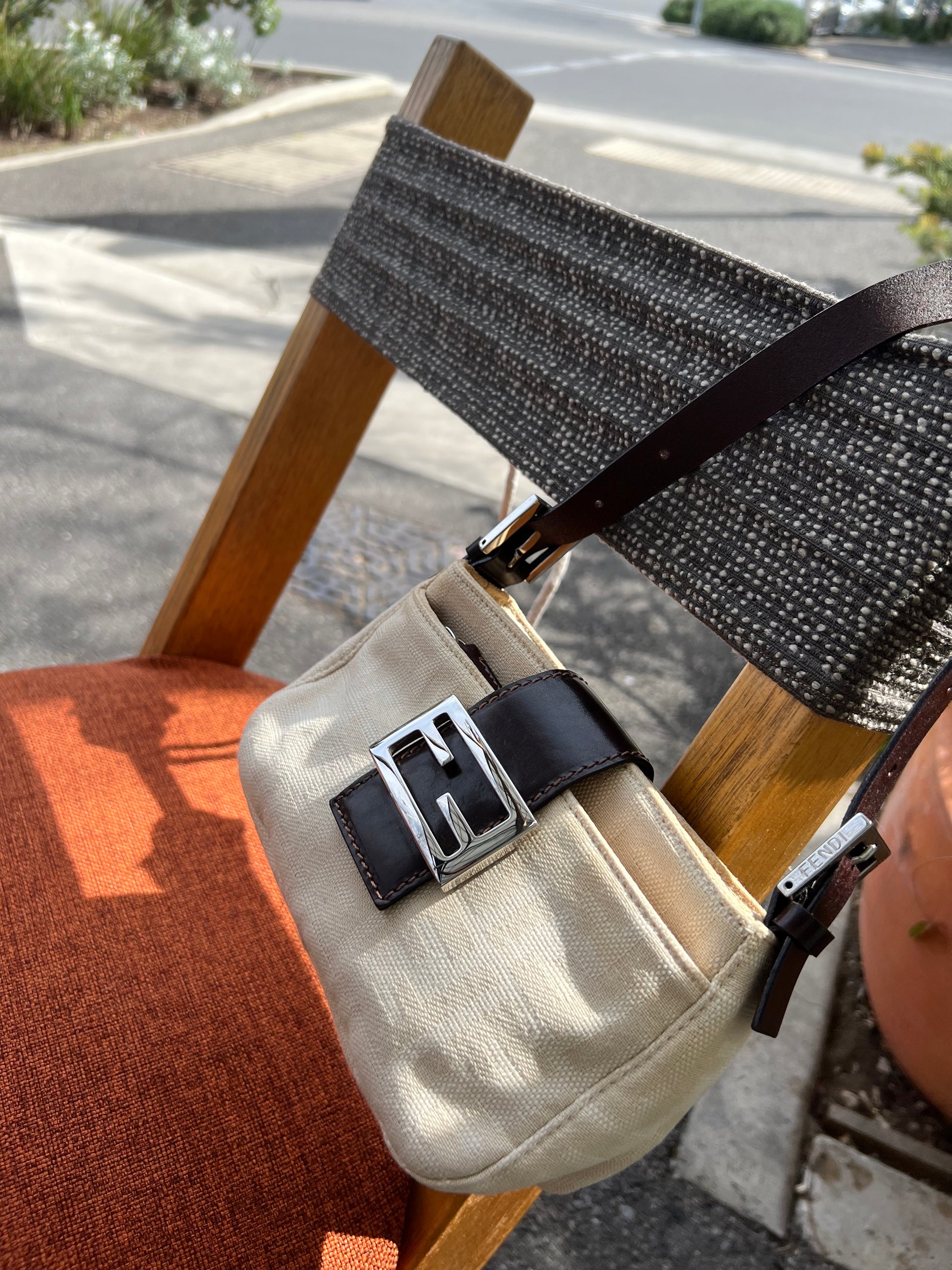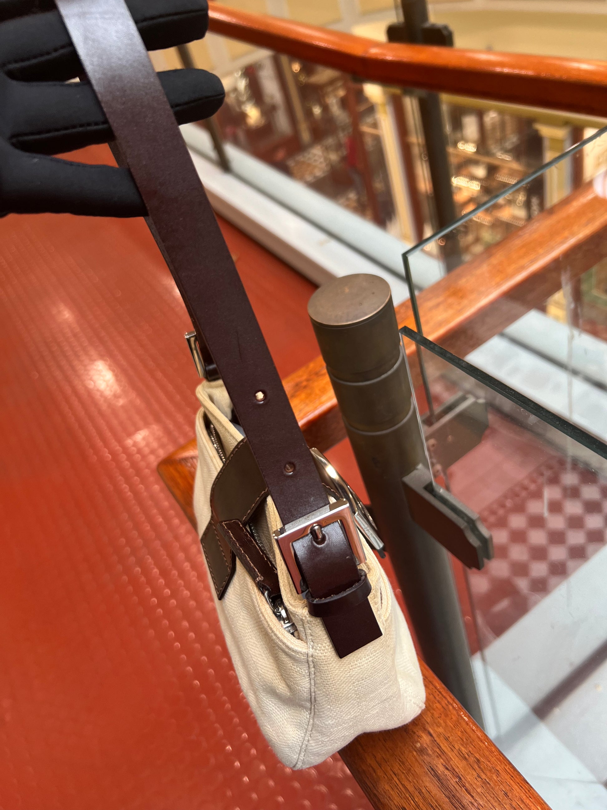 Rare lovely baguette bag in Fendi fabric with adiustable leather shoulder strap. Silver hardware. 1× central open compartment and 1× zipped compartments.