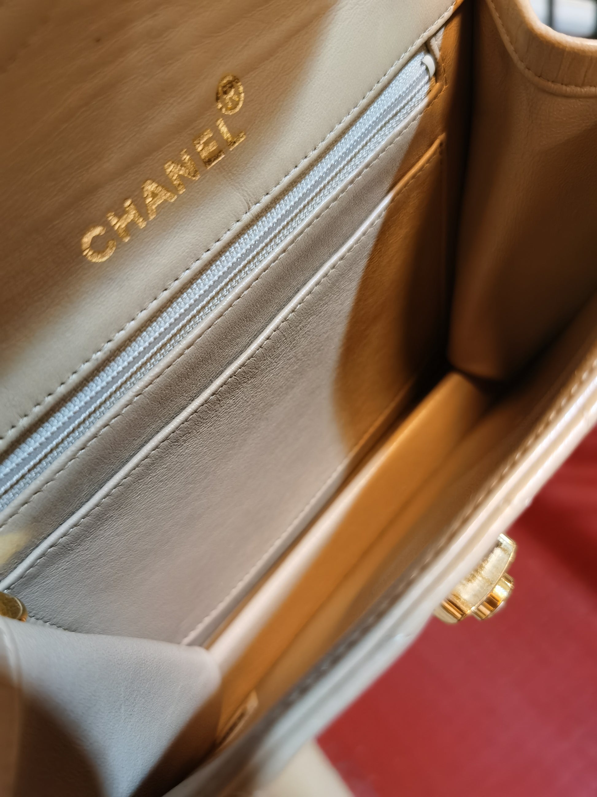Very good vintage condition, rare Chanel vintage square lock and golden plating hardware. All over slight dirt rubbing and outside edge faded, metallic parts scratches.