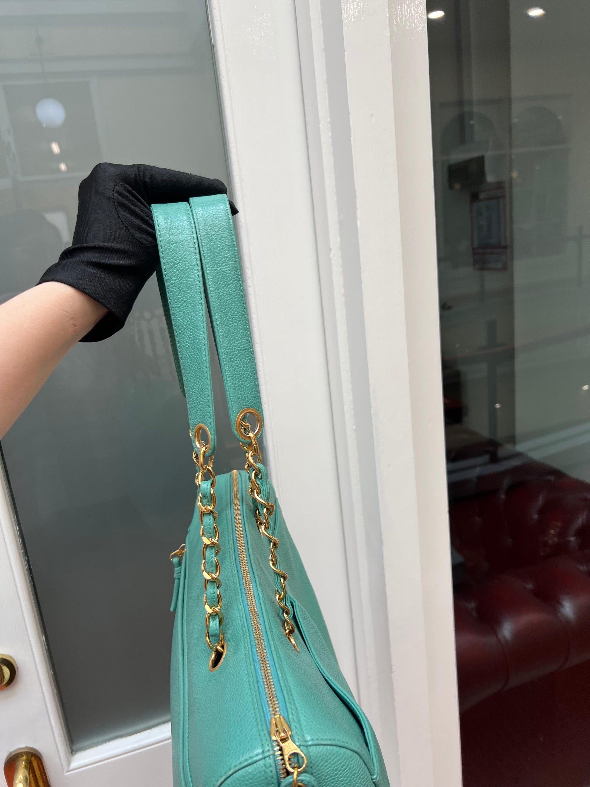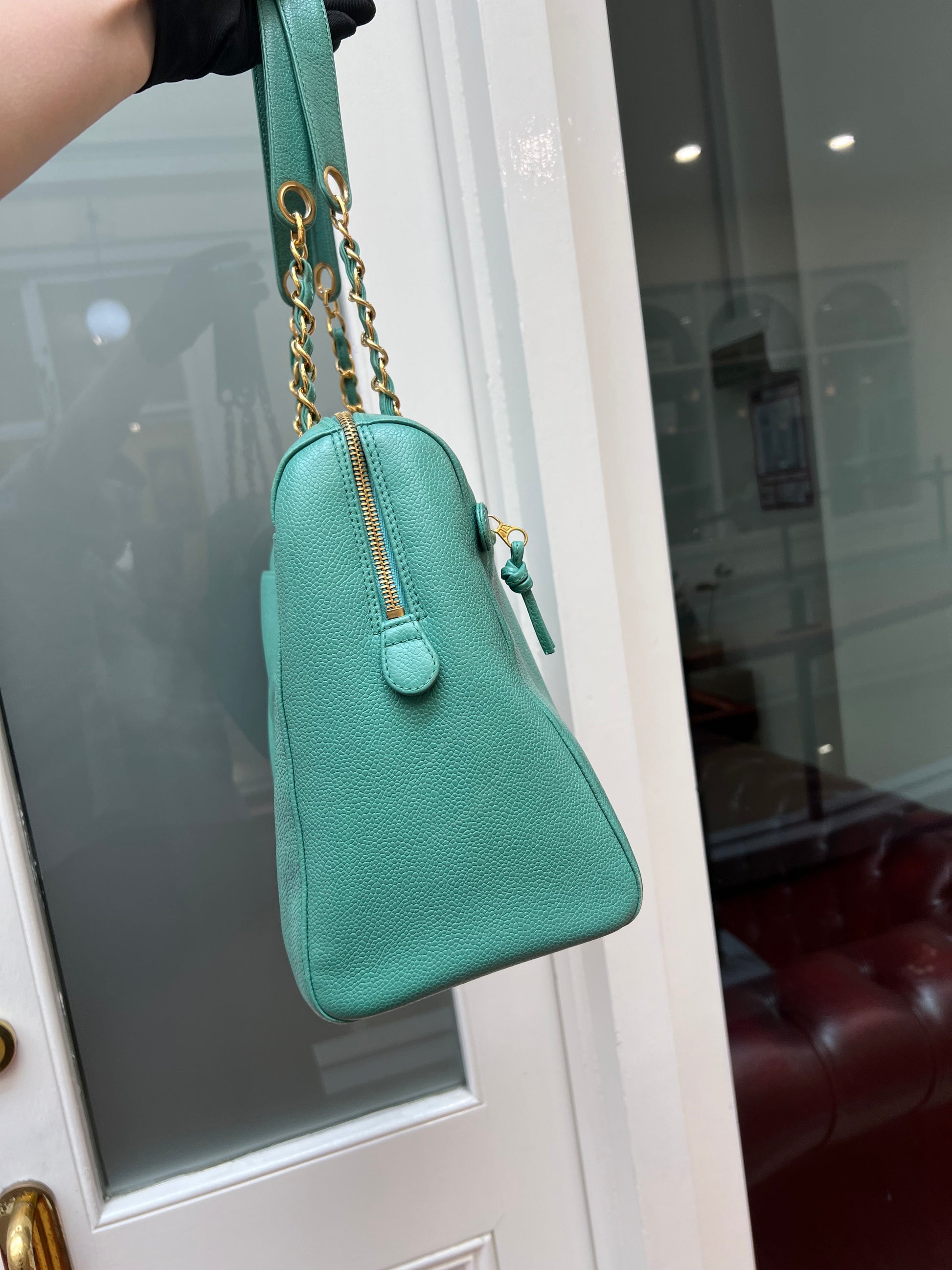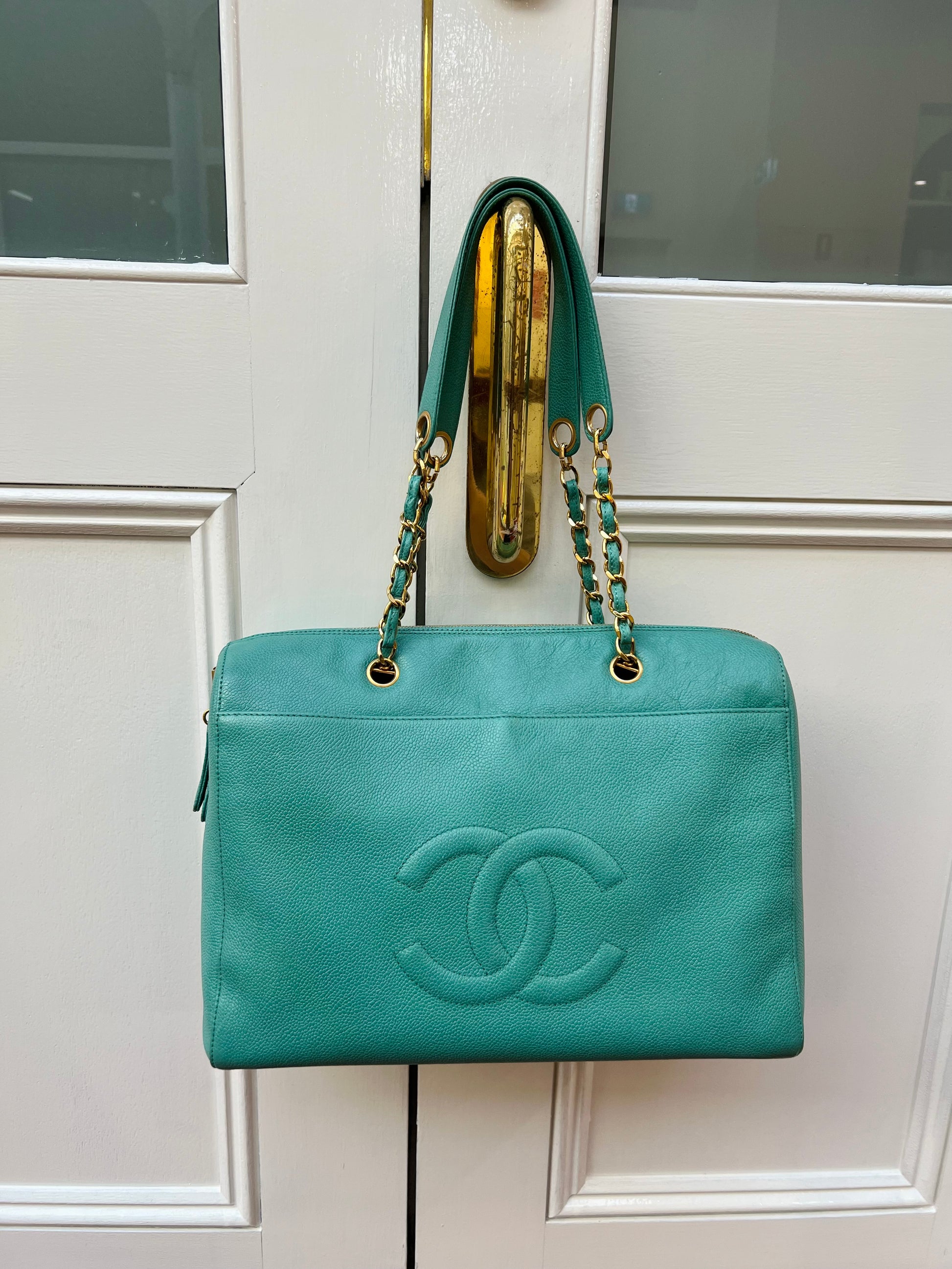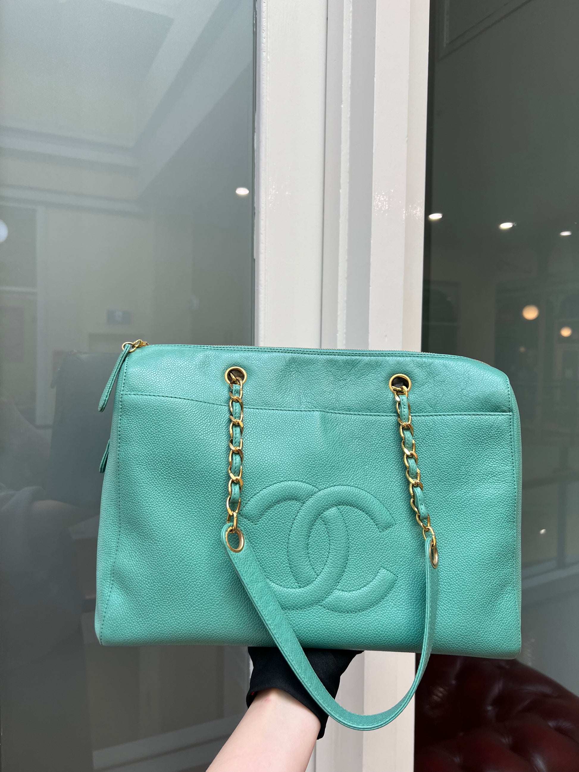 Chanel vintage mid 90s zipped tote bag in Caviar grained leather, with embroidered 'CC' logo interlocking on the front and finished with a gold plated chain.