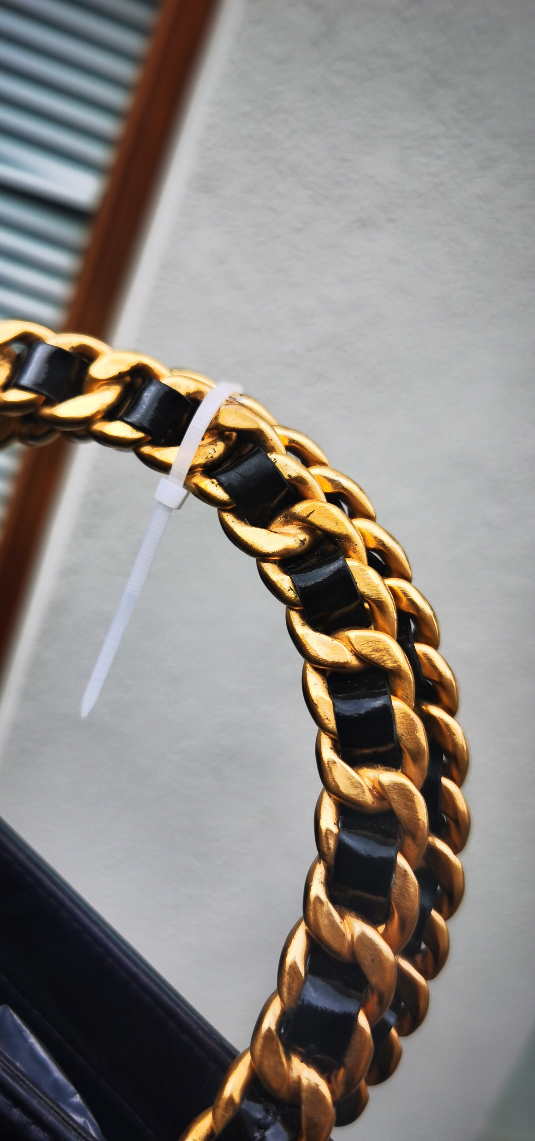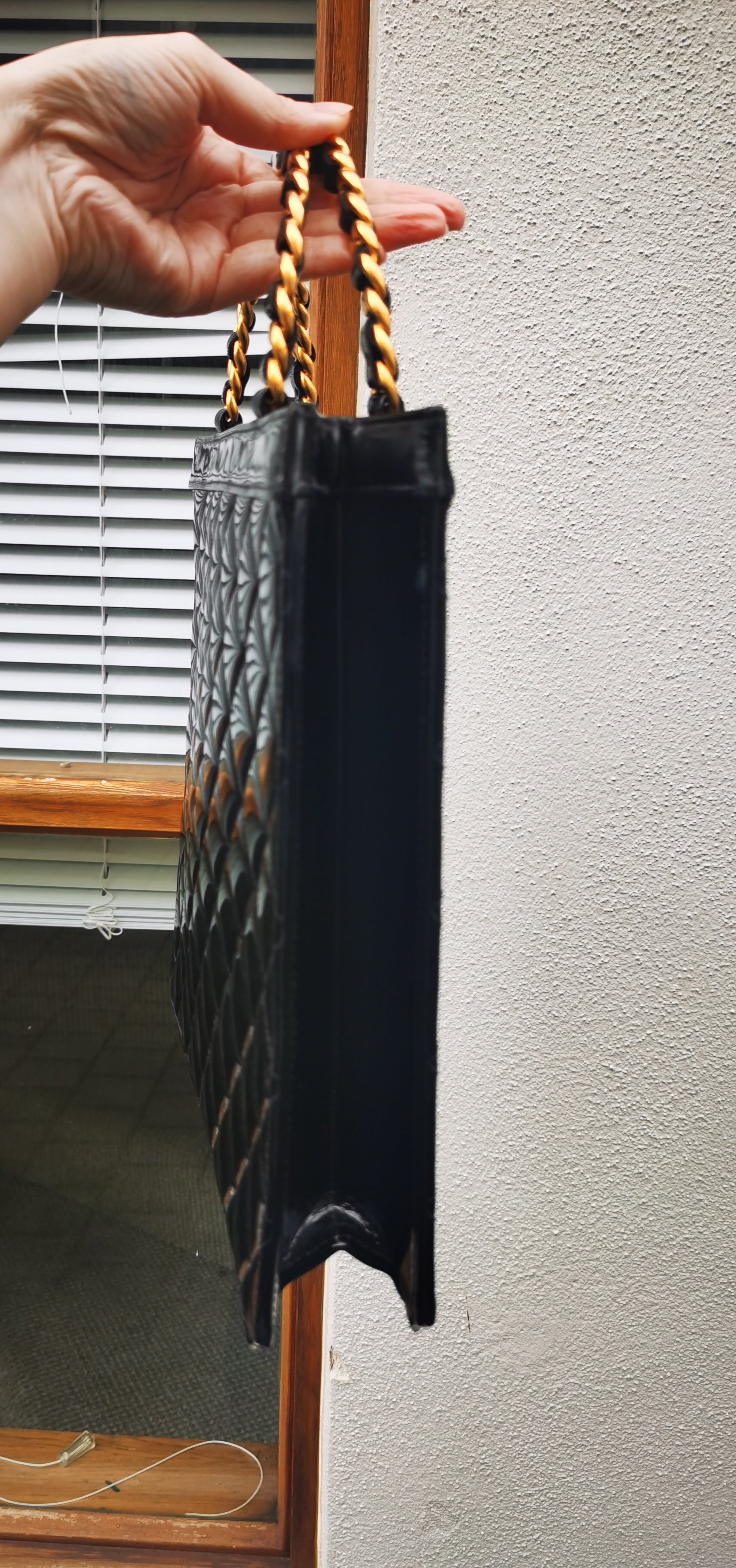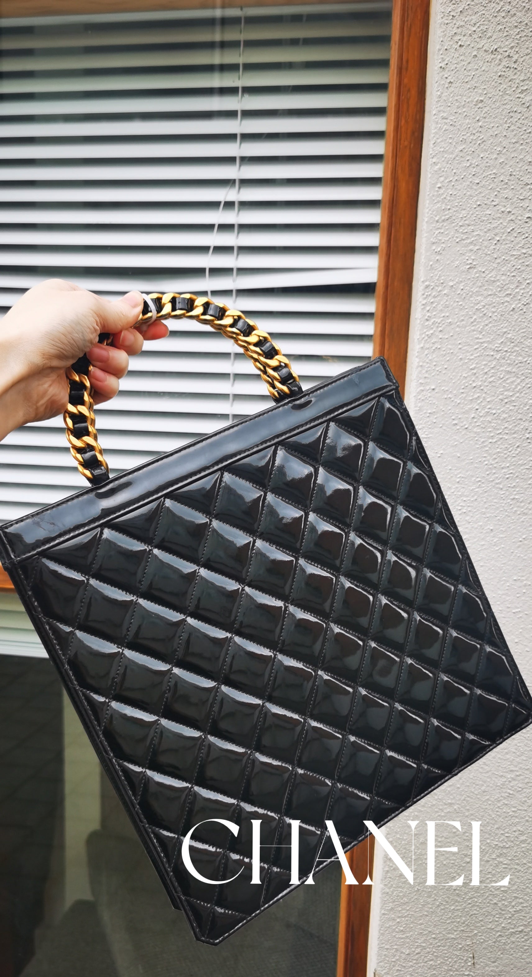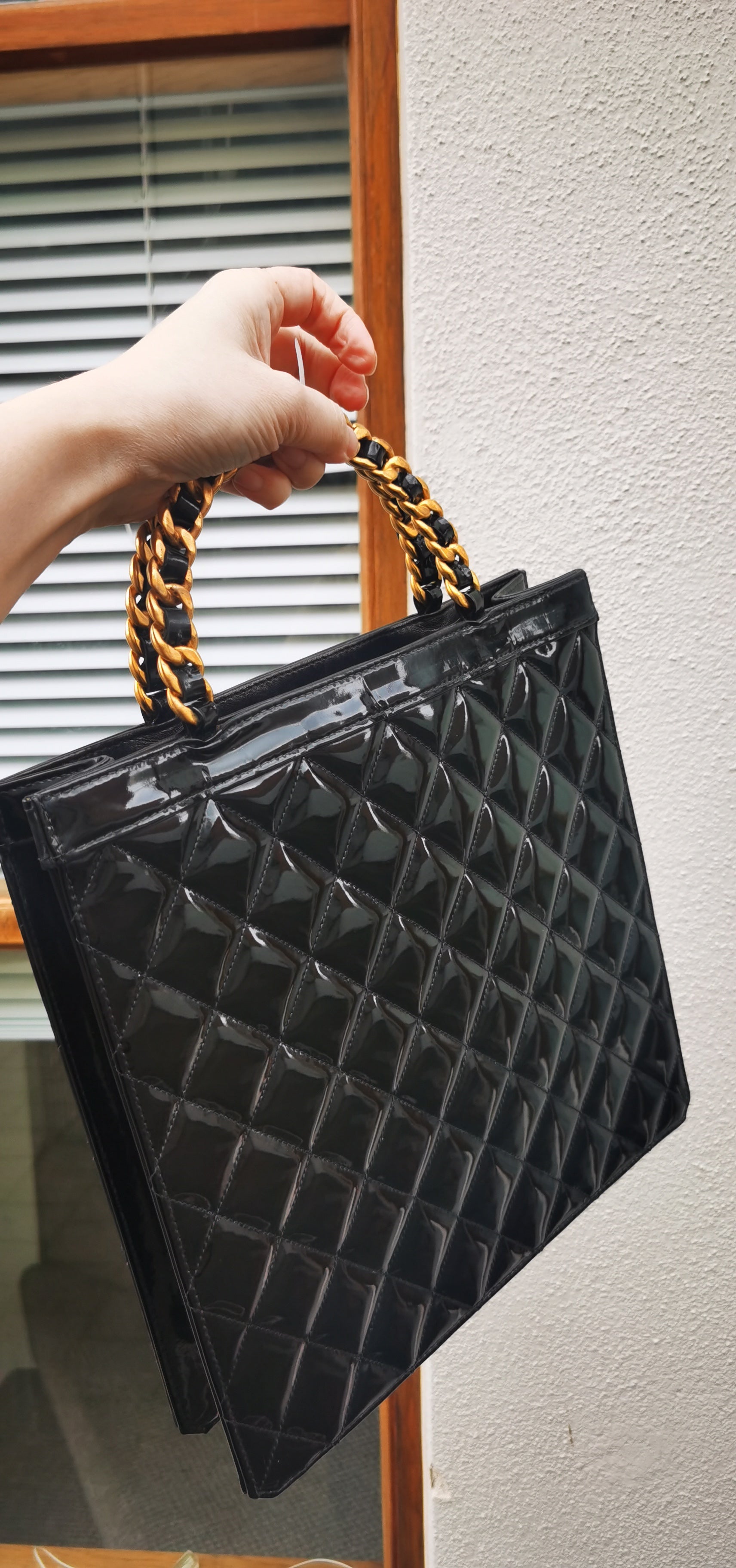 Rare vintage Chanel black patent leather handbag with 24K gold plated hardware, minorsigns and marks overall leather part and hardware .Overall this item is in excellent vintage condition.