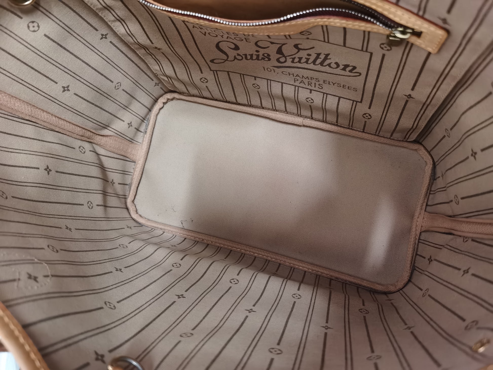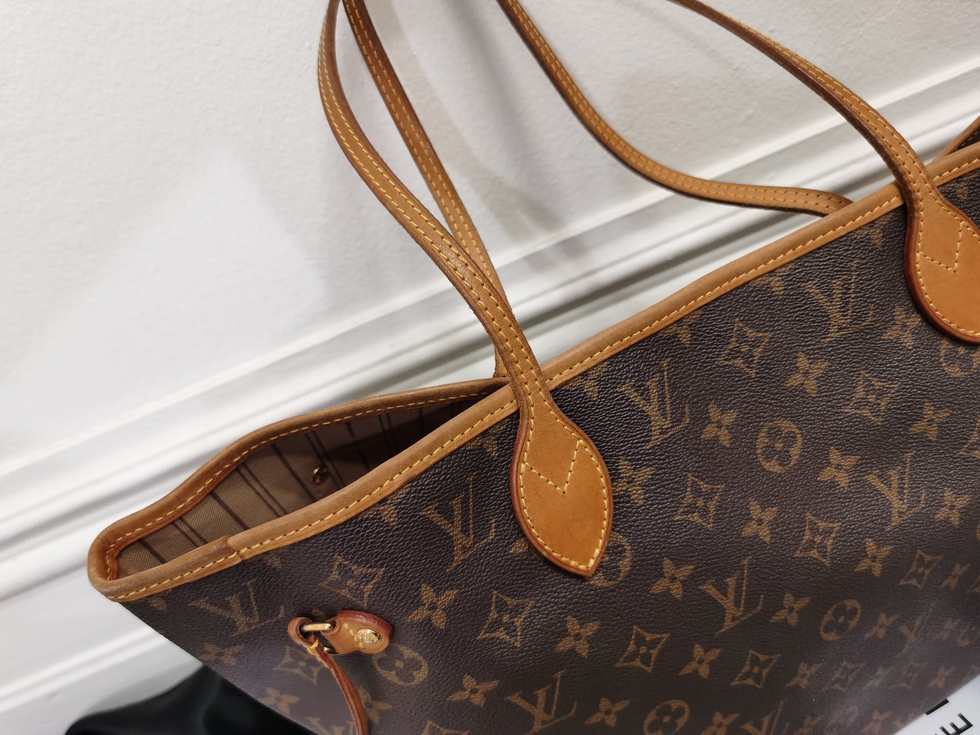 Classic Louis Vuitton monogram neverfull MM shoulder bag, retail current price $2940Aud. In great vintage condition; marks and signs of wear on outer and on handles, scratches on hardware. Inner thread dirt and pen marks. Tanned leather deterioration vrack is there. Inside small pocket peeling.