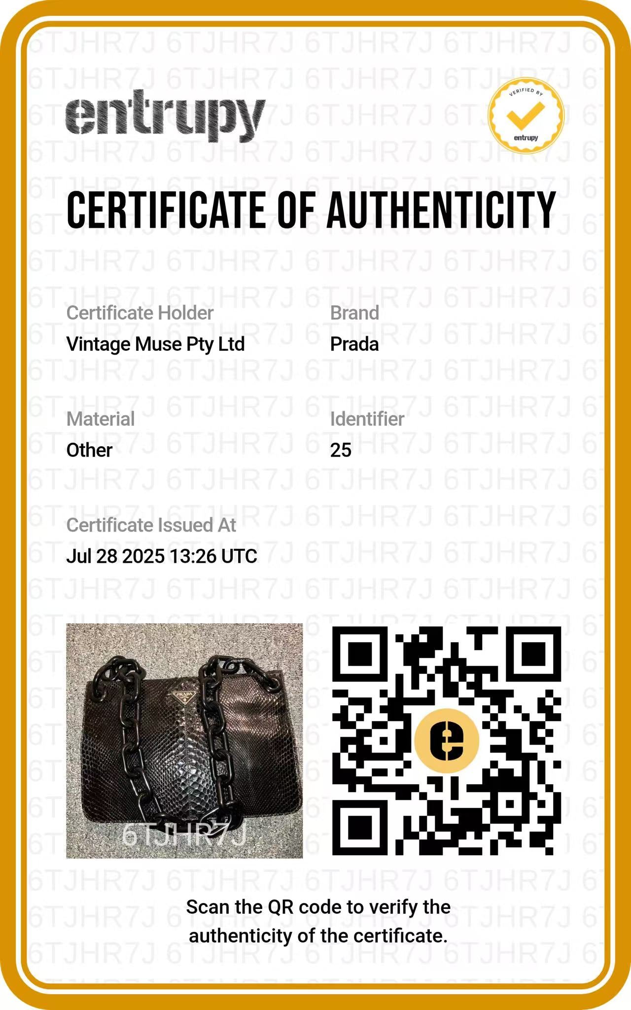A rare and elegant vintage Prada shoulder bag made from authentic python leather. The exterior shows overall slight dirt marks and rubbing, with some fading along the edges. As is common with exotic leathers, the python scales naturally lift over time. Despite this, the bag remains clean and retains its luxurious appearance. Metal hardware displays scratches and areas of corrosion due to age, but all parts function properly.These subtle imperfections add character and authenticity to this unique piece.