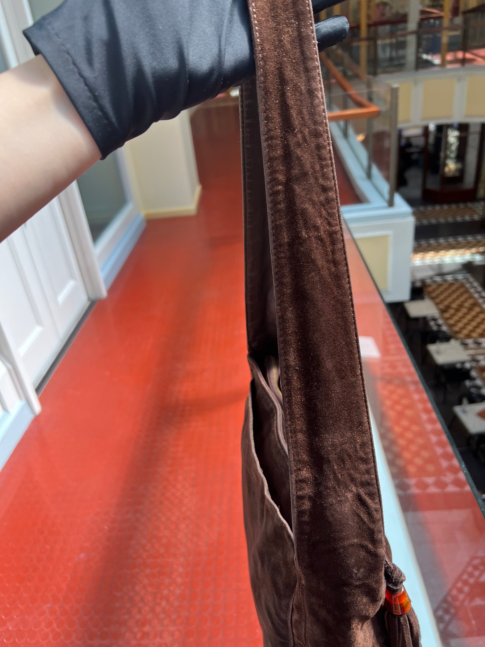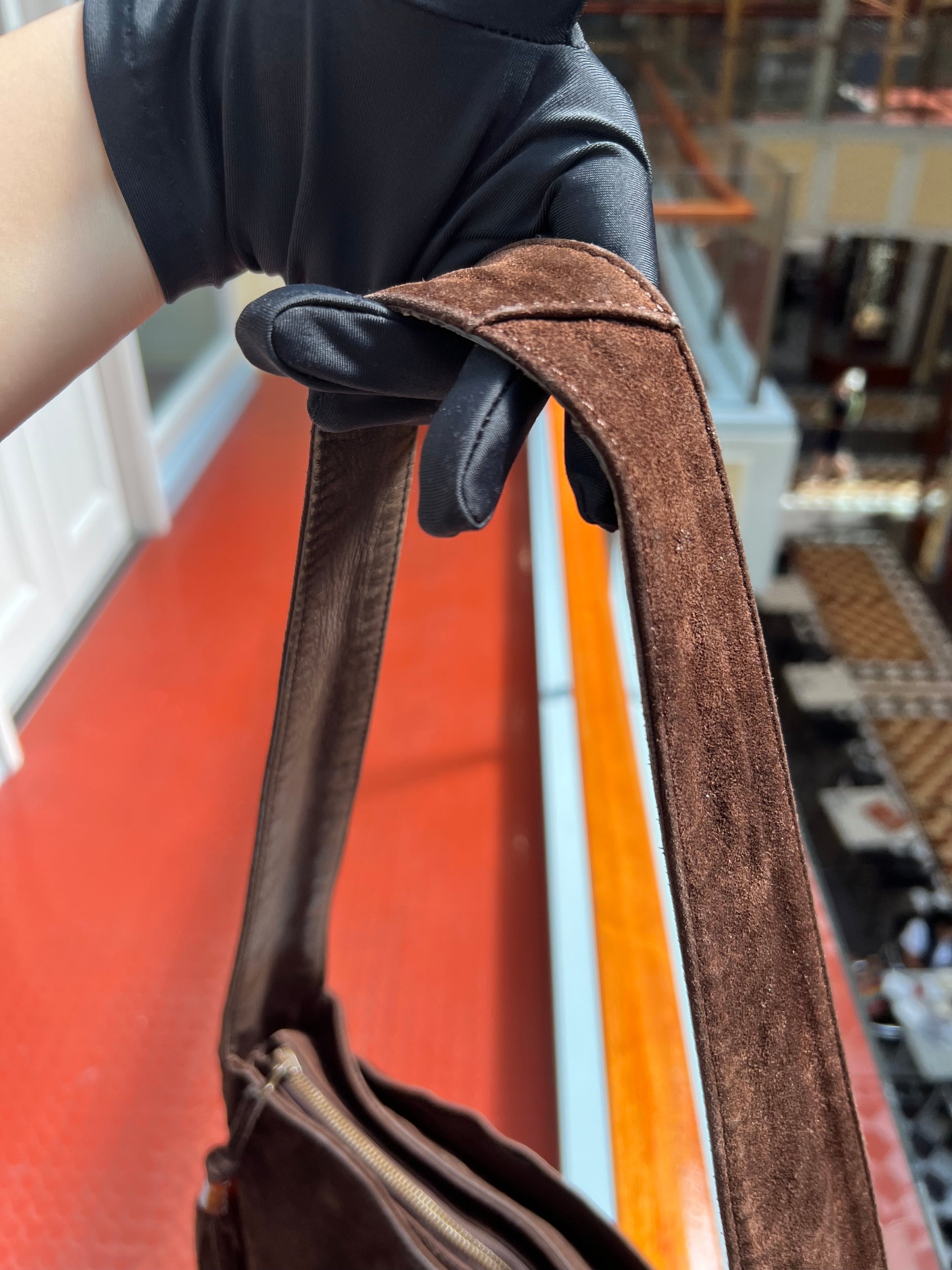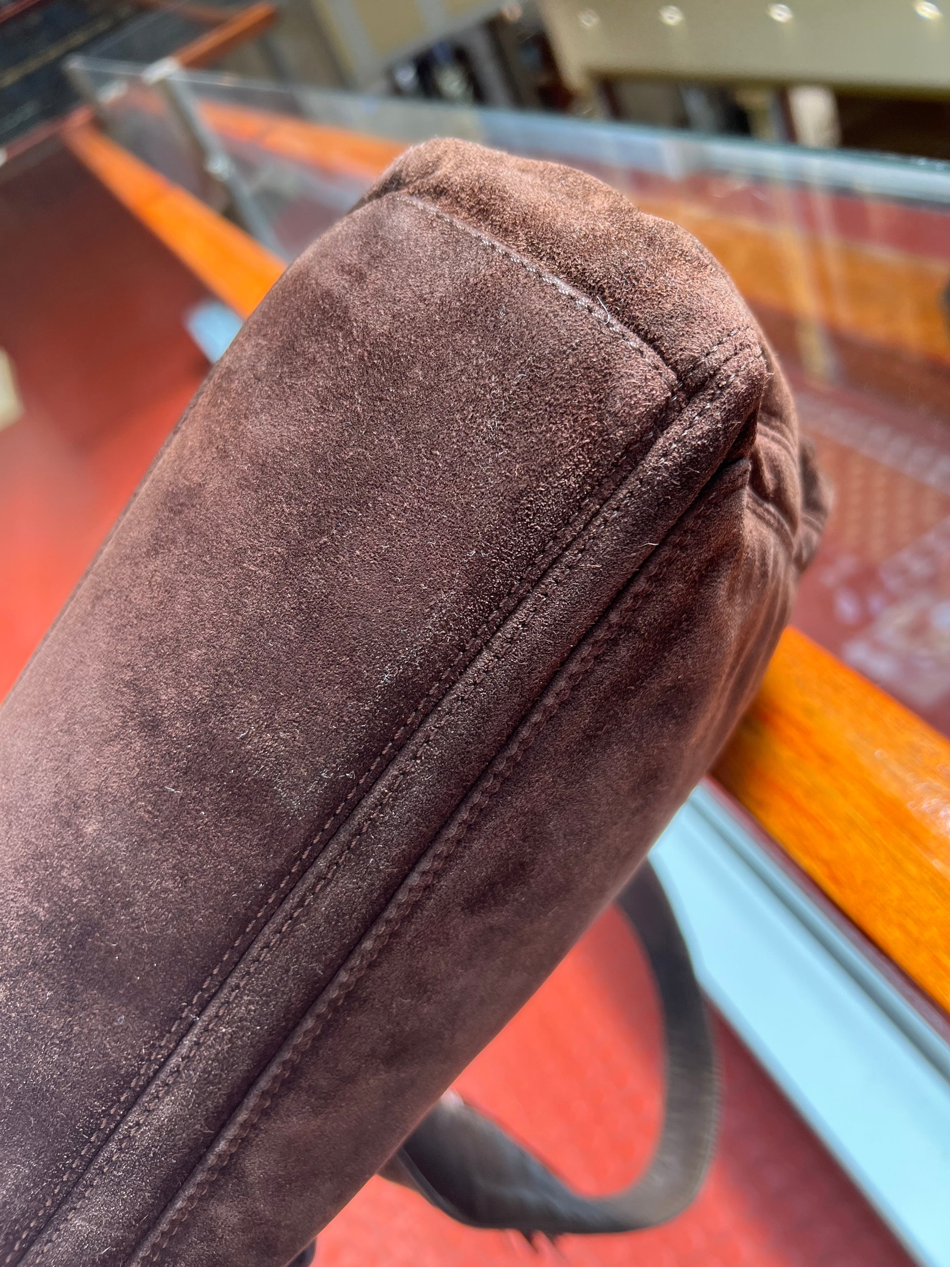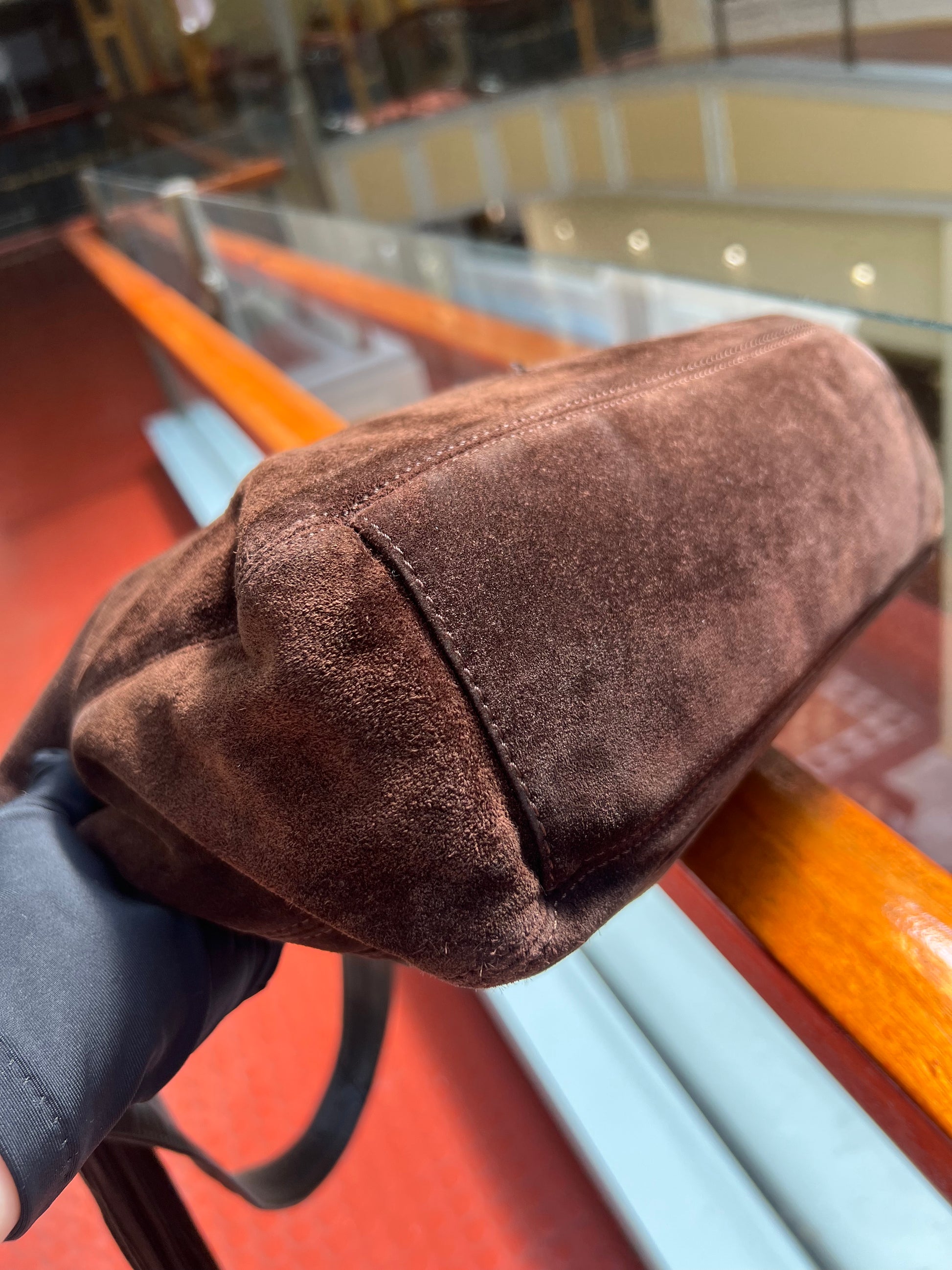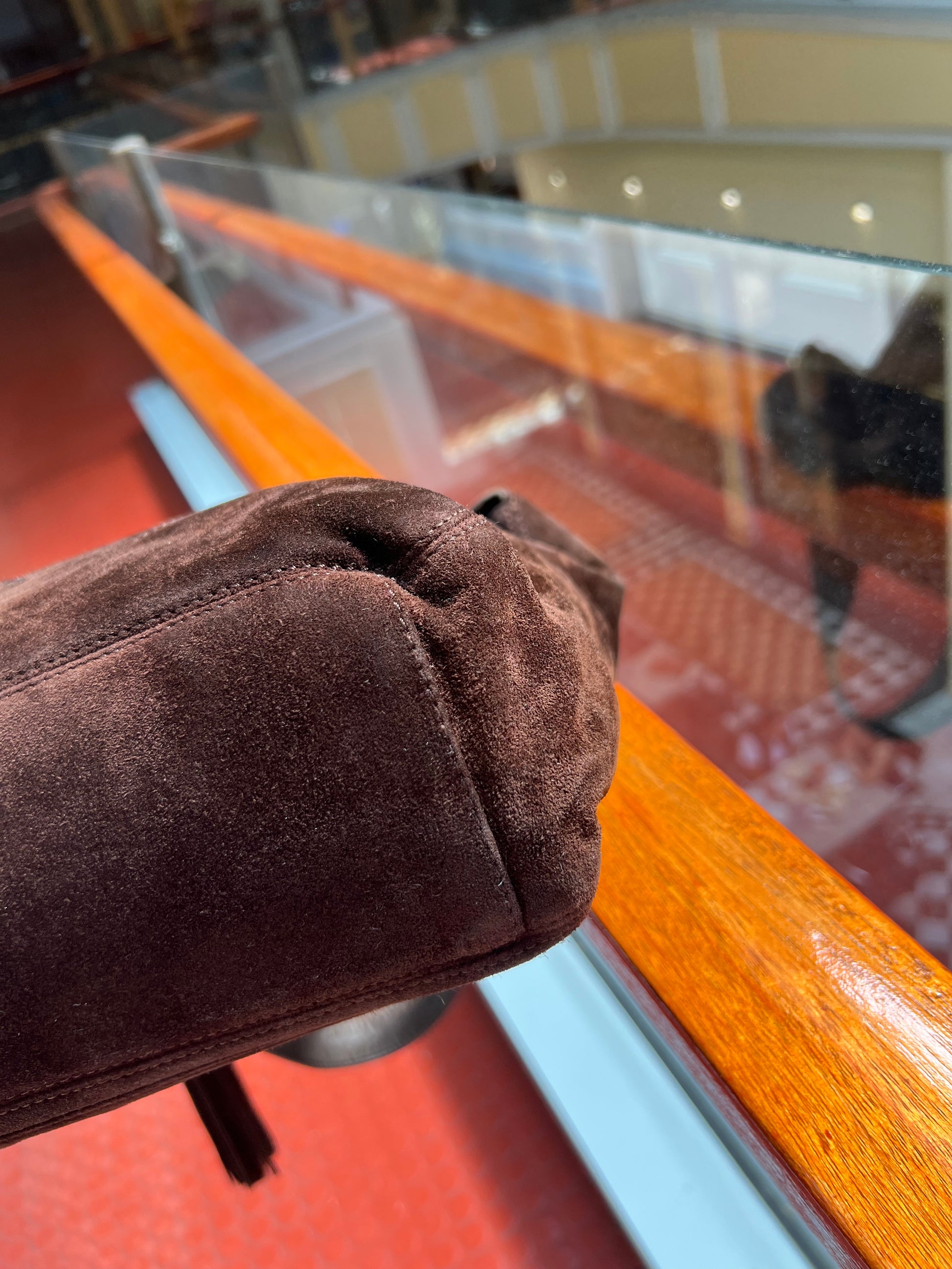 Beautiful vintage Chanel bag (circa. 1996-1997 )crafted from brown suede with leather on inner handles for comfort. In good condition; shape slightly altered, signs of wear on suede outer, including edges and on bottom, tarnish on bottom feet, signs of wear inner.