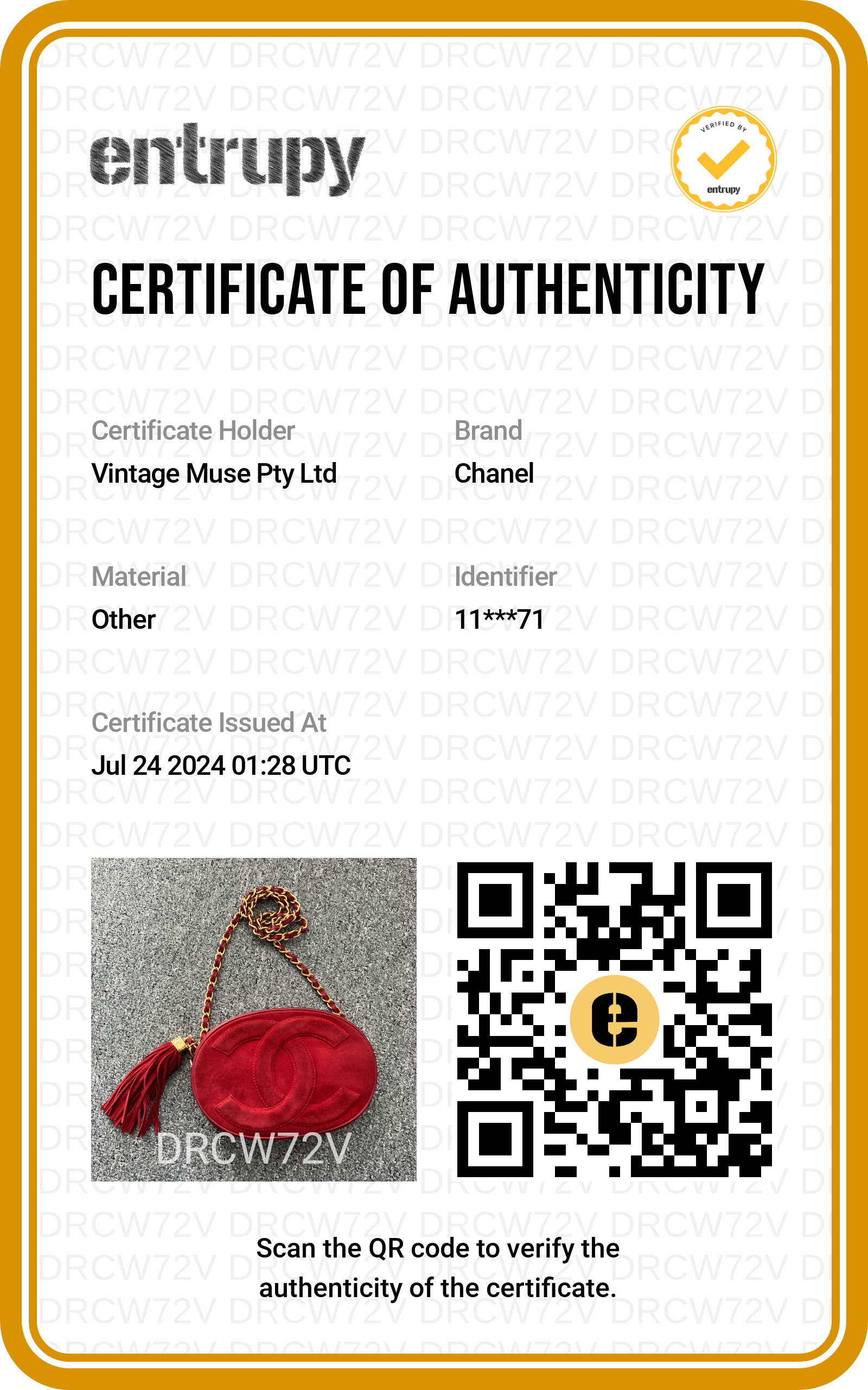 - Entrupy authenticity certificate
