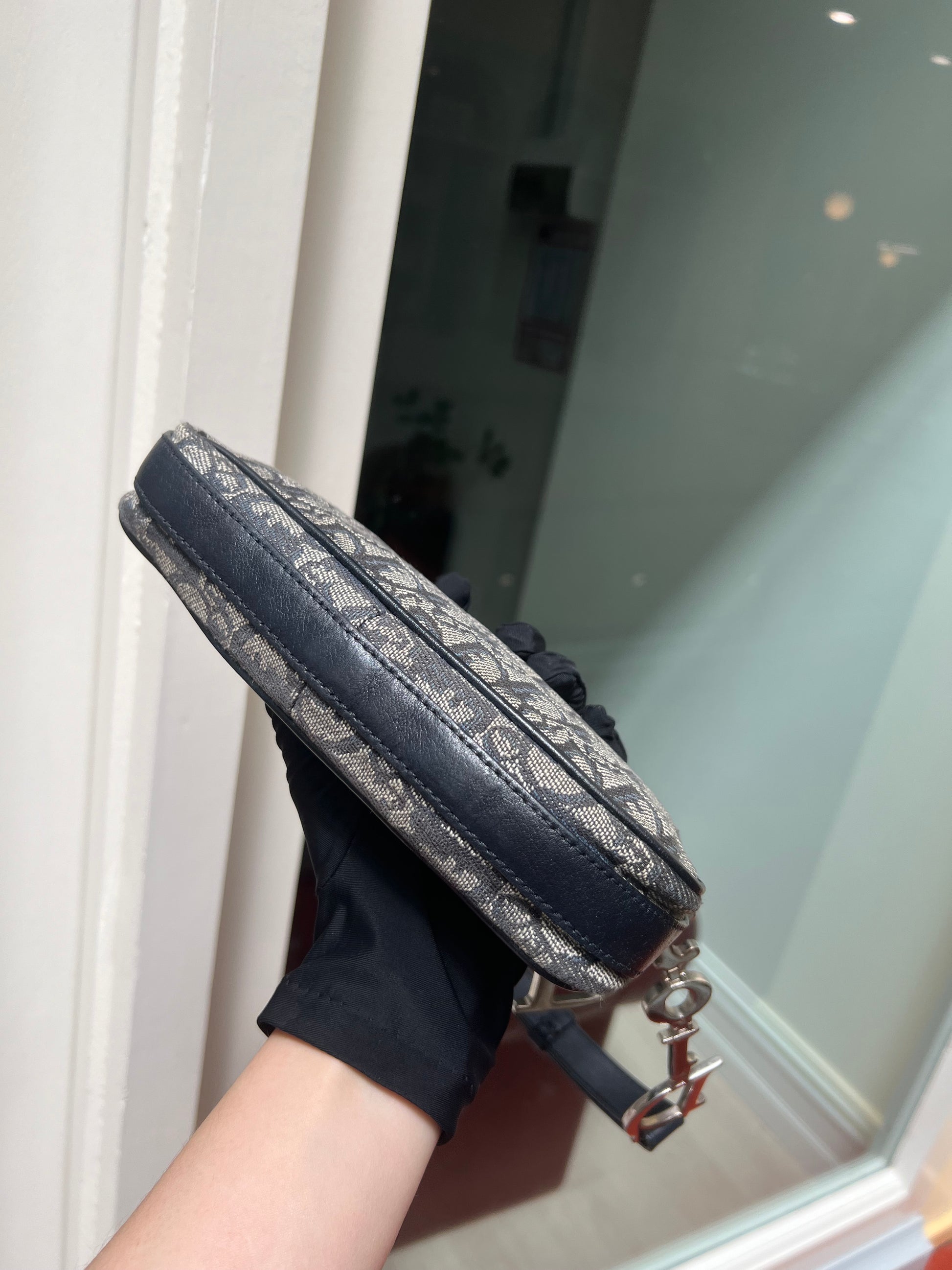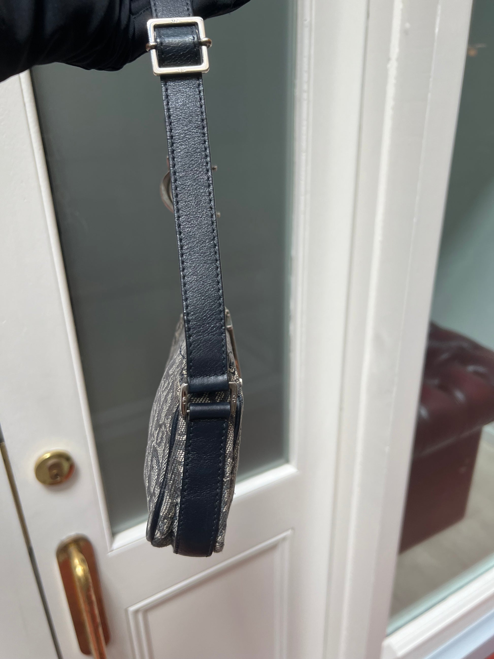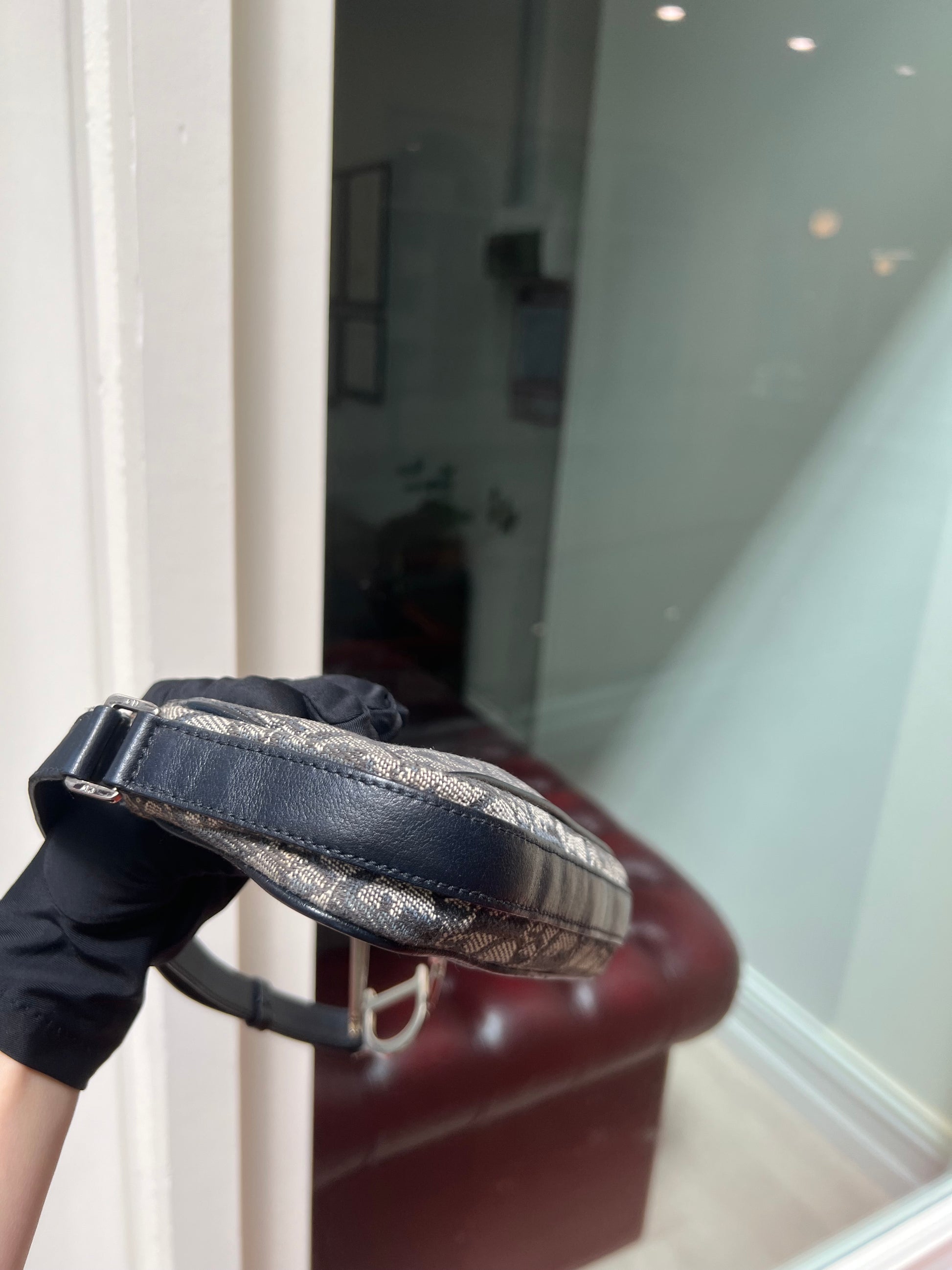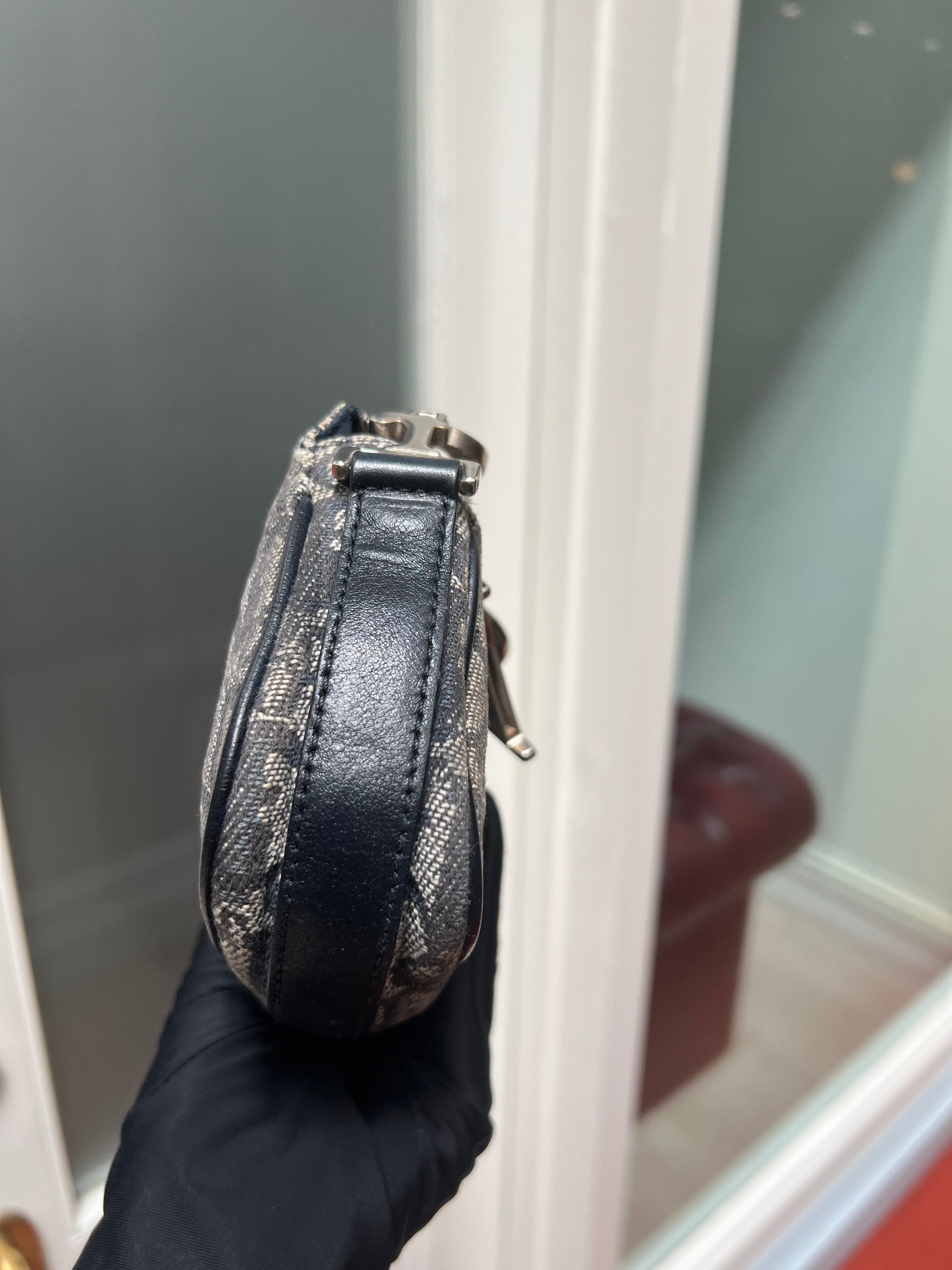 The Christian Dior Trotter leather shoulder bag is a distinctive Y2K aesthetic with its monogram logo, designed by the renowned John Galliano. The combination of black, navy blue, and gray colors enhances its rare vintage appeal. While the canvas exhibits a subtle fading, it's noteworthy that this doesn't detract significantly. Additionally, the minor rubbing at the closure's end doesn't compromise the bag's overall condition. This piece not only carries a unique historical charm but also maintains its authenticity.