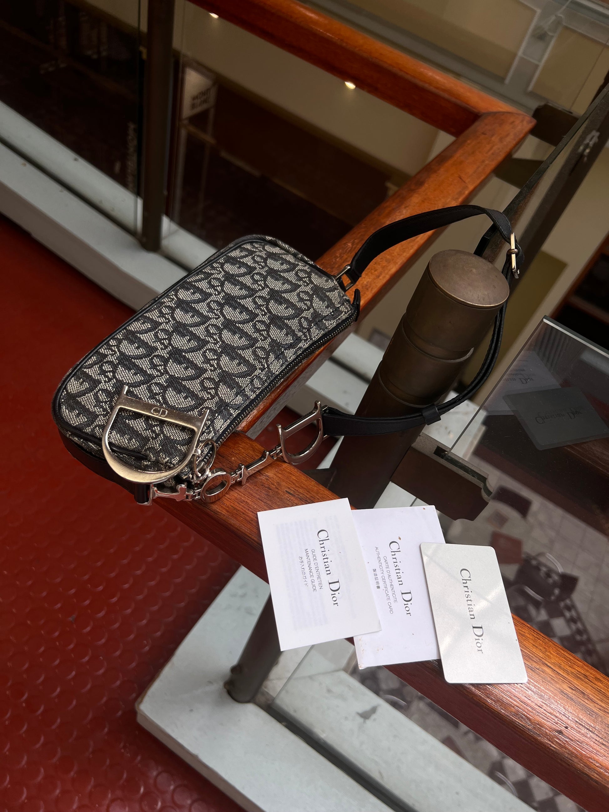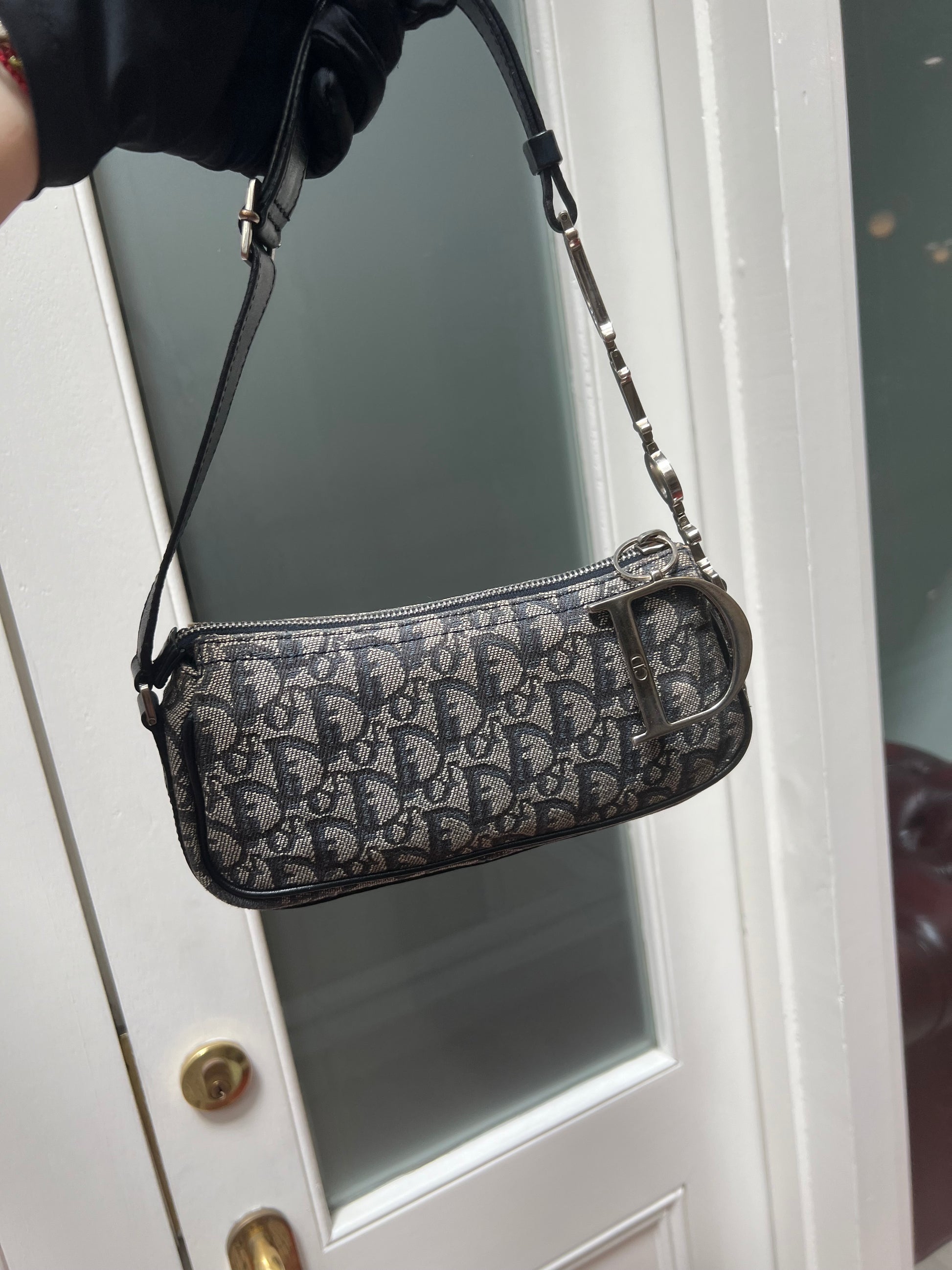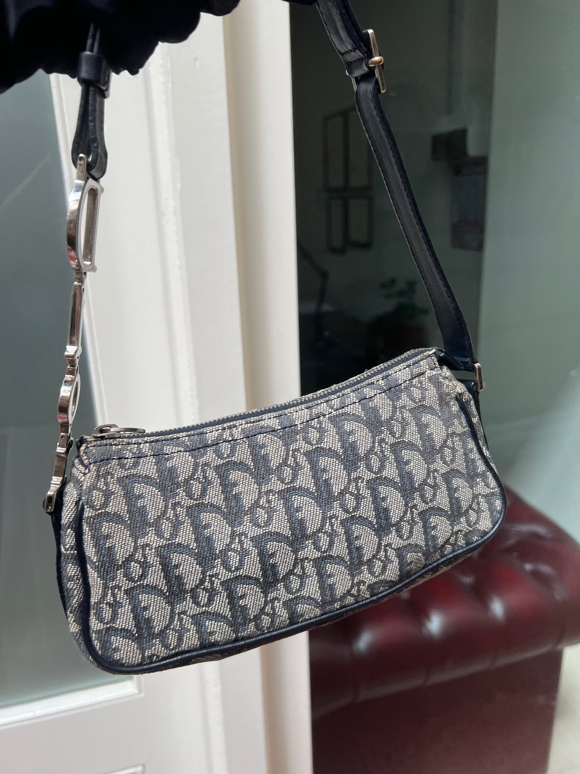 The Christian Dior Trotter leather shoulder bag is a distinctive Y2K aesthetic with its monogram logo, designed by the renowned John Galliano. The combination of black, navy blue, and gray colors enhances its rare vintage appeal. While the canvas exhibits a subtle fading, it's noteworthy that this doesn't detract significantly. Additionally, the minor rubbing at the closure's end doesn't compromise the bag's overall condition. This piece not only carries a unique historical charm but also maintains its authenticity.