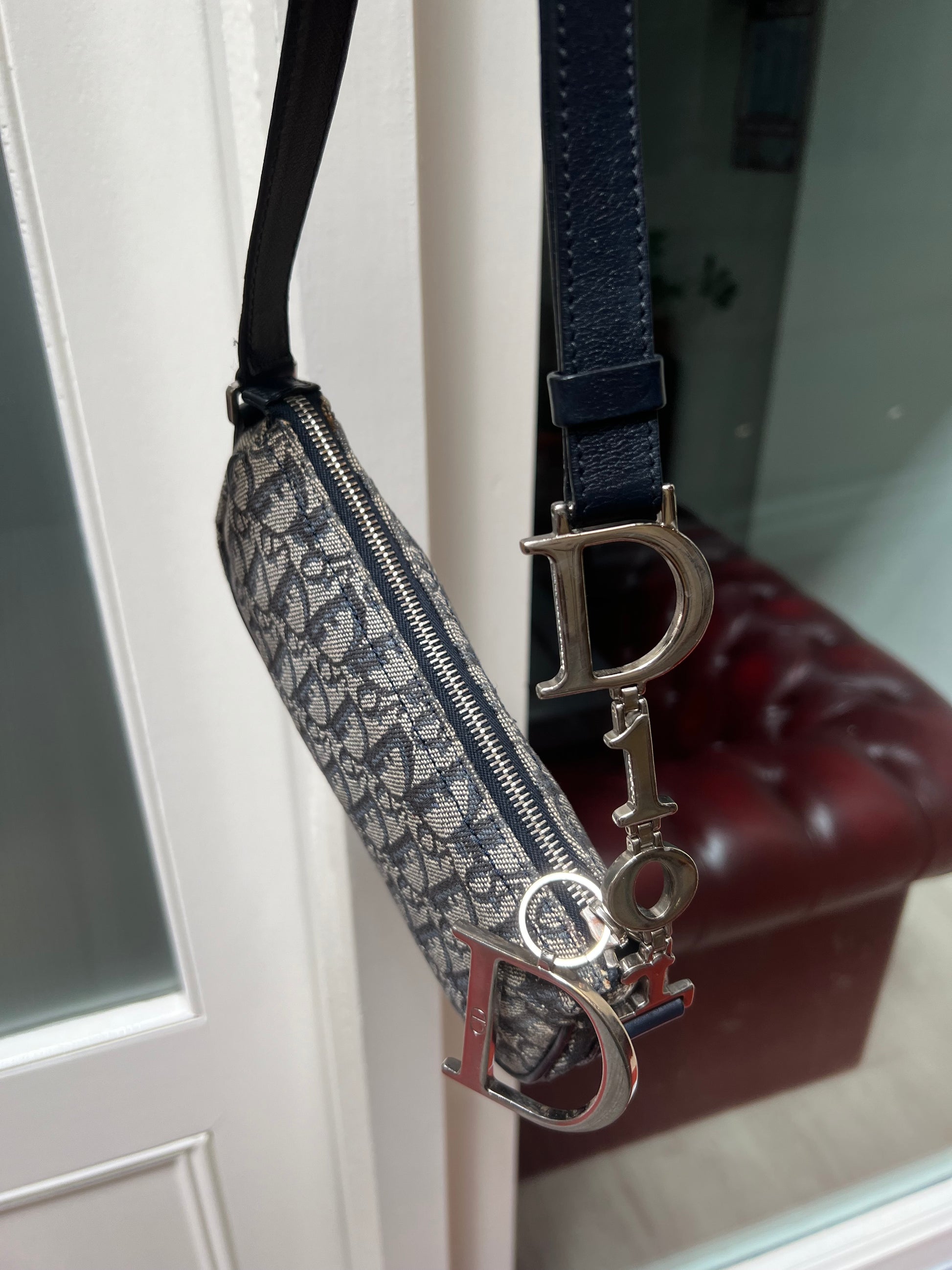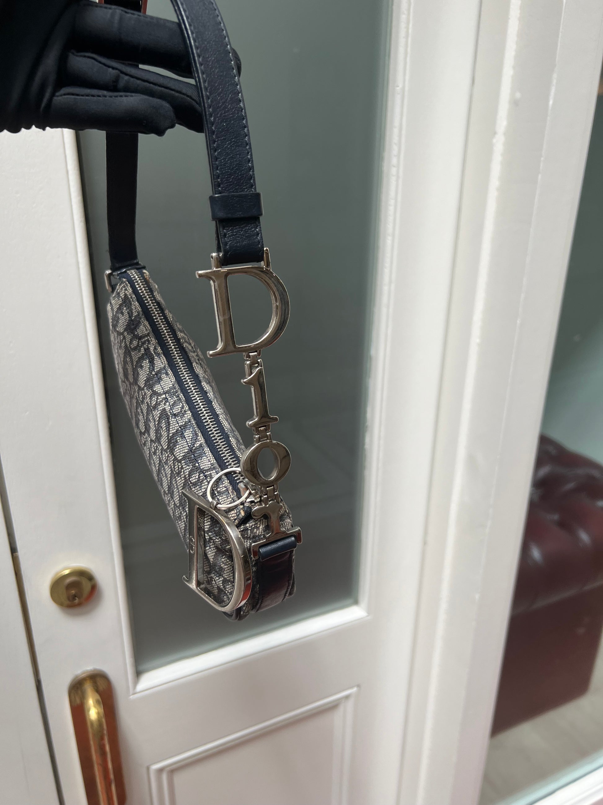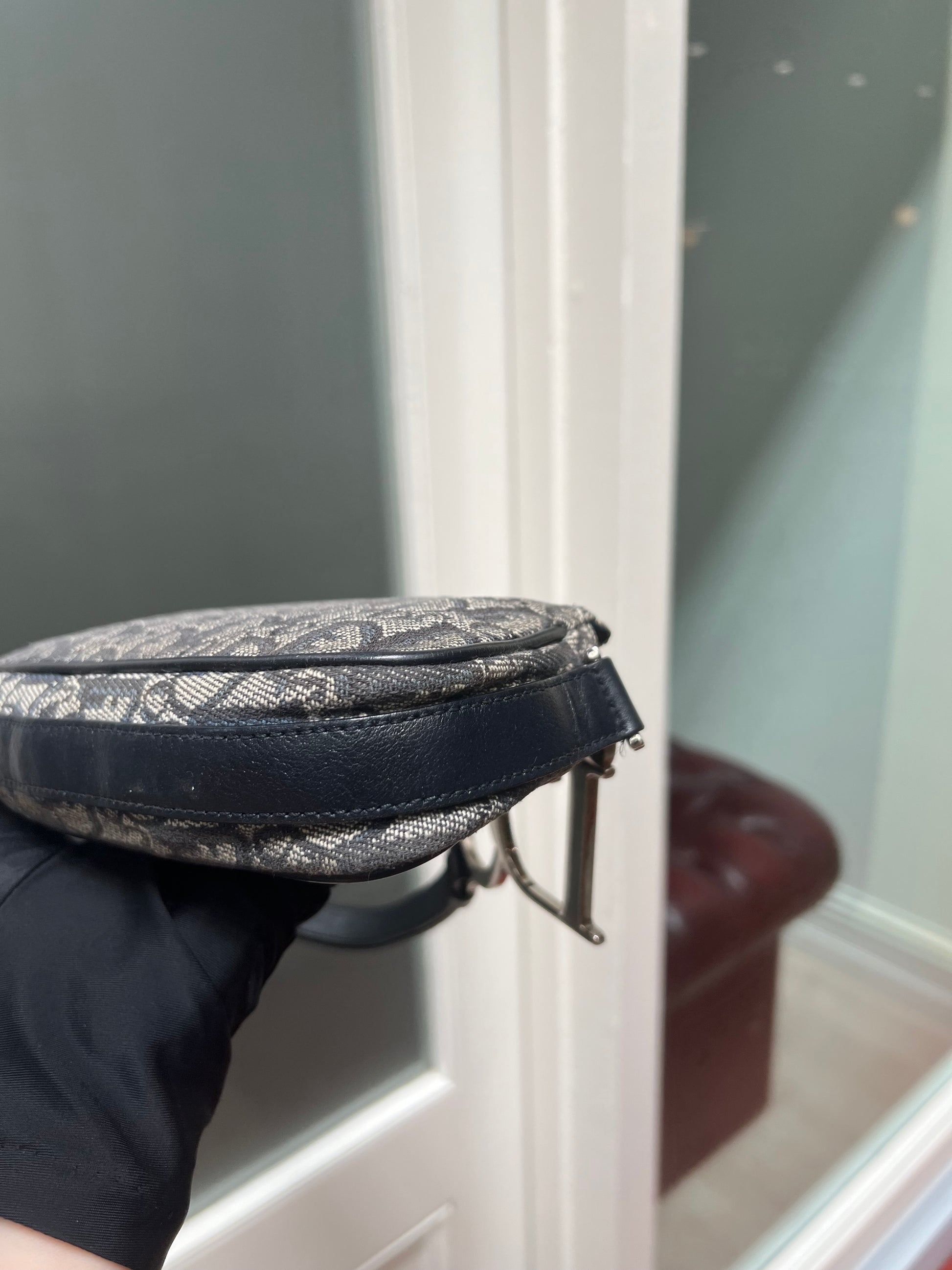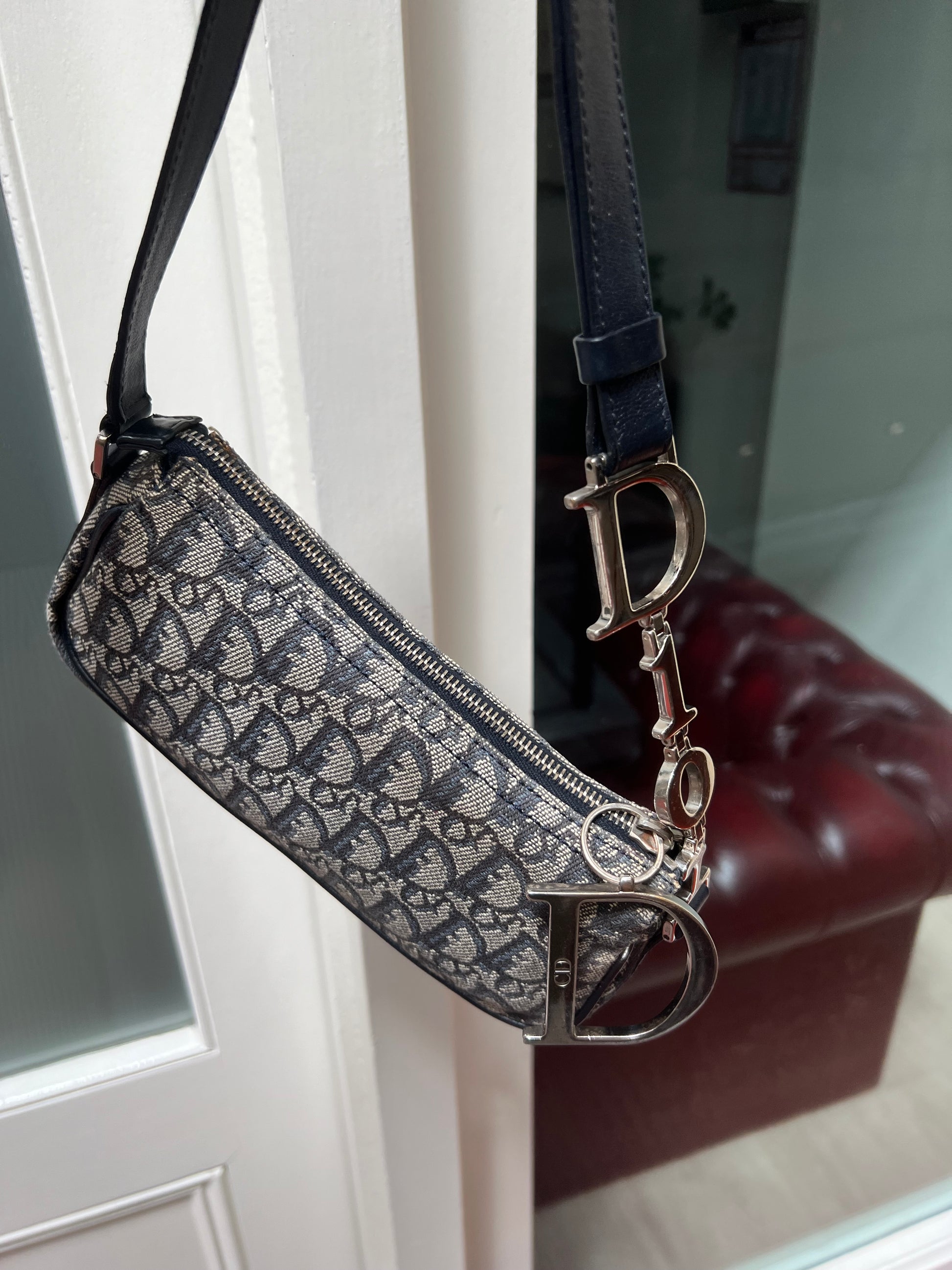 The Christian Dior Trotter leather shoulder bag is a distinctive Y2K aesthetic with its monogram logo, designed by the renowned John Galliano. The combination of black, navy blue, and gray colors enhances its rare vintage appeal. While the canvas exhibits a subtle fading, it's noteworthy that this doesn't detract significantly. Additionally, the minor rubbing at the closure's end doesn't compromise the bag's overall condition. This piece not only carries a unique historical charm but also maintains its authenticity.
