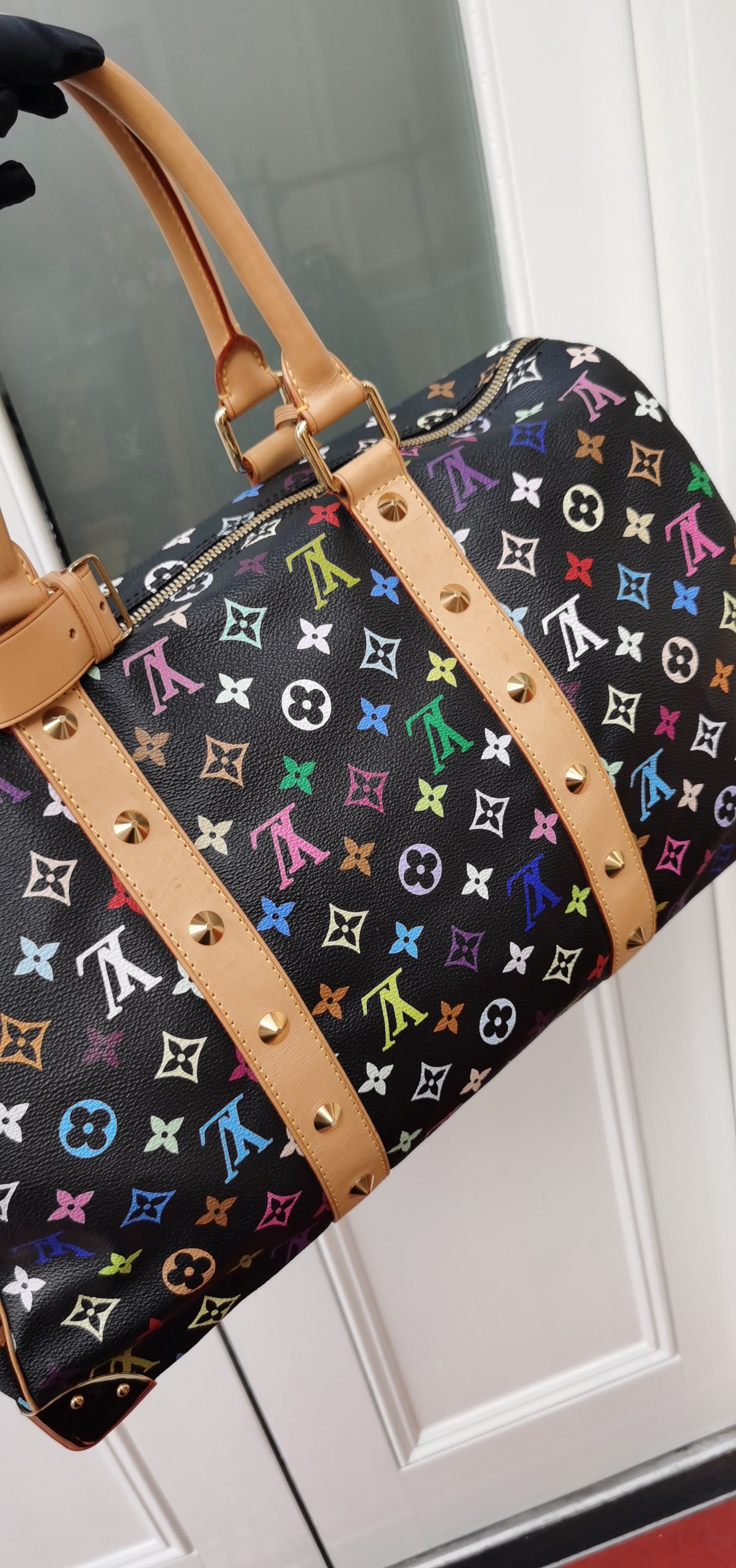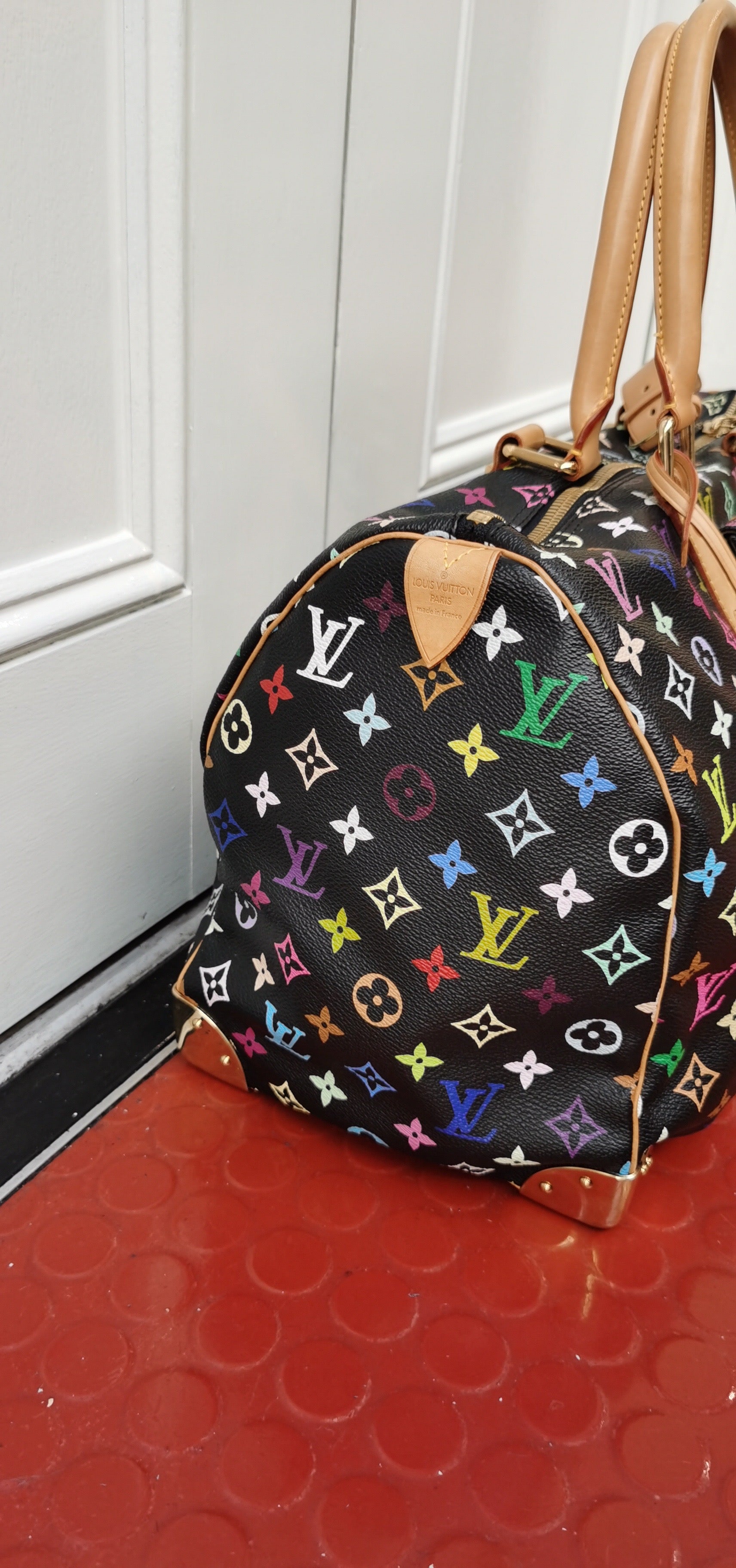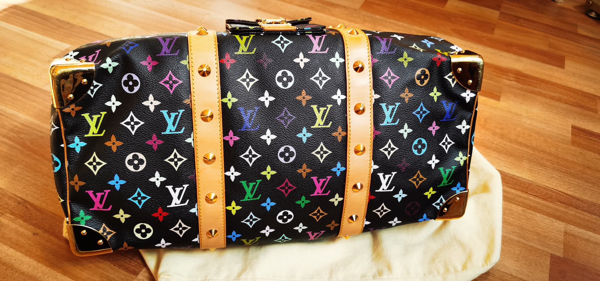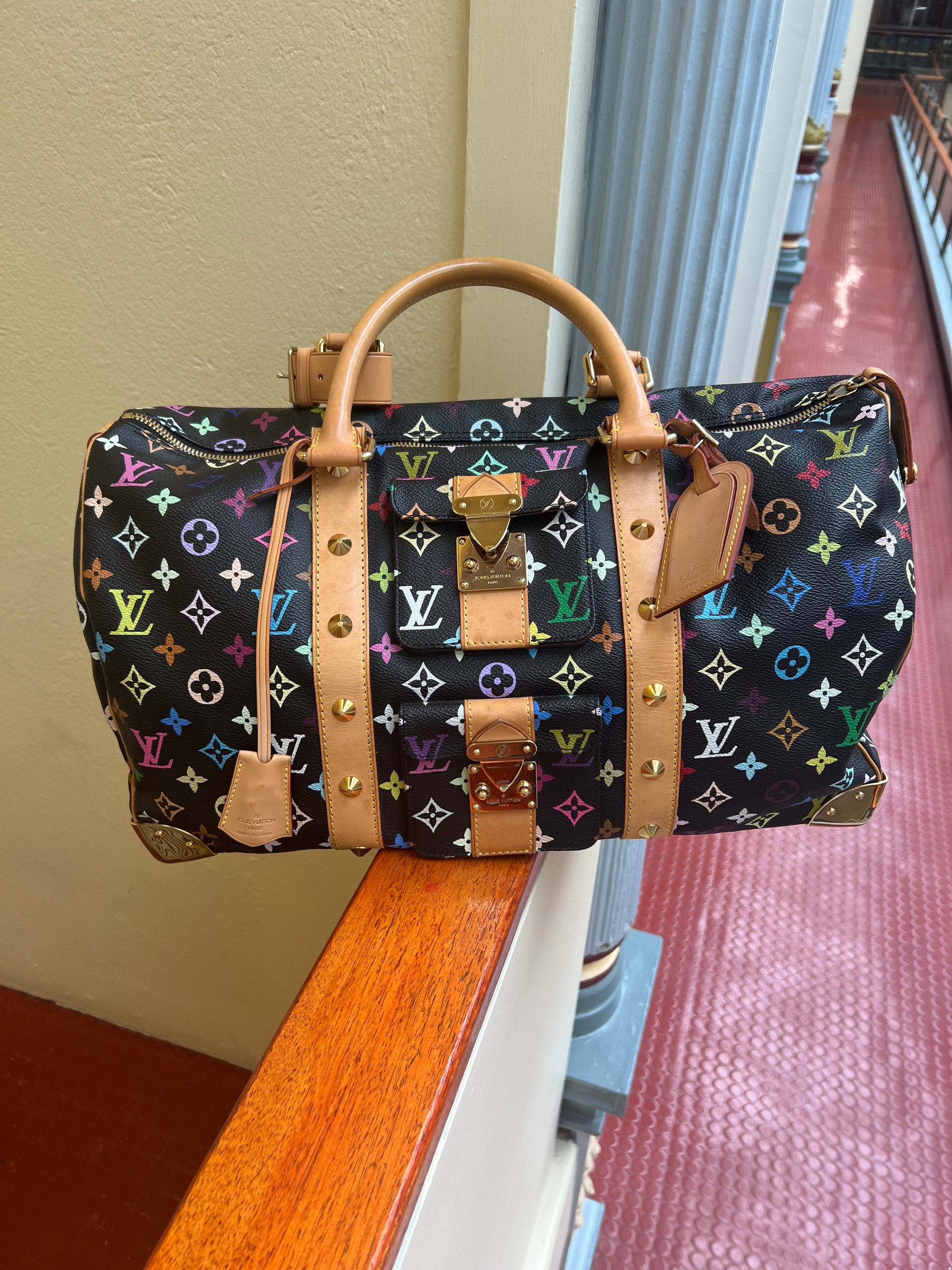 Louis Vuitton x Murakami Limited Edition Monogram Multicolor Keepall 45 Bag. This incredibly rare and highly sought after piece of Louis Vuitton history became a worldwide phenomenon when Japanese artist Takashi Murakami teamed up with the Louis Vuitton brand and creative Director Marc Jacobs for a range of exclusive collections. On the Spring/ Summer 2003 runway, the multicolor line where Murakami re-imagined the classic monogram logo with a variety of bright colors in his whimsical Japanese designs became an instant cult classic favored by celebrities all over the world.