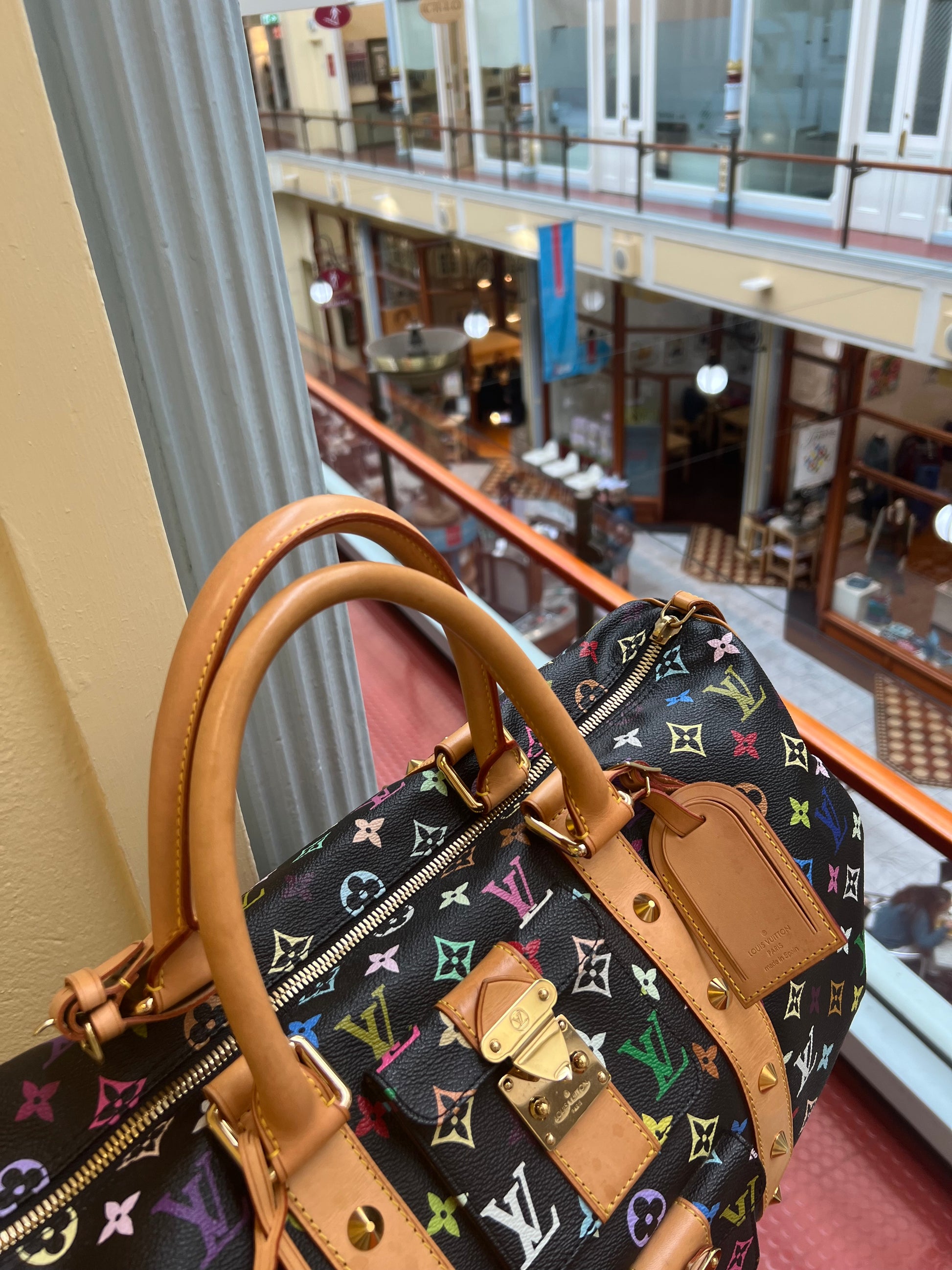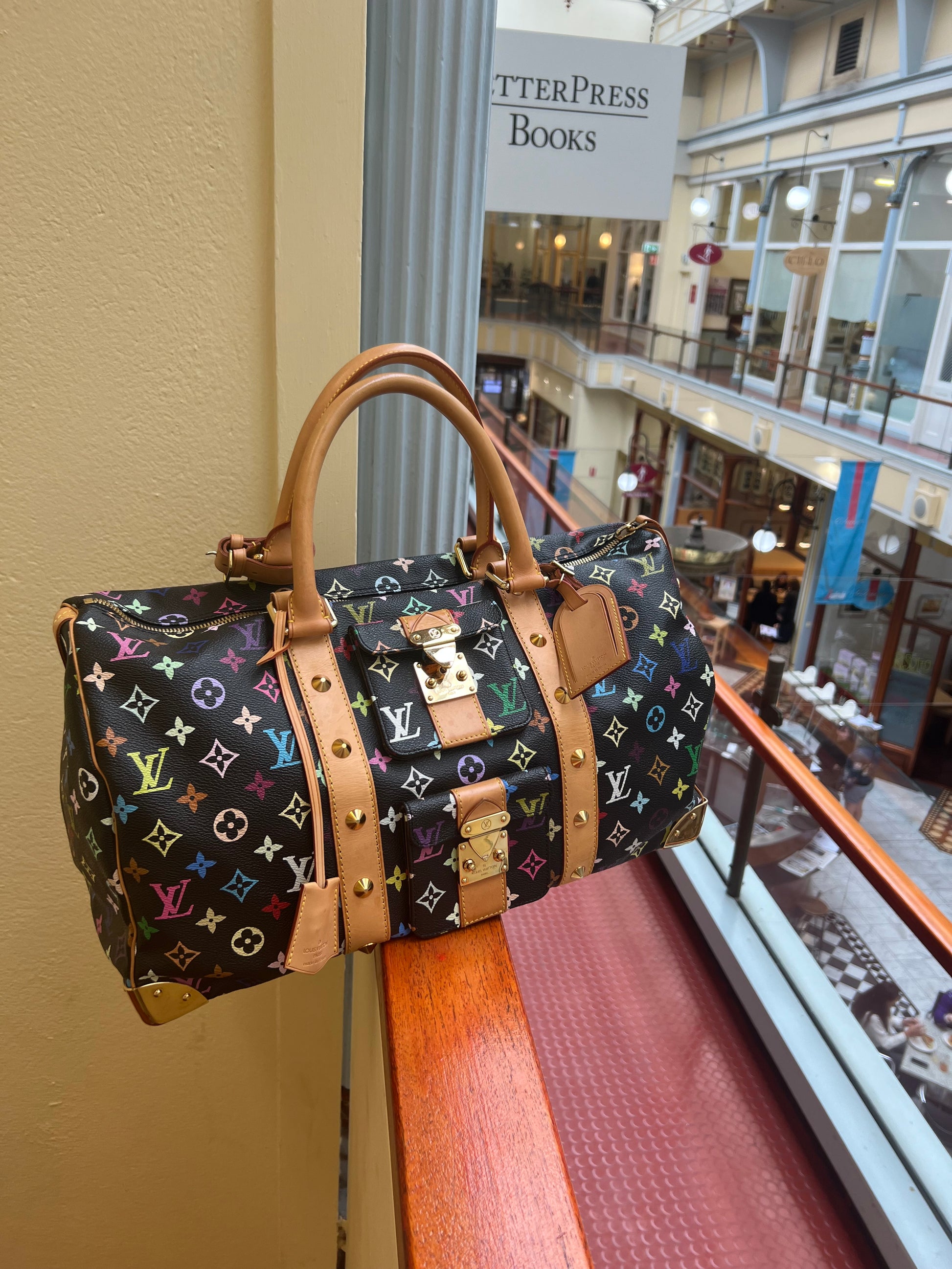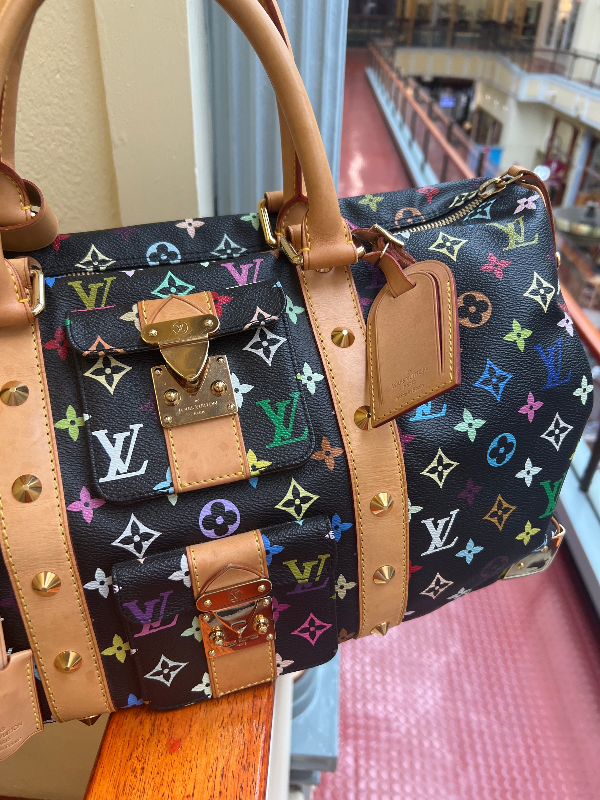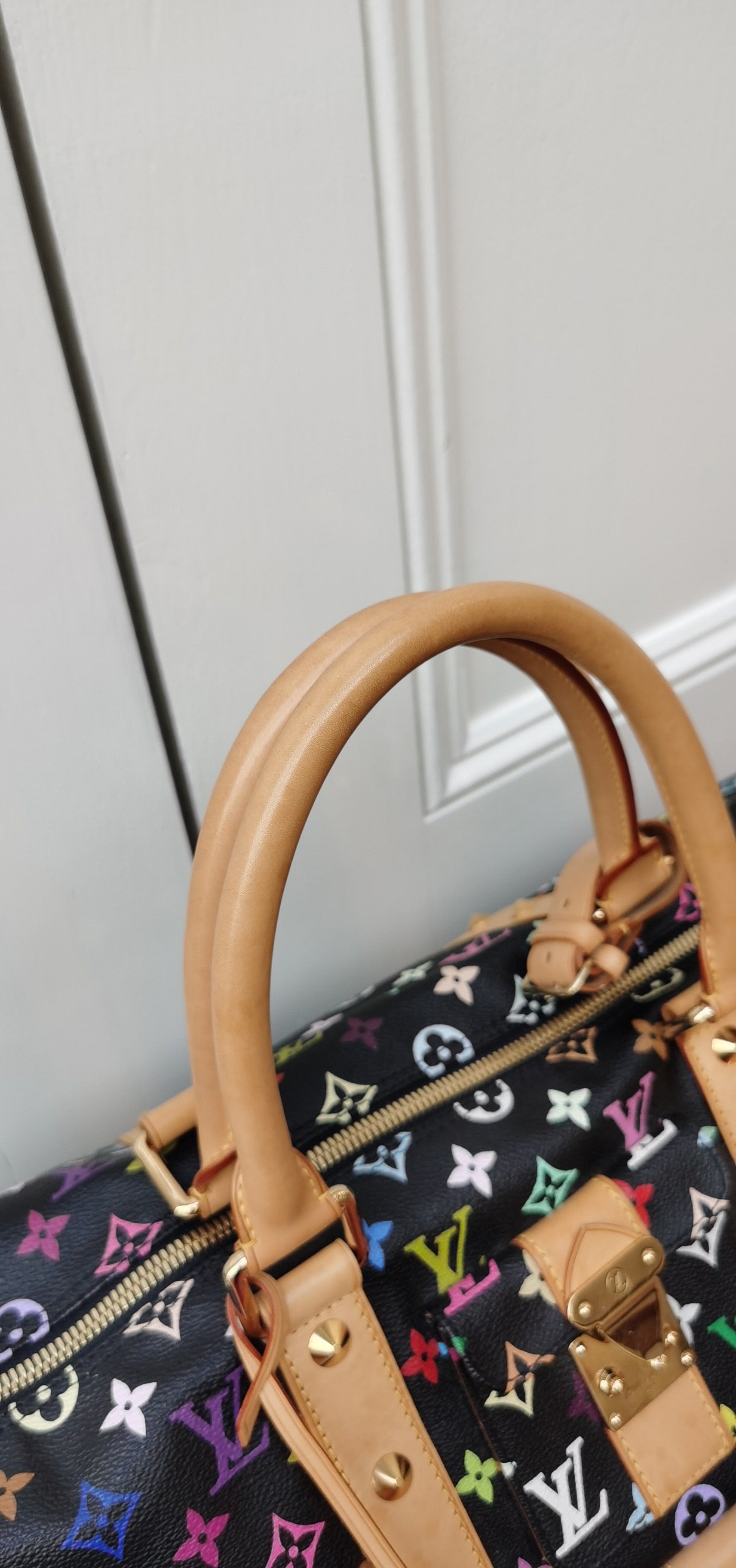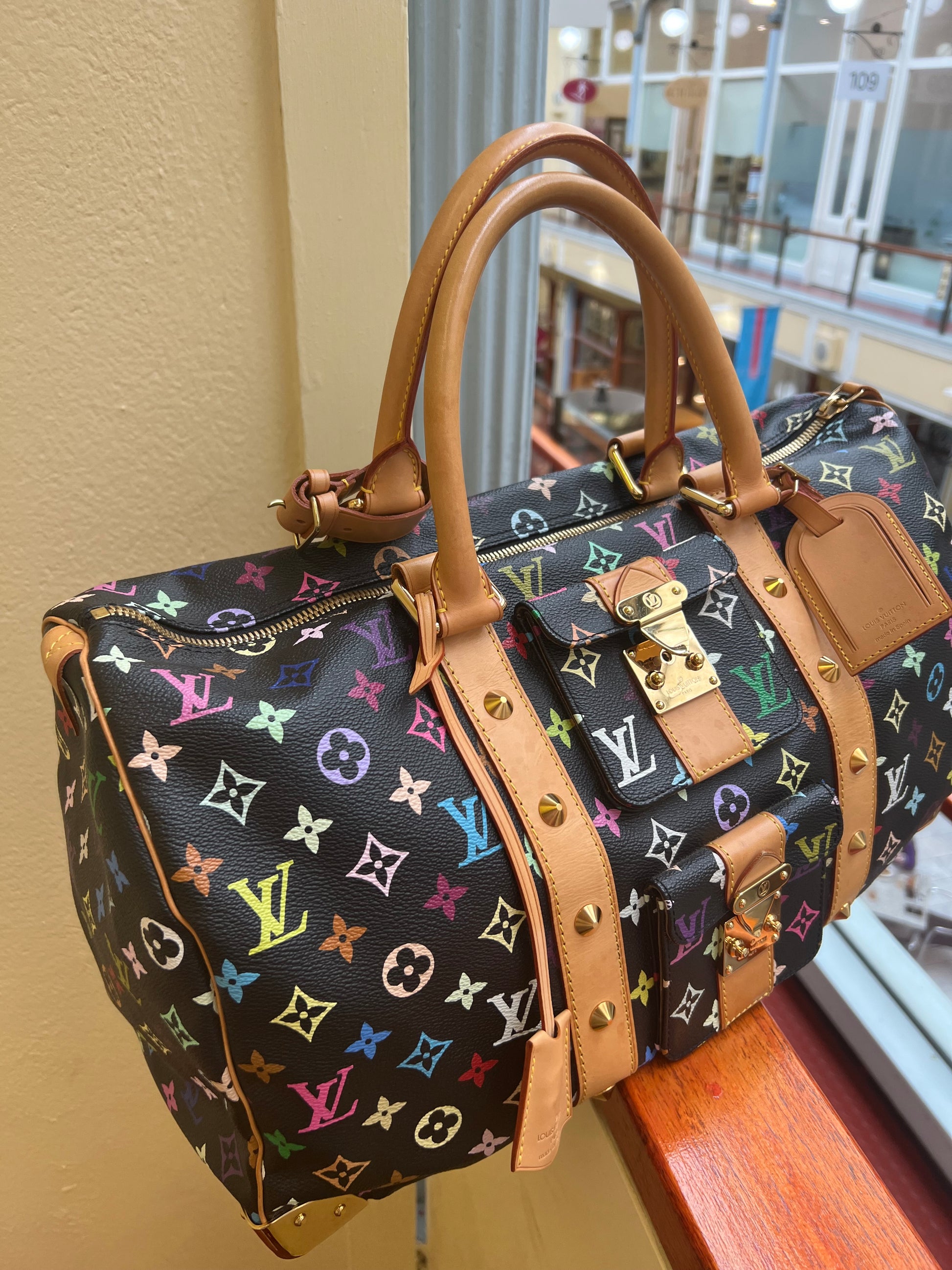 Louis Vuitton x Murakami Limited Edition Monogram Multicolor Keepall 45 Bag. This incredibly rare and highly sought after piece of Louis Vuitton history became a worldwide phenomenon when Japanese artist Takashi Murakami teamed up with the Louis Vuitton brand and creative Director Marc Jacobs for a range of exclusive collections. On the Spring/ Summer 2003 runway, the multicolor line where Murakami re-imagined the classic monogram logo with a variety of bright colors in his whimsical Japanese designs became an instant cult classic favored by celebrities all over the world.