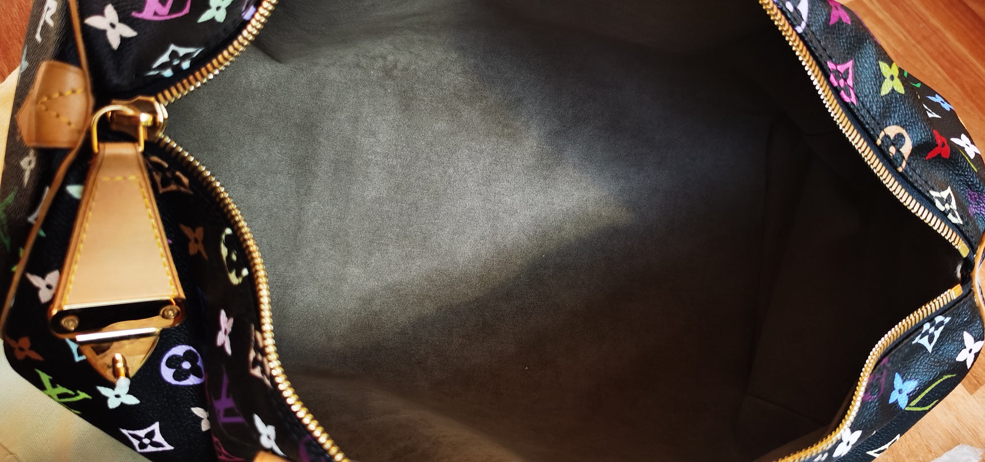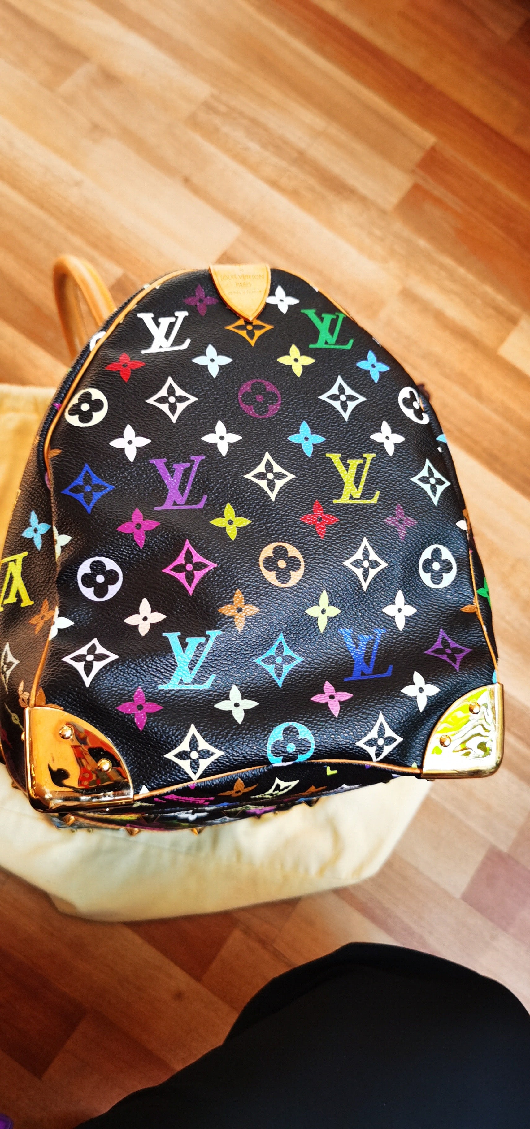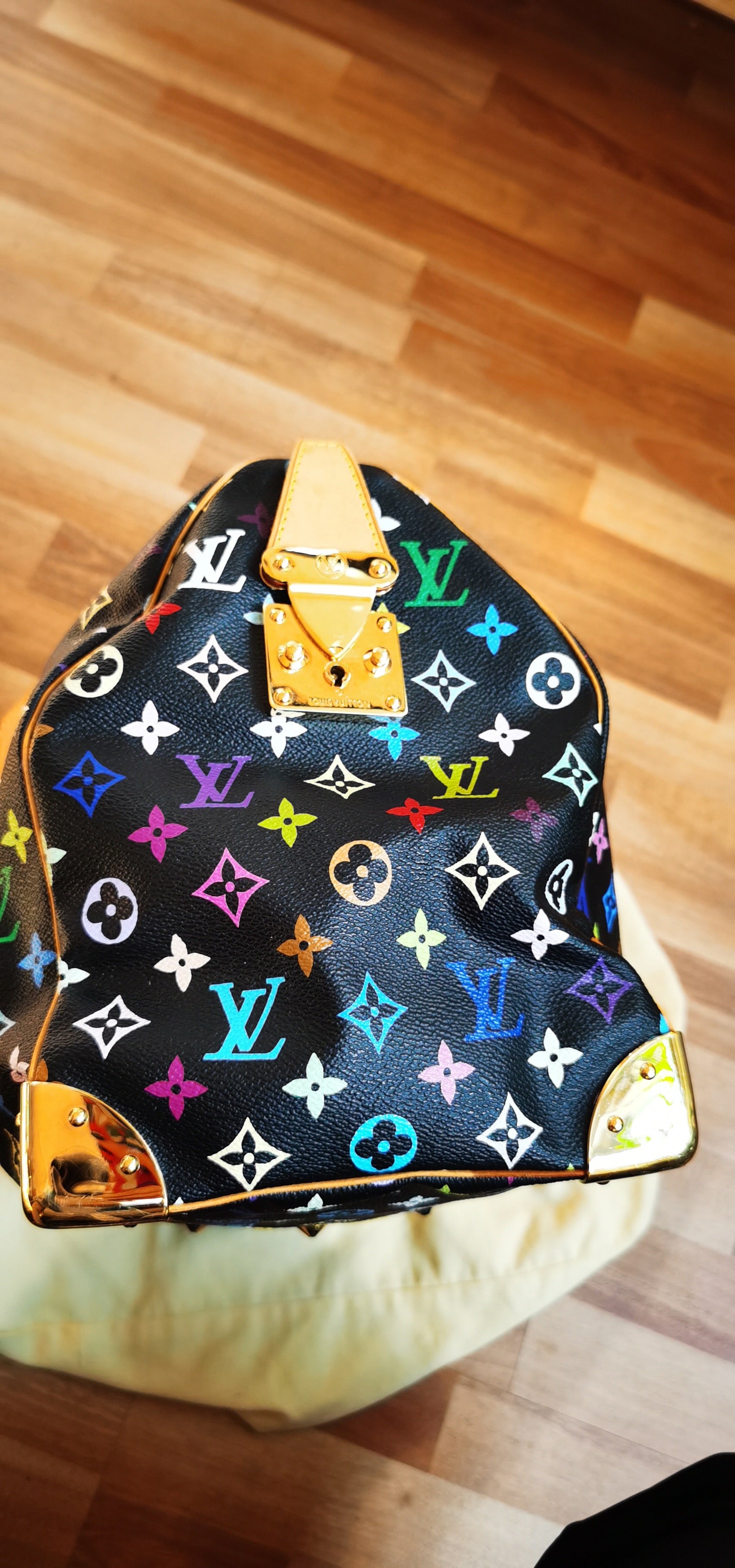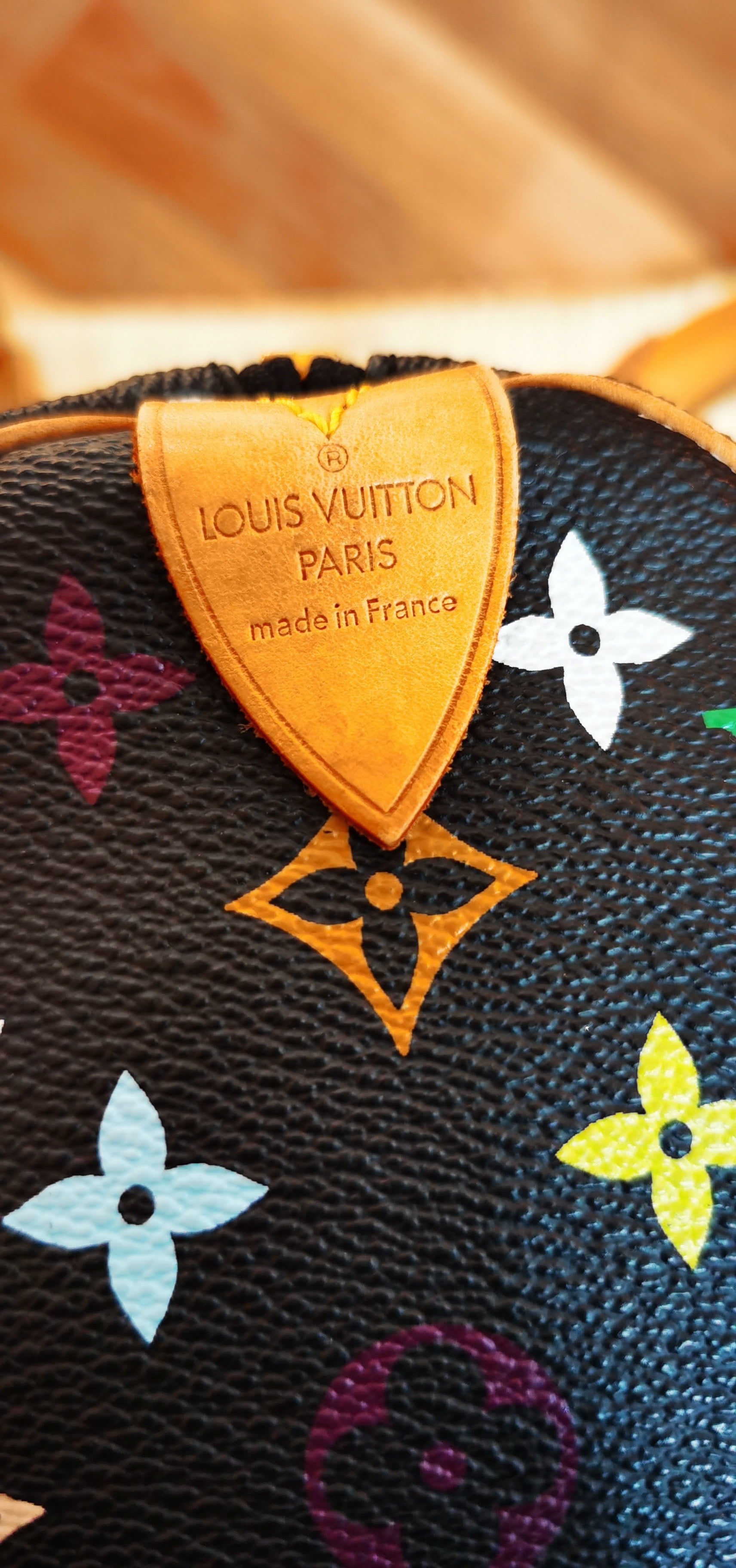 Louis Vuitton x Murakami Limited Edition Monogram Multicolor Keepall 45 Bag. This incredibly rare and highly sought after piece of Louis Vuitton history became a worldwide phenomenon when Japanese artist Takashi Murakami teamed up with the Louis Vuitton brand and creative Director Marc Jacobs for a range of exclusive collections. On the Spring/ Summer 2003 runway, the multicolor line where Murakami re-imagined the classic monogram logo with a variety of bright colors in his whimsical Japanese designs became an instant cult classic favored by celebrities all over the world.