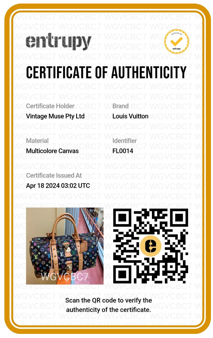 For additional peace of mind and future reference, can also include a Certificate of Authenticity from Entrupy , which is a third-party authentication service. Entrupy is the only technology-based, powered by Al, authentication solution on the market to provide trust to buyers and sellers of luxury handbags.