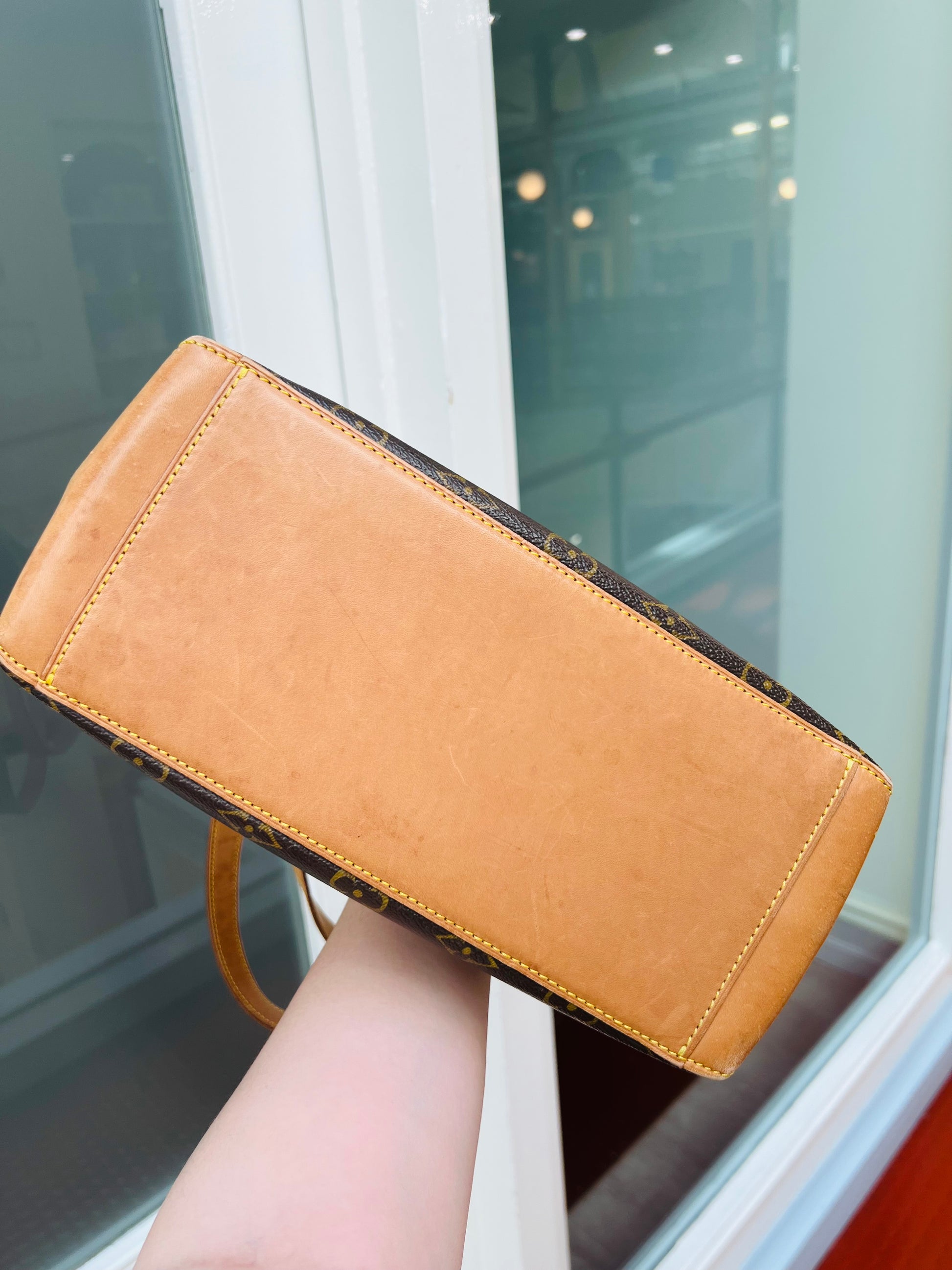 This piece remains in great vintage condition. The monogram canvas exterior is beautifully preserved with only gentle signs of wear. The leather base and trim have developed a warm honey patina, showing light rubbing and moderate water marks that add character. Handles are strong and in good condition, with moderate darkening, light rubbing and water marks; one strap carries a subtle “MS” blind embossing that is barely noticeable.