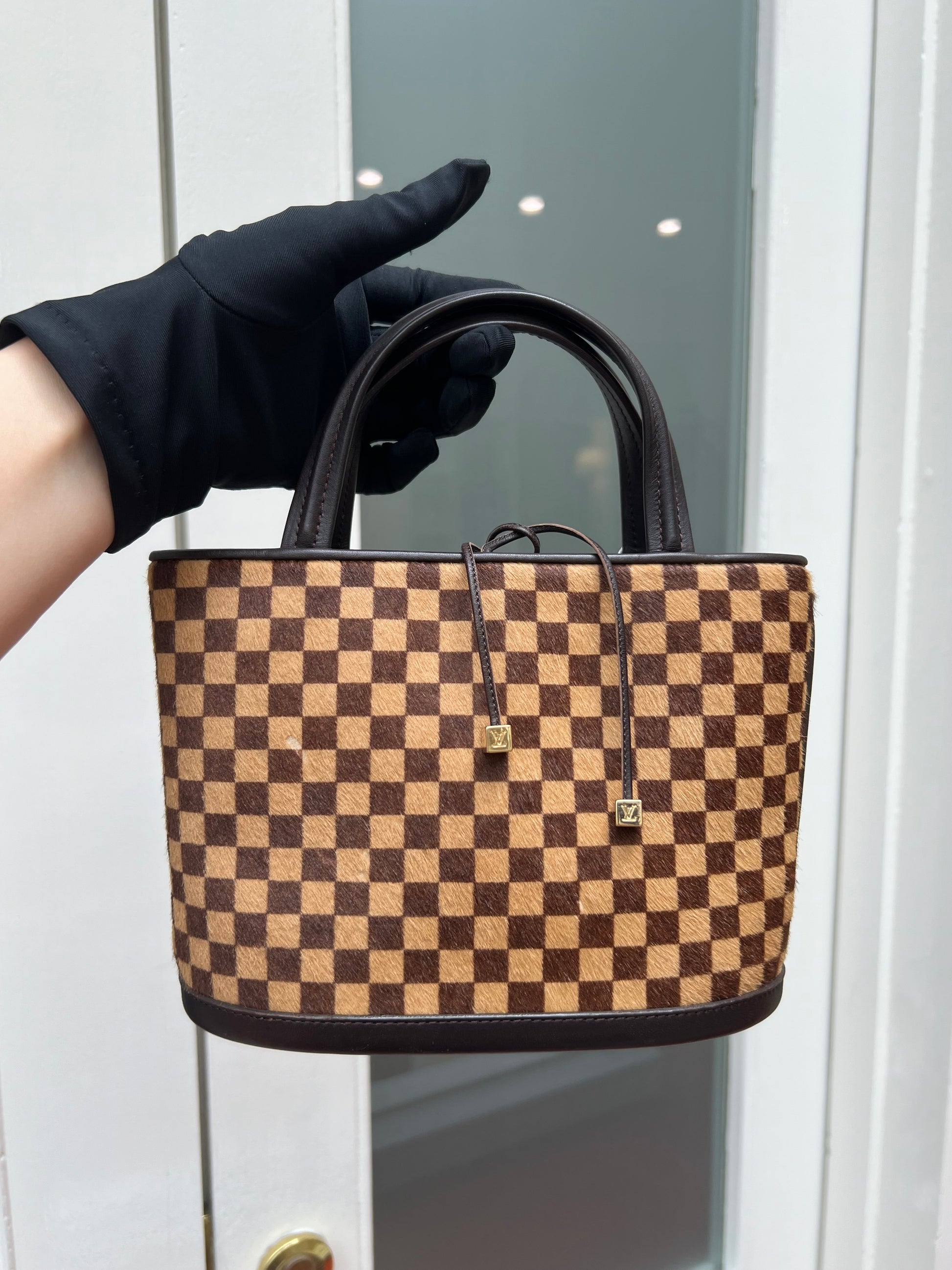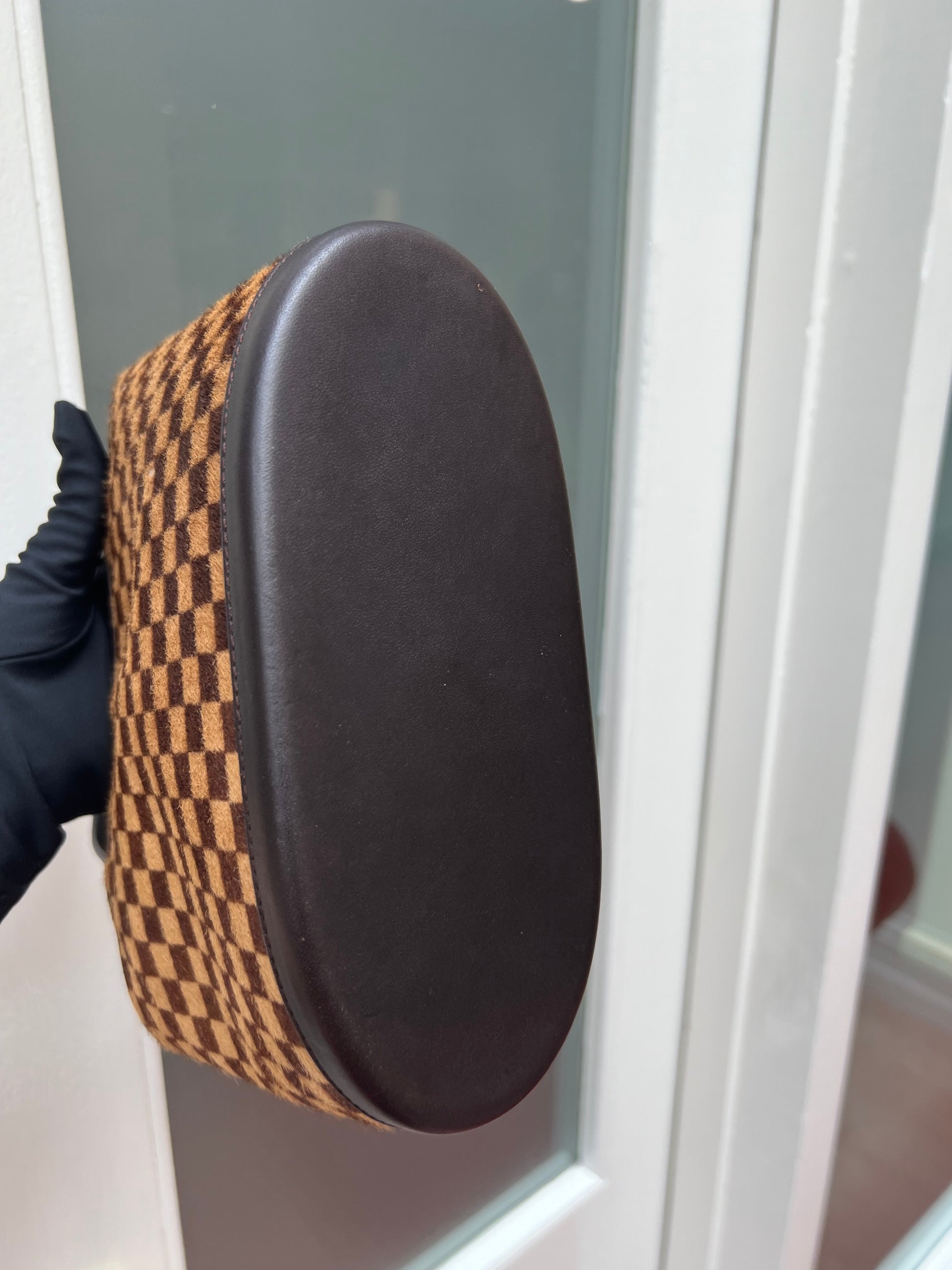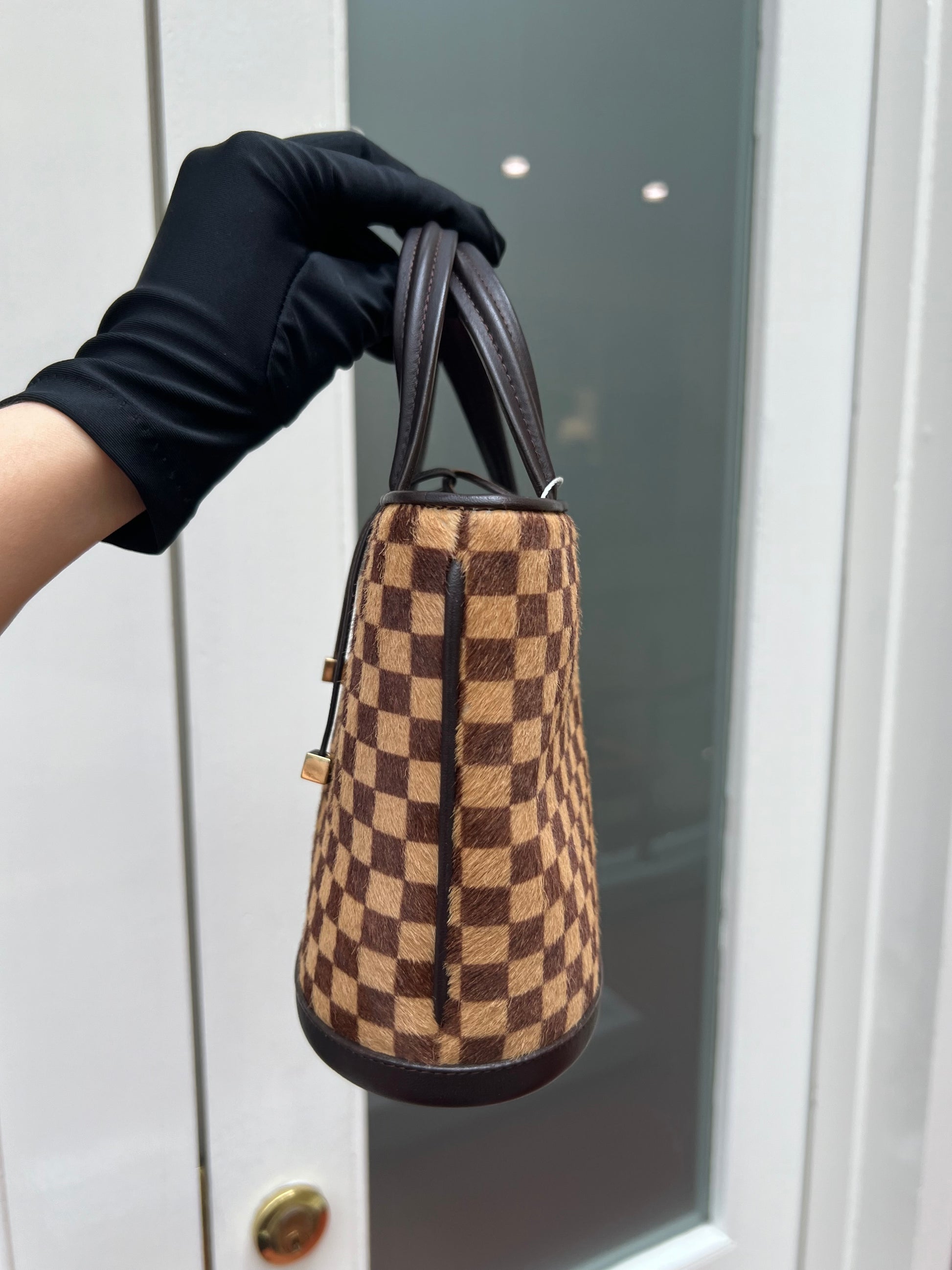 The posh look of this LV Damier Sauvage Impala Pony Hair hand bag cannot be overlooked and is definitely a piece of envy for the non-carrier. The two short leather handles can be held with easy and are neatly placed. The checkered skin of the body is very eye-catchy and the inner lining is alcantra. The inner open pocket is almost invisible.