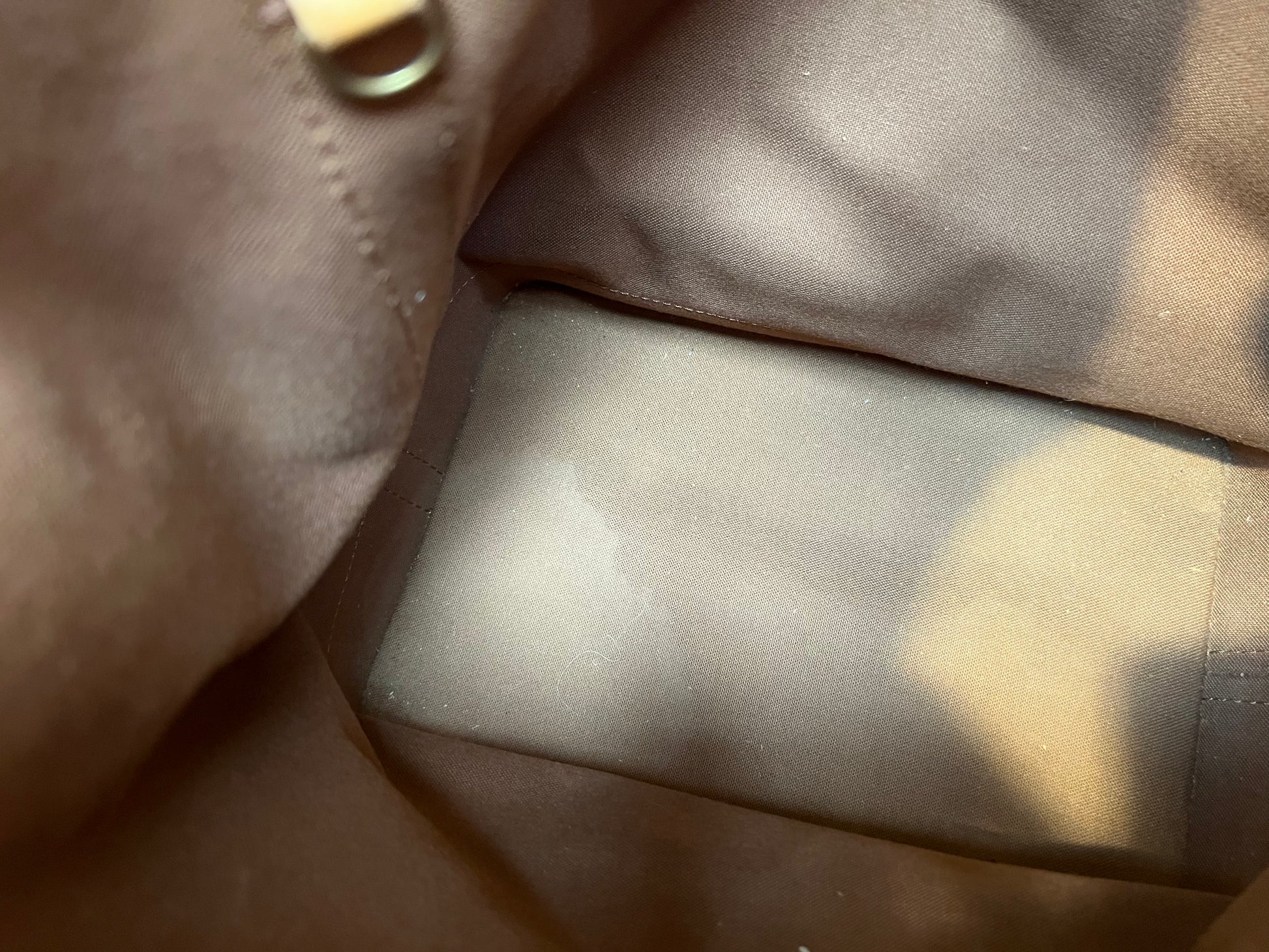 Outside: Leather parts have wear and tear (water spots, cracks, wrinkles), corners are slightly faded. the drawstring is worn