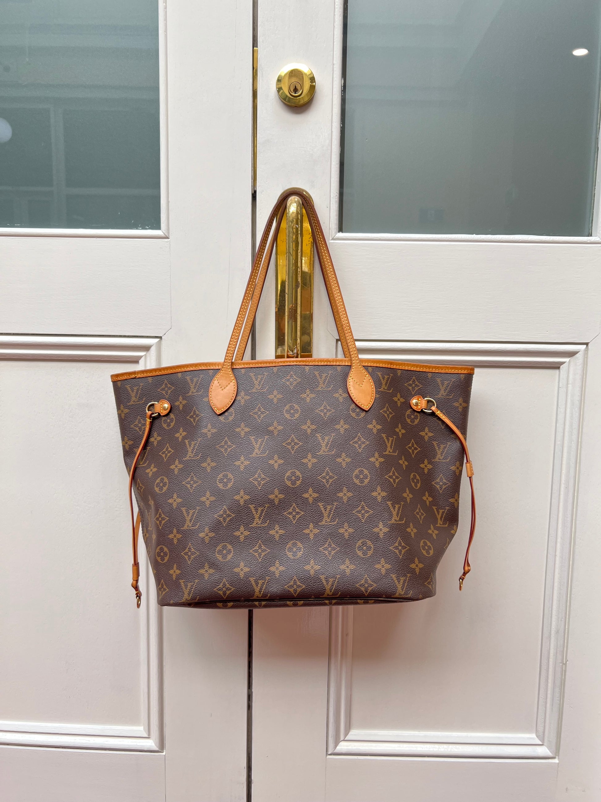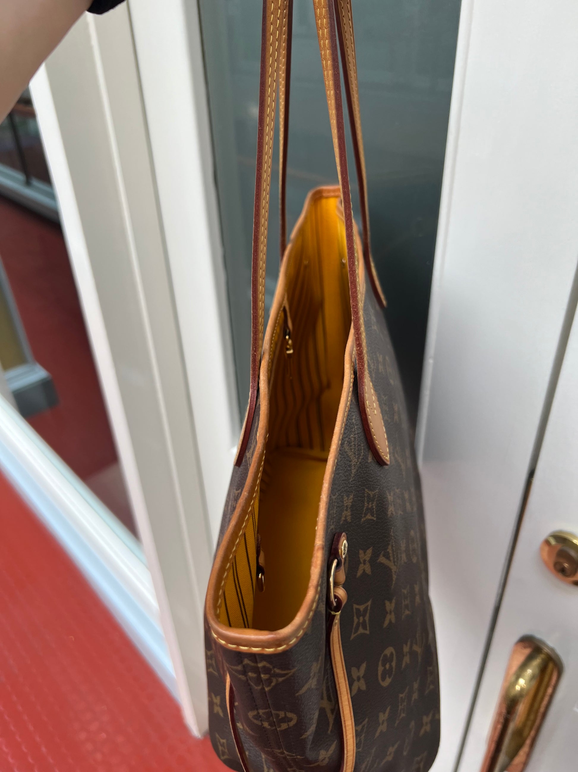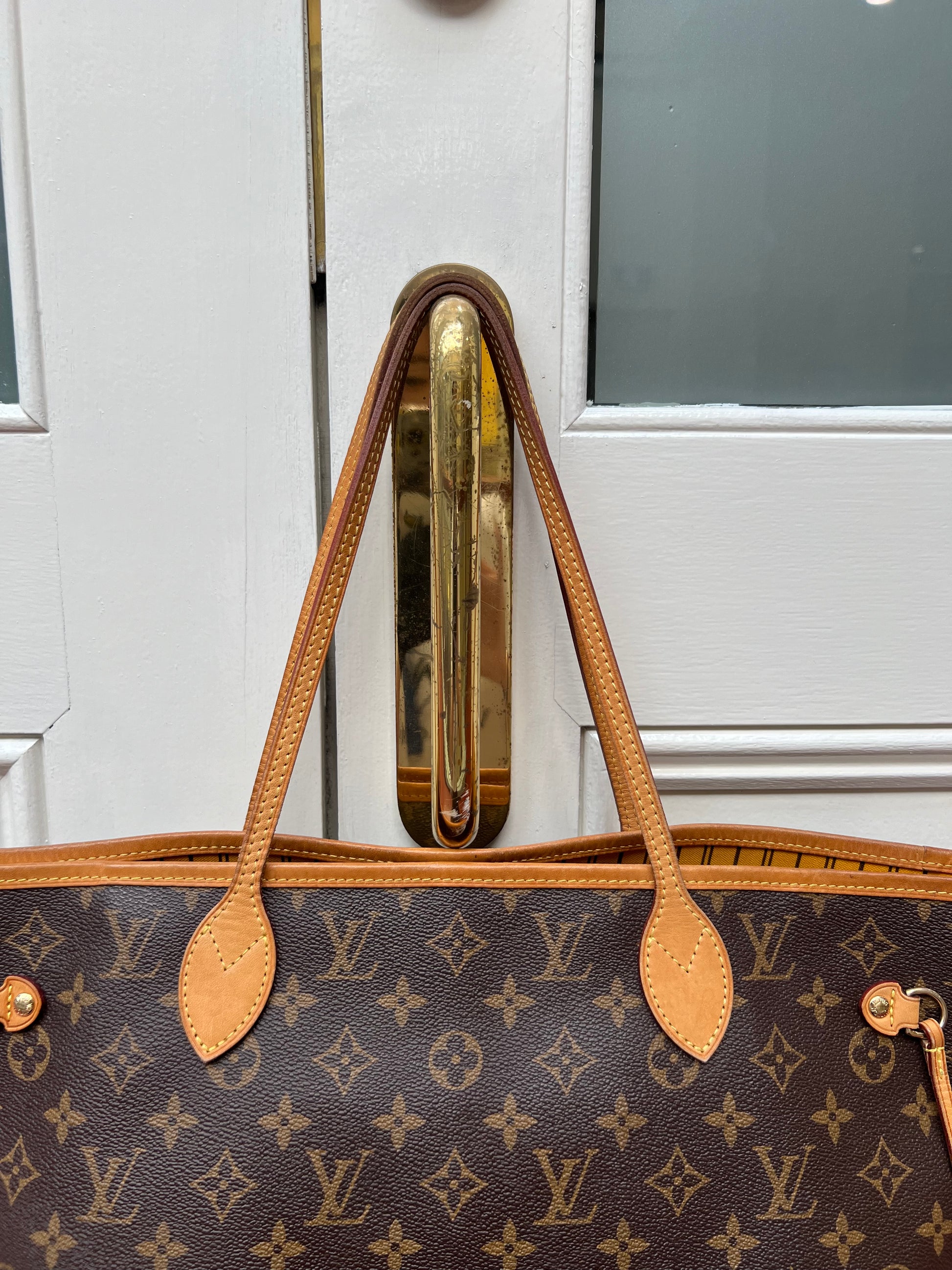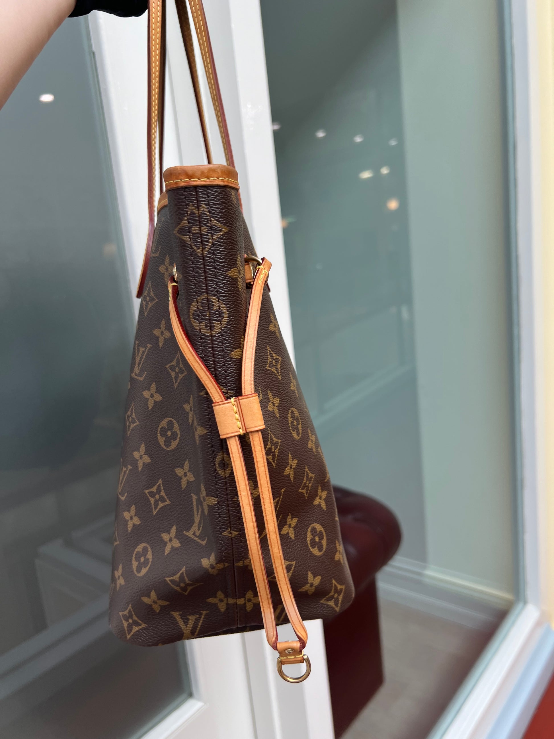 This Louis Vuitton classic monogram Neverfull MM shoulder bag is currently priced at $3050 AUD. It is in a very good vintage condition, which shows signs of wear, including marks on the exterior and handles, scratches on the hardware, inner thread dirt, and some deterioration on the tanned leather.