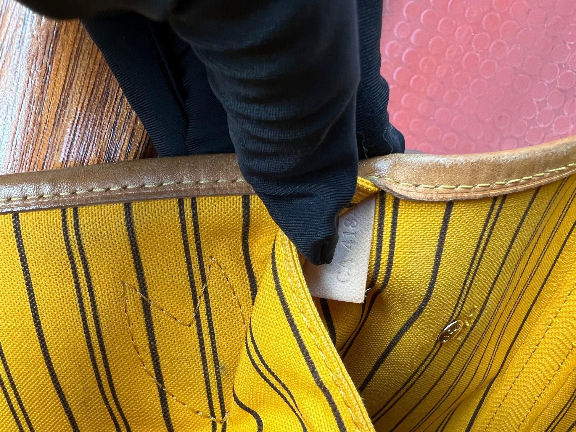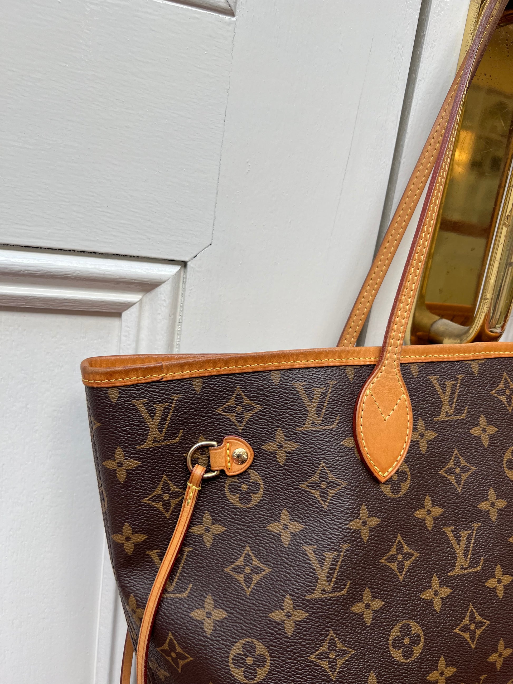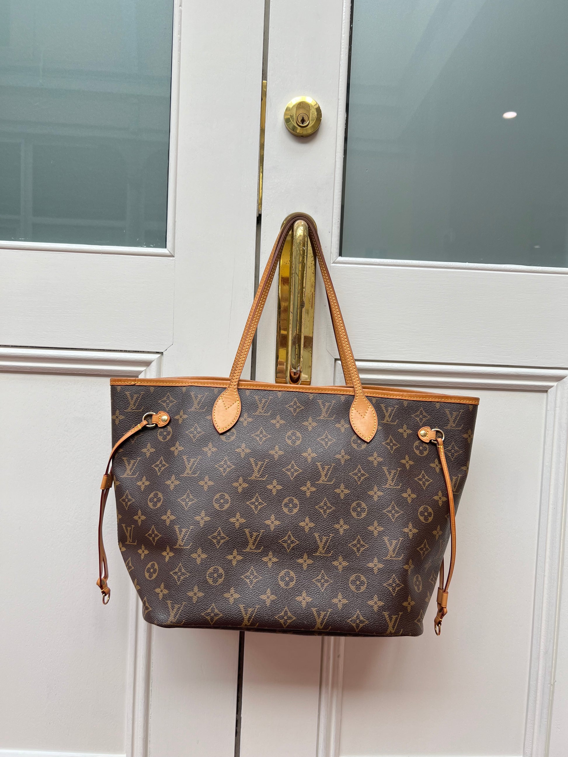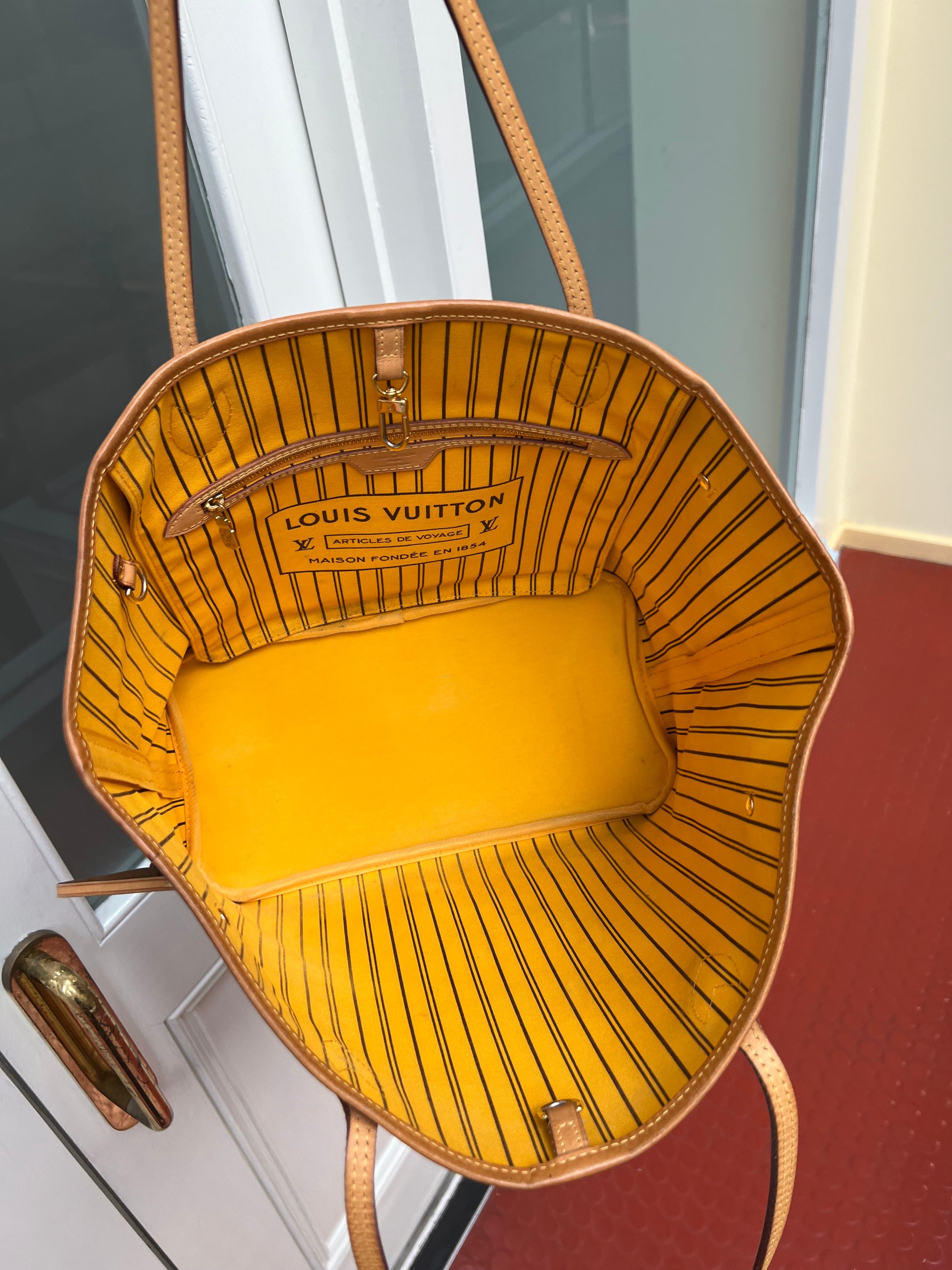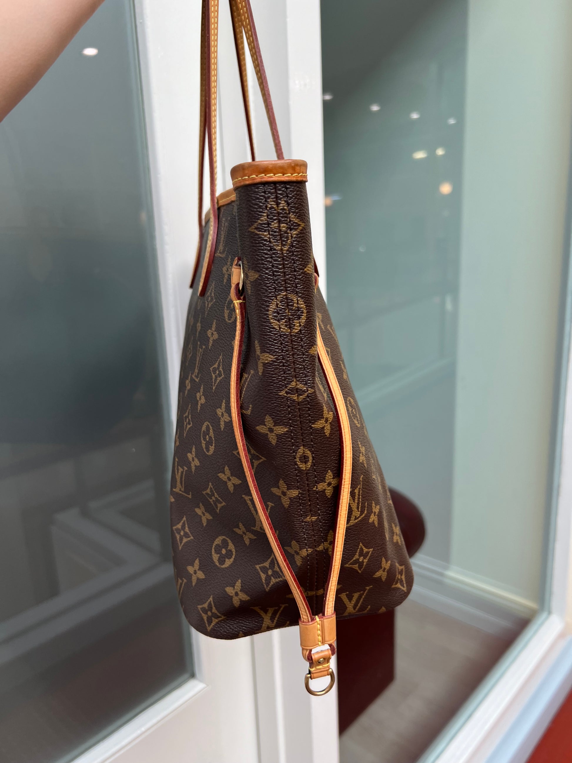This Louis Vuitton classic monogram Neverfull MM shoulder bag is currently priced at $3050 AUD. It is in a very good vintage condition, which shows signs of wear, including marks on the exterior and handles, scratches on the hardware, inner thread dirt, and some deterioration on the tanned leather.