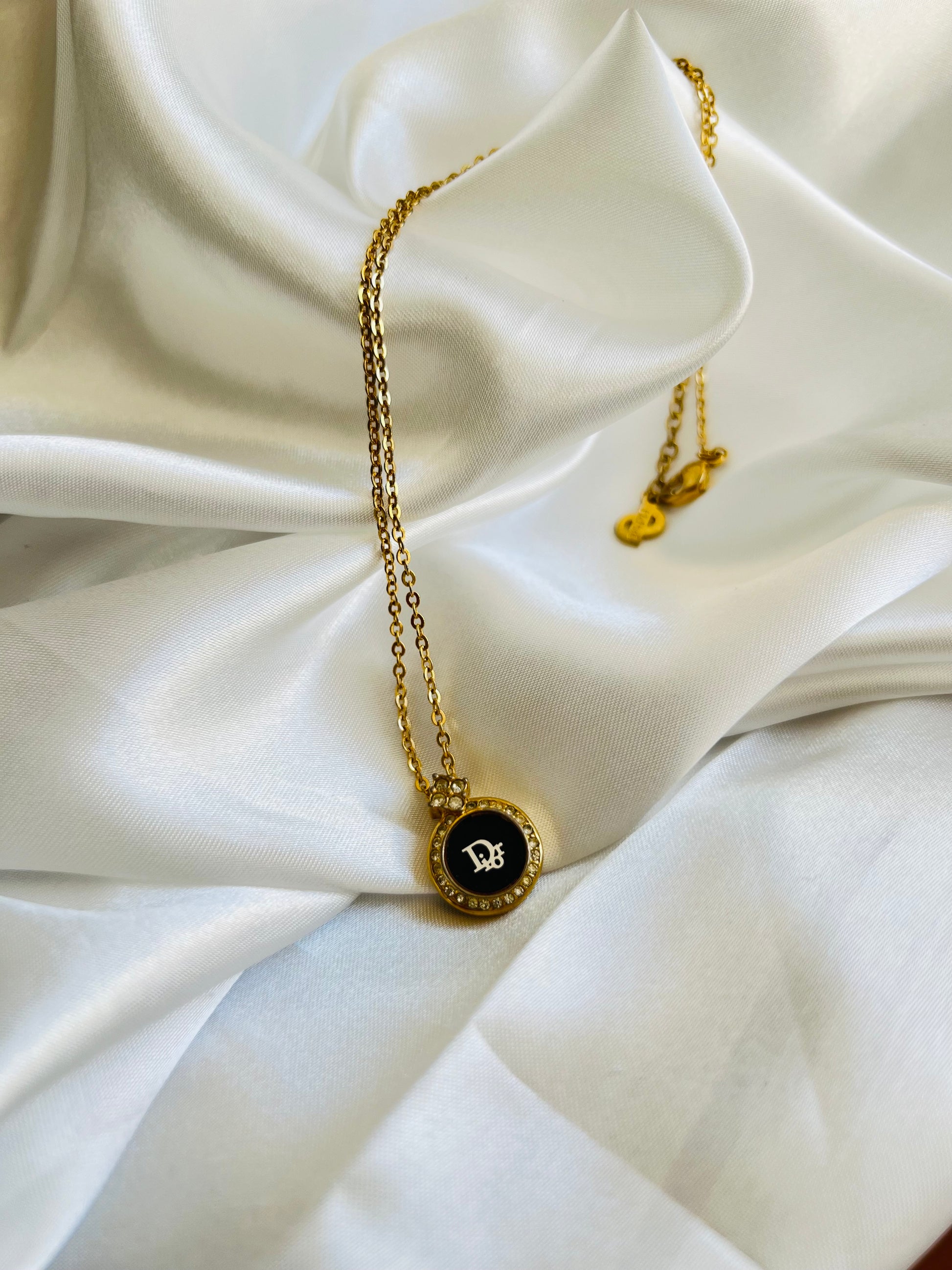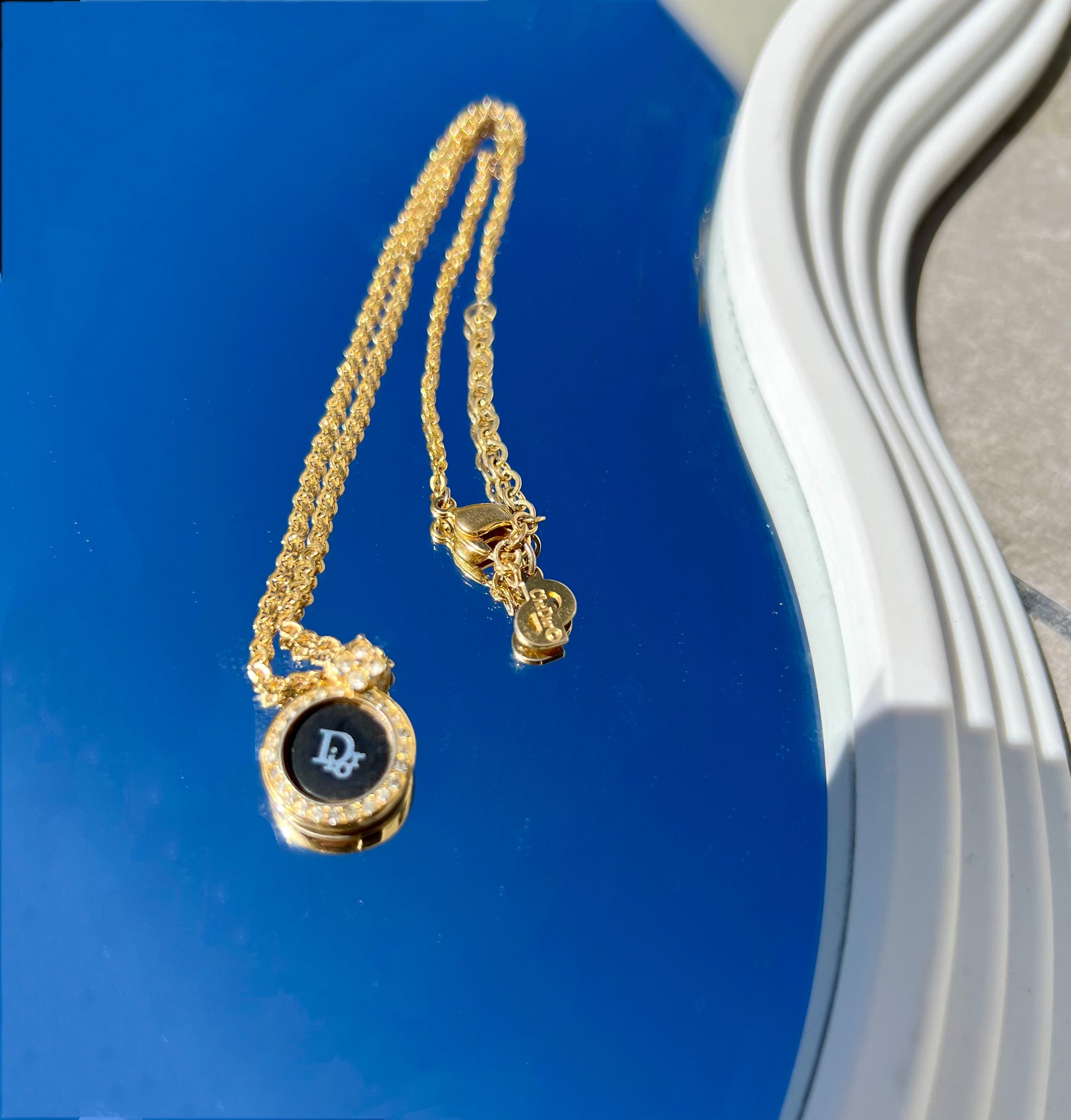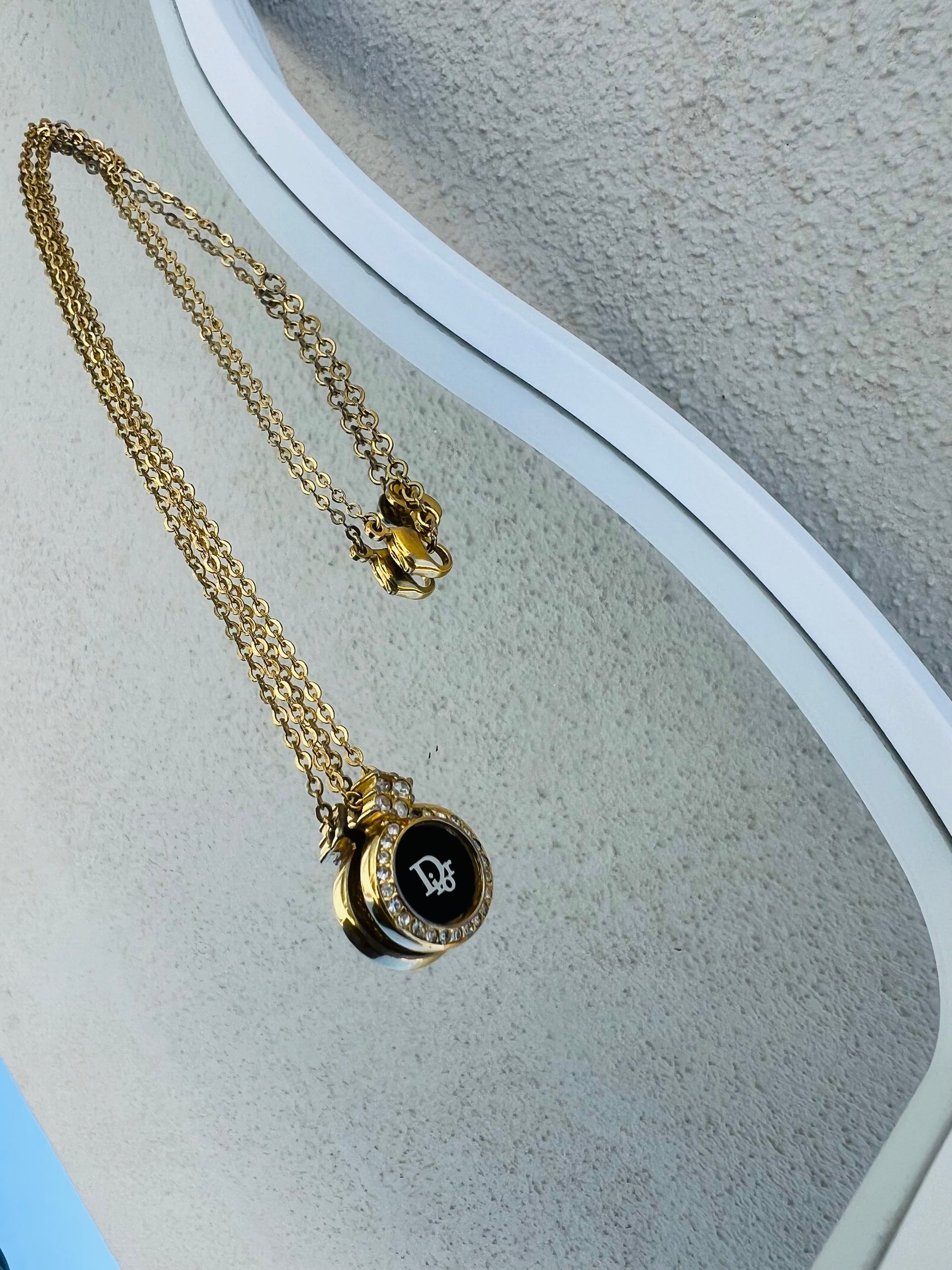 Vintage Christian Dior Black Plate Logo Necklace. Renowned for their exceptional quality and distinct designs, this necklace is sought after by both collectors and fashion enthusiasts alike.