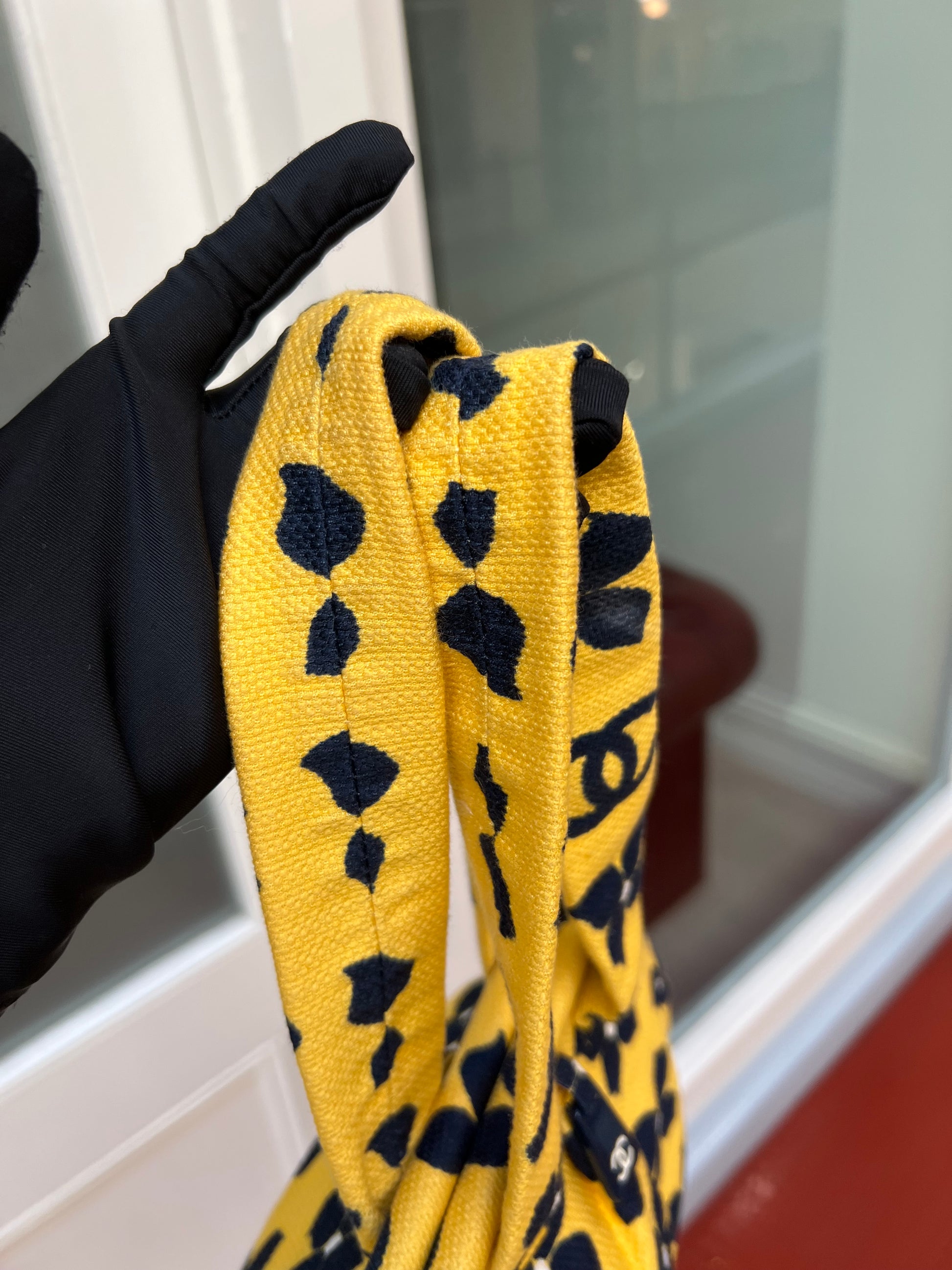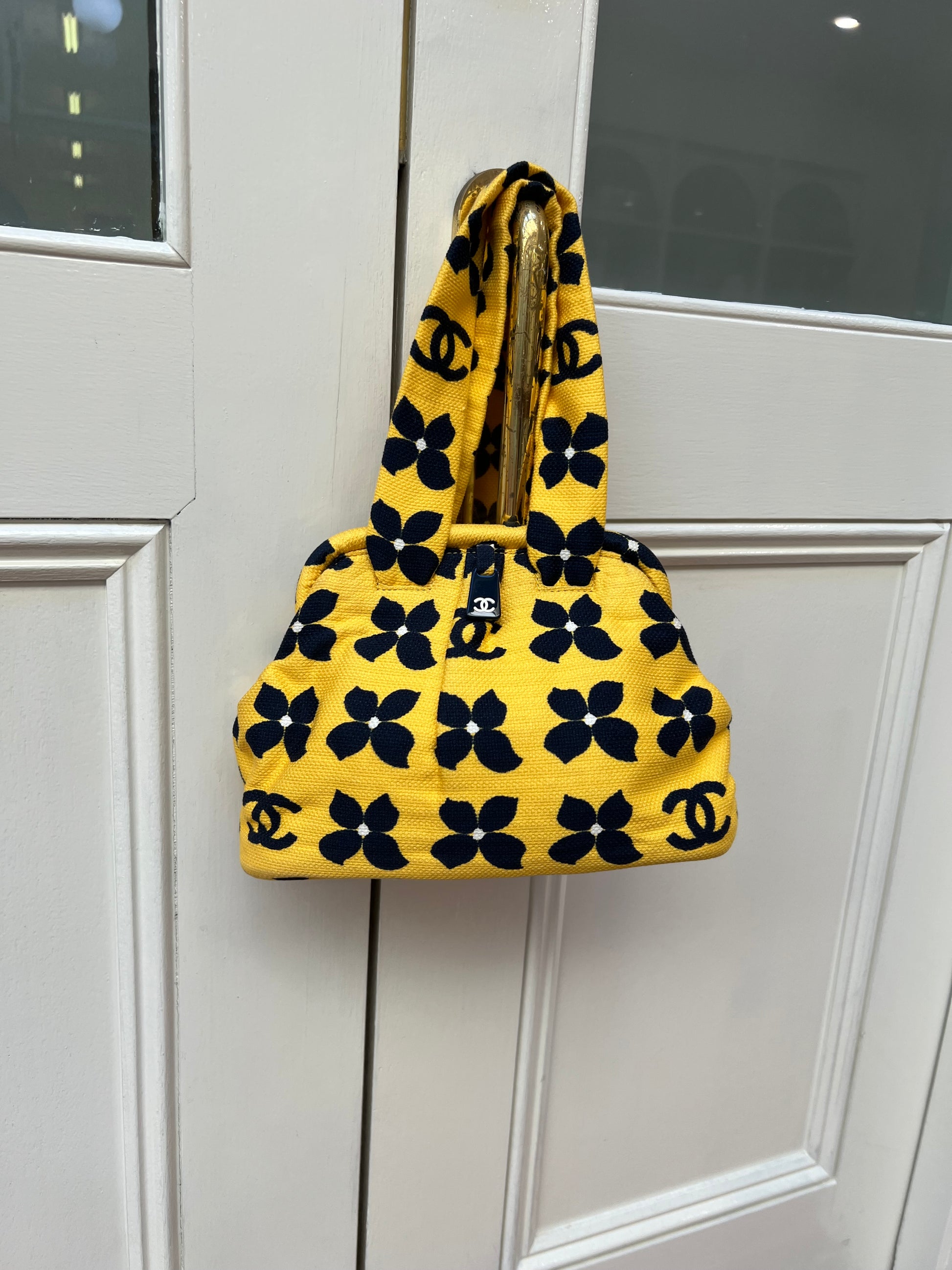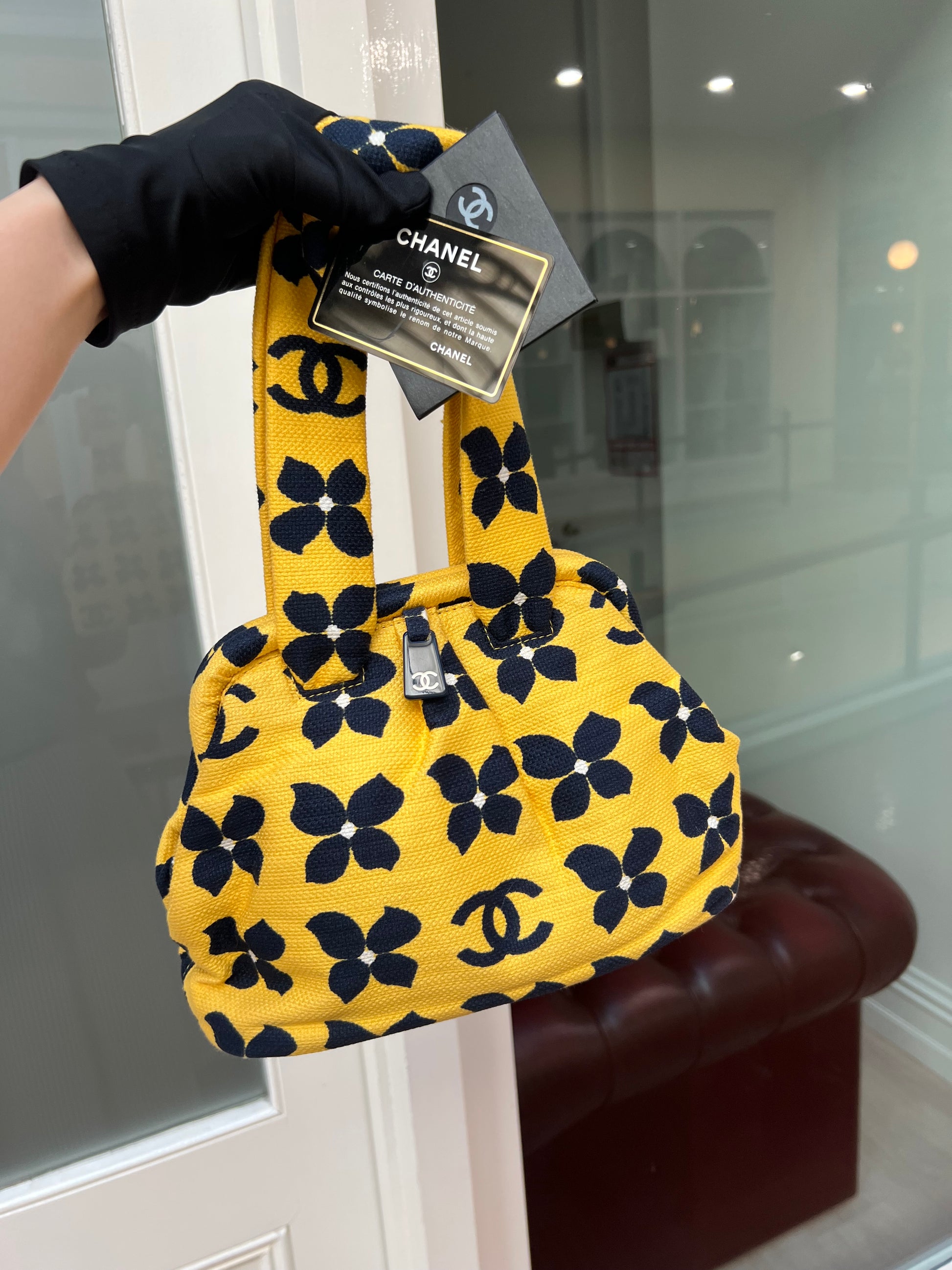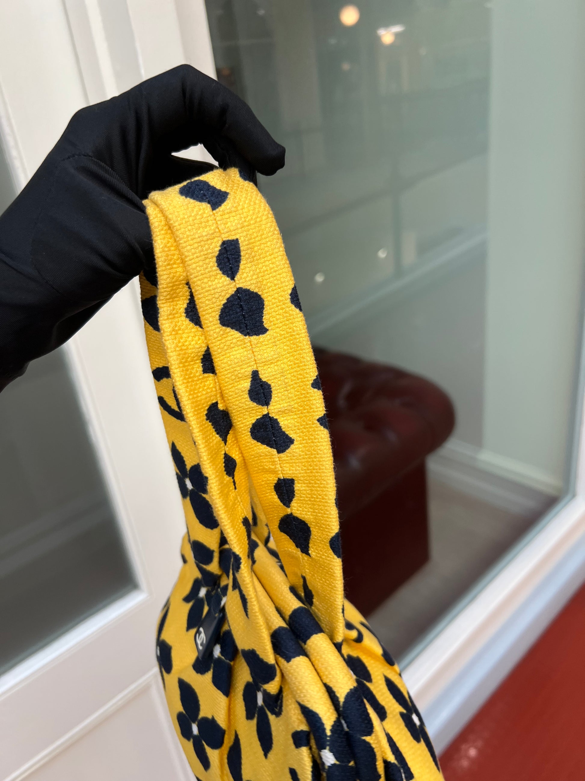 Description:This is an authentic CHANEL Canvas Printed CC Flower Frame Bag in Yellow and Black. This fun tote is crafted of yellow canvas with a floral design. The top is open to a black fabric interior with a patch pocket.