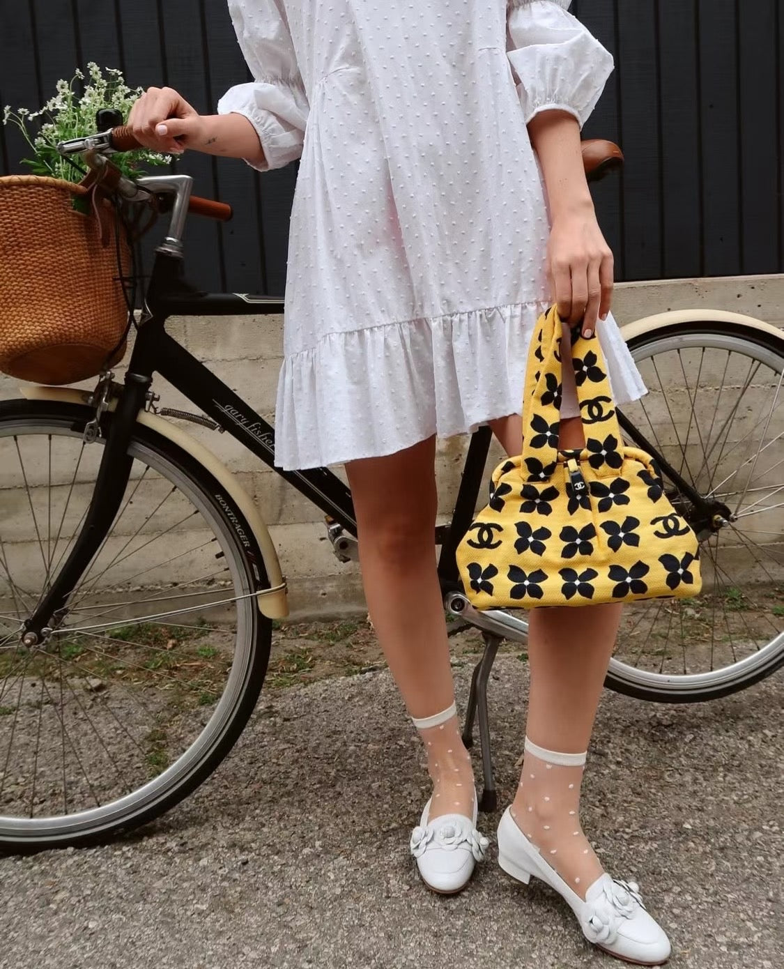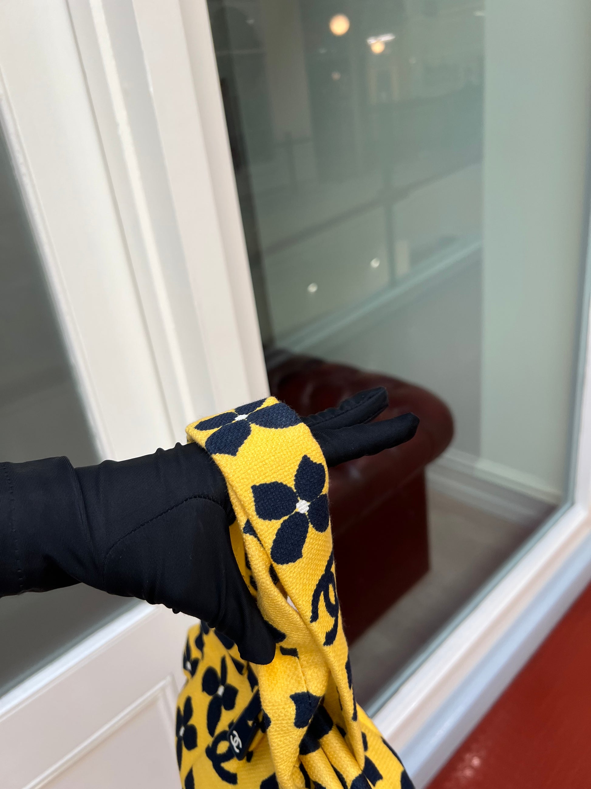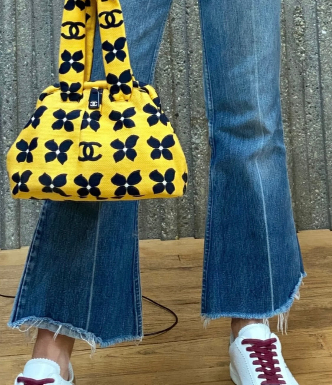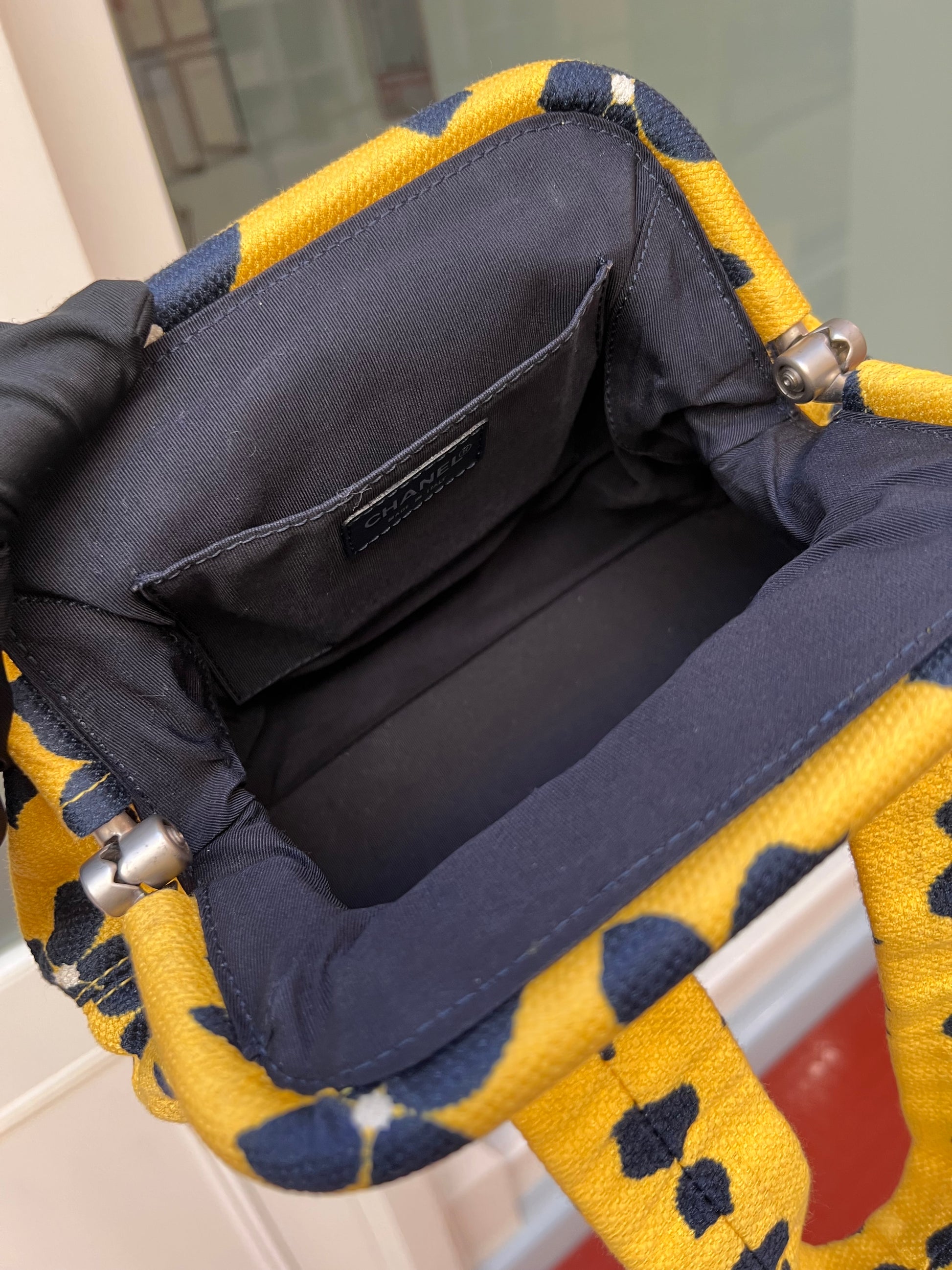 Description:This is an authentic CHANEL Canvas Printed CC Flower Frame Bag in Yellow and Black. This fun tote is crafted of yellow canvas with a floral design. The top is open to a black fabric interior with a patch pocket.
