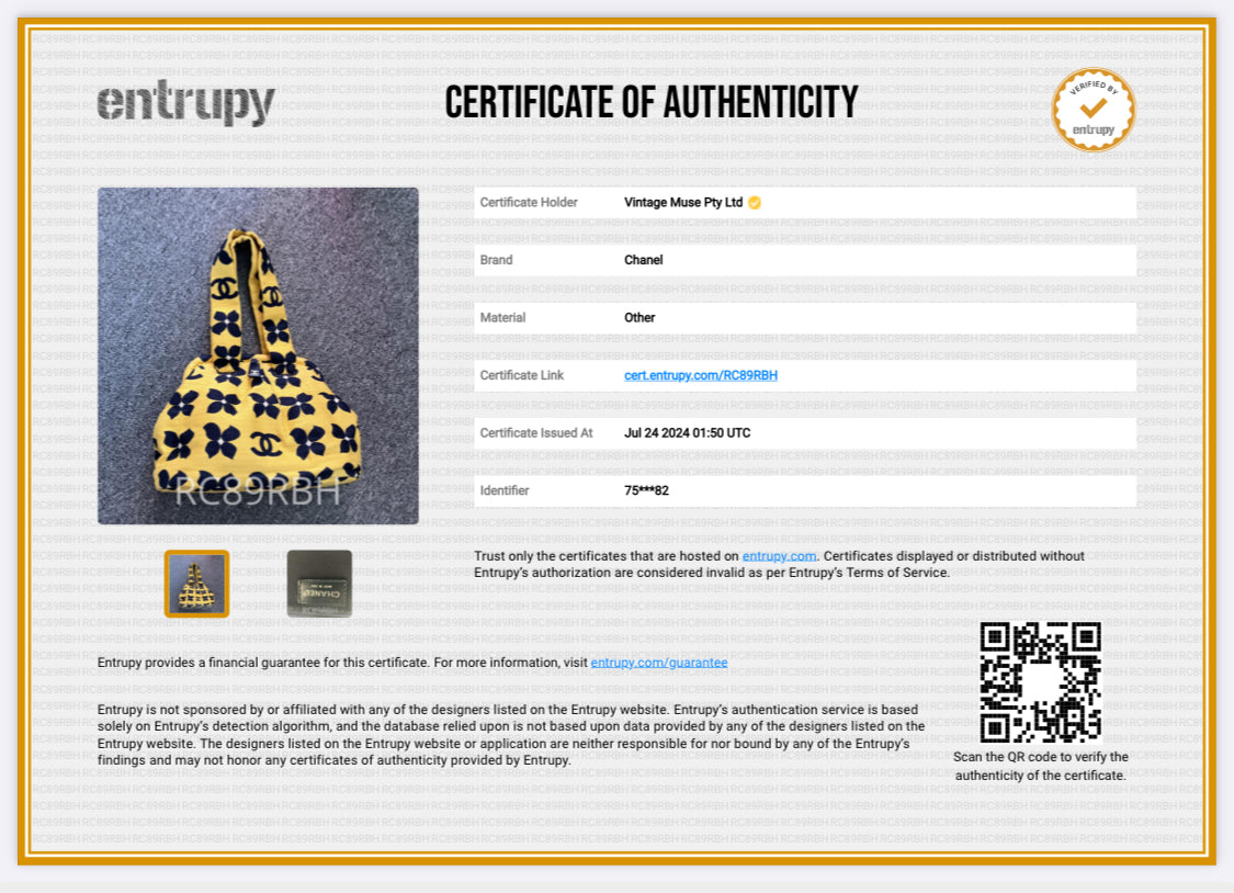 For additional peace of mind and future reference, can also include a Certificate of Authenticity from Entrupy , which is a third-party authentication service. Entrupy is the only technology-based, powered by Al, authentication solution on the market to provide trust to buyers and sellers of luxury handbags.