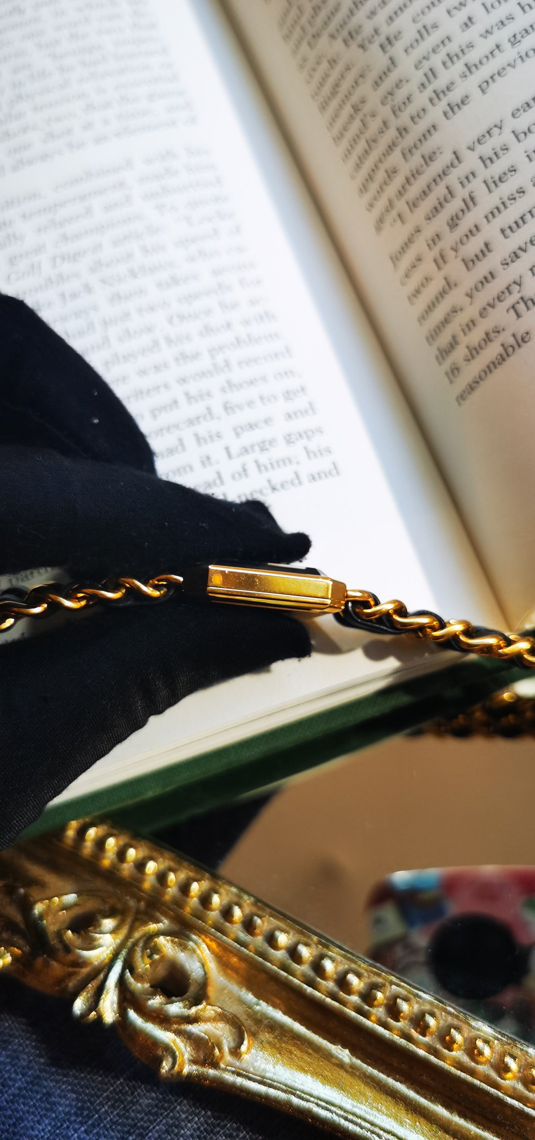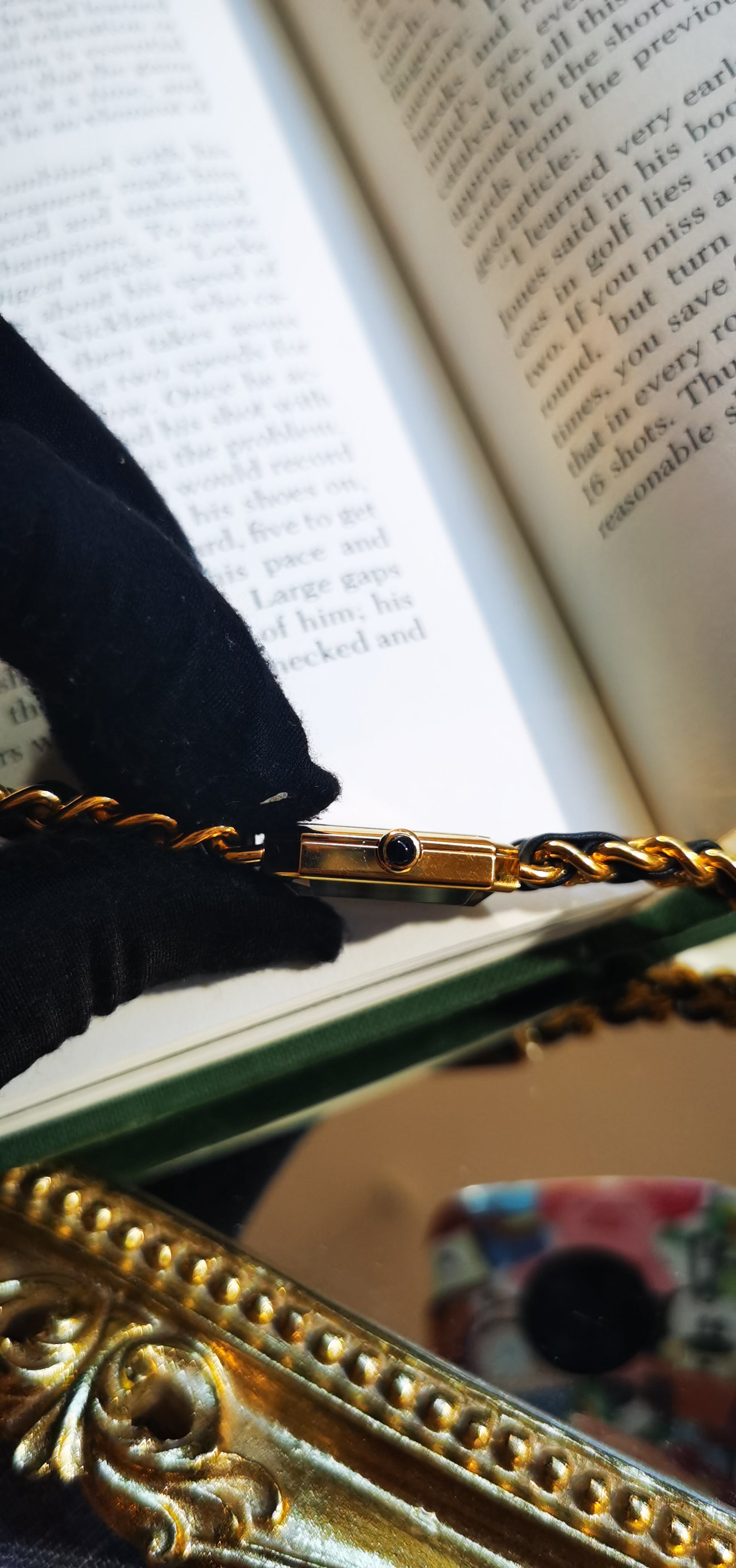 Magnificent Chanel Vintage watch, collector's item, gold-plated, black background, gold hands and onyx cabochon, shockproof faceted glass, size M large, length 15.5 cm, recent battery in perfect working order, remains in excellent condition.