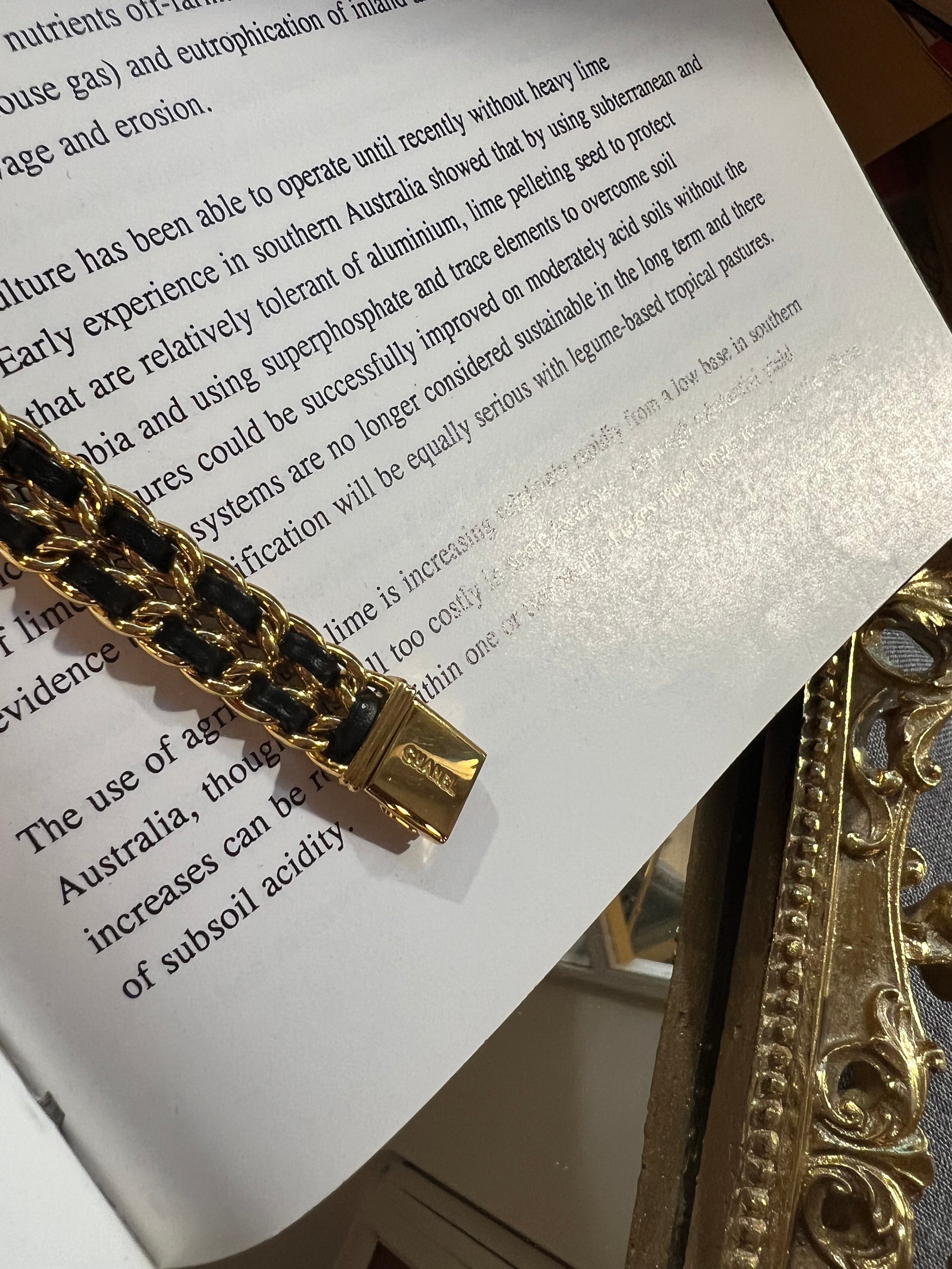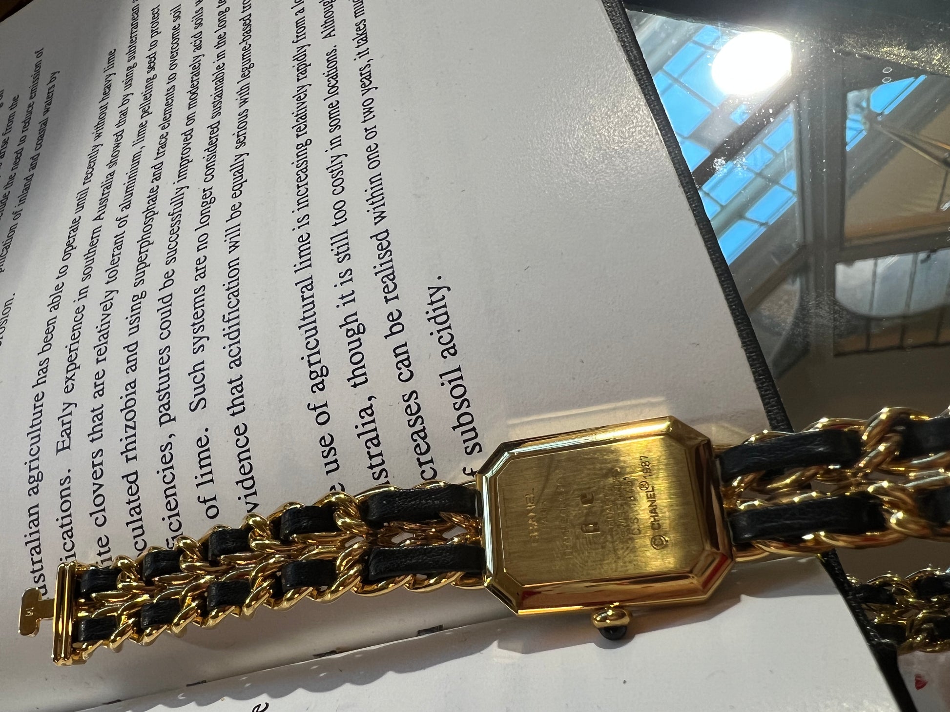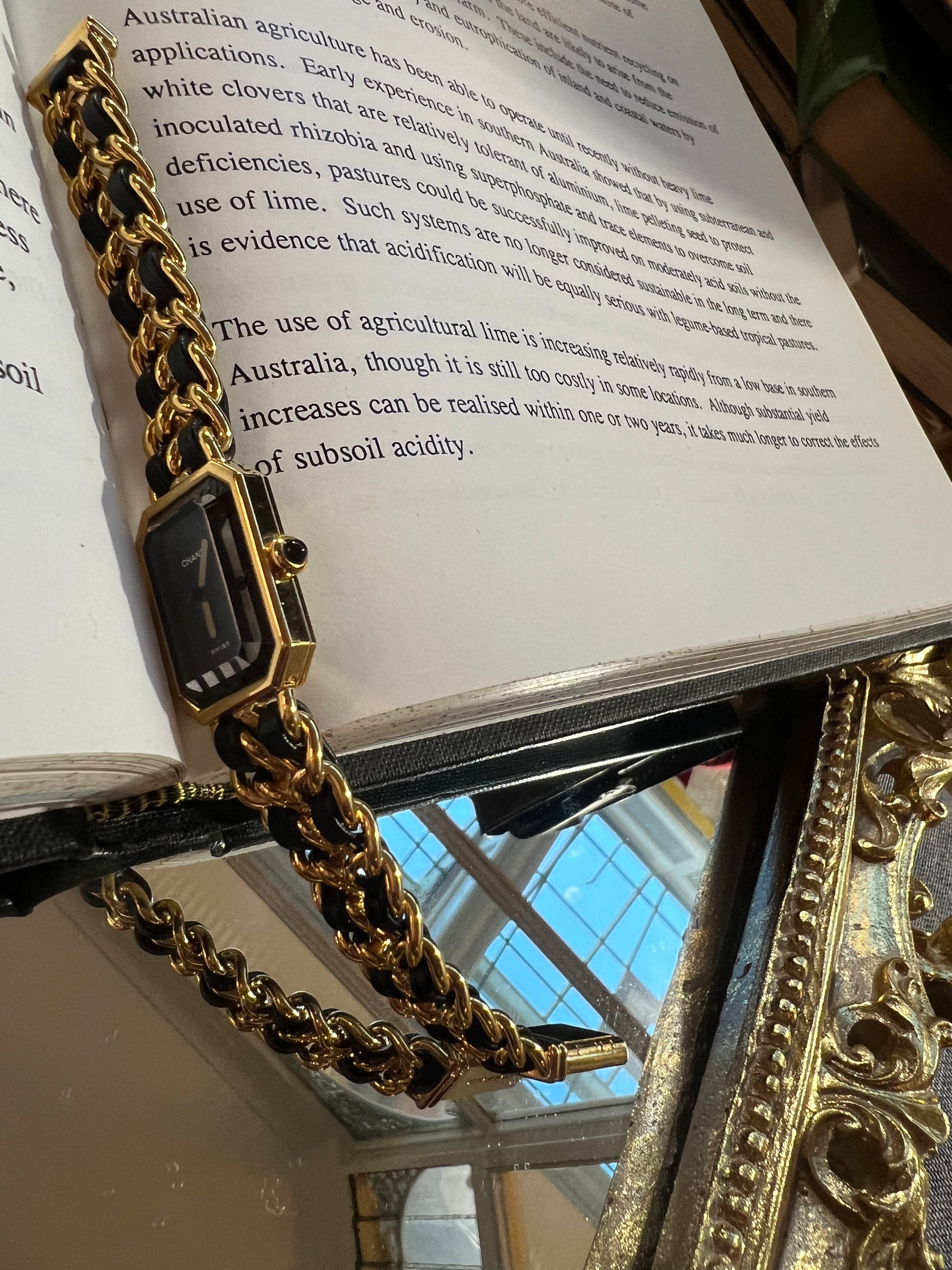 Size M, the total length (from one end to the other) is 17 cm, which corresponds to a wrist circumference of less than 16 cm. Magnificent Chanel Vintage watch, collector's item, gold-plated, black background, gold hands and onyx cabochon, shockproof faceted glass, recent battery in perfect working order, remains in excellent condition.