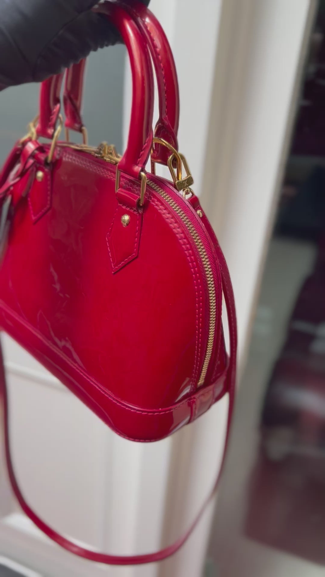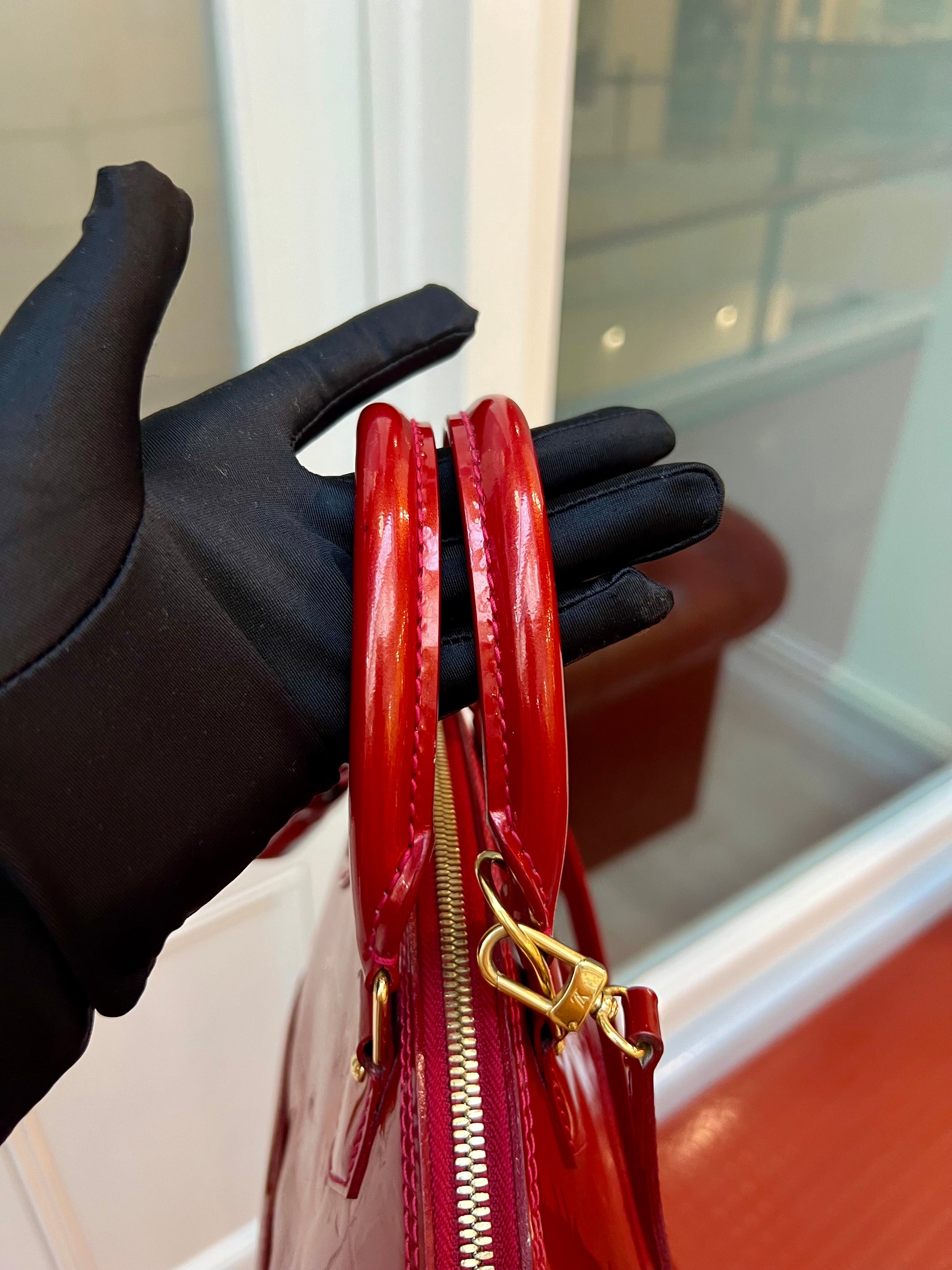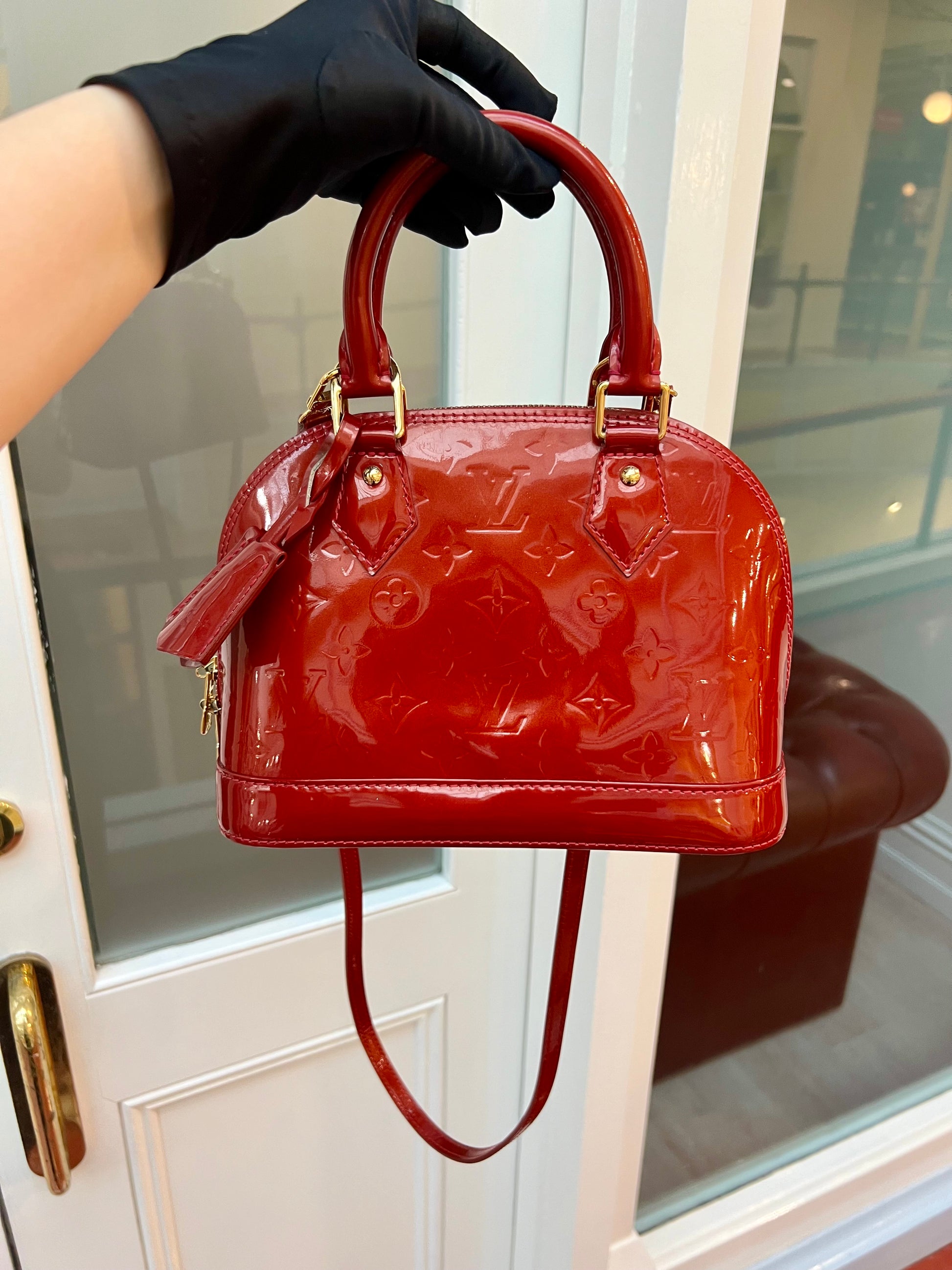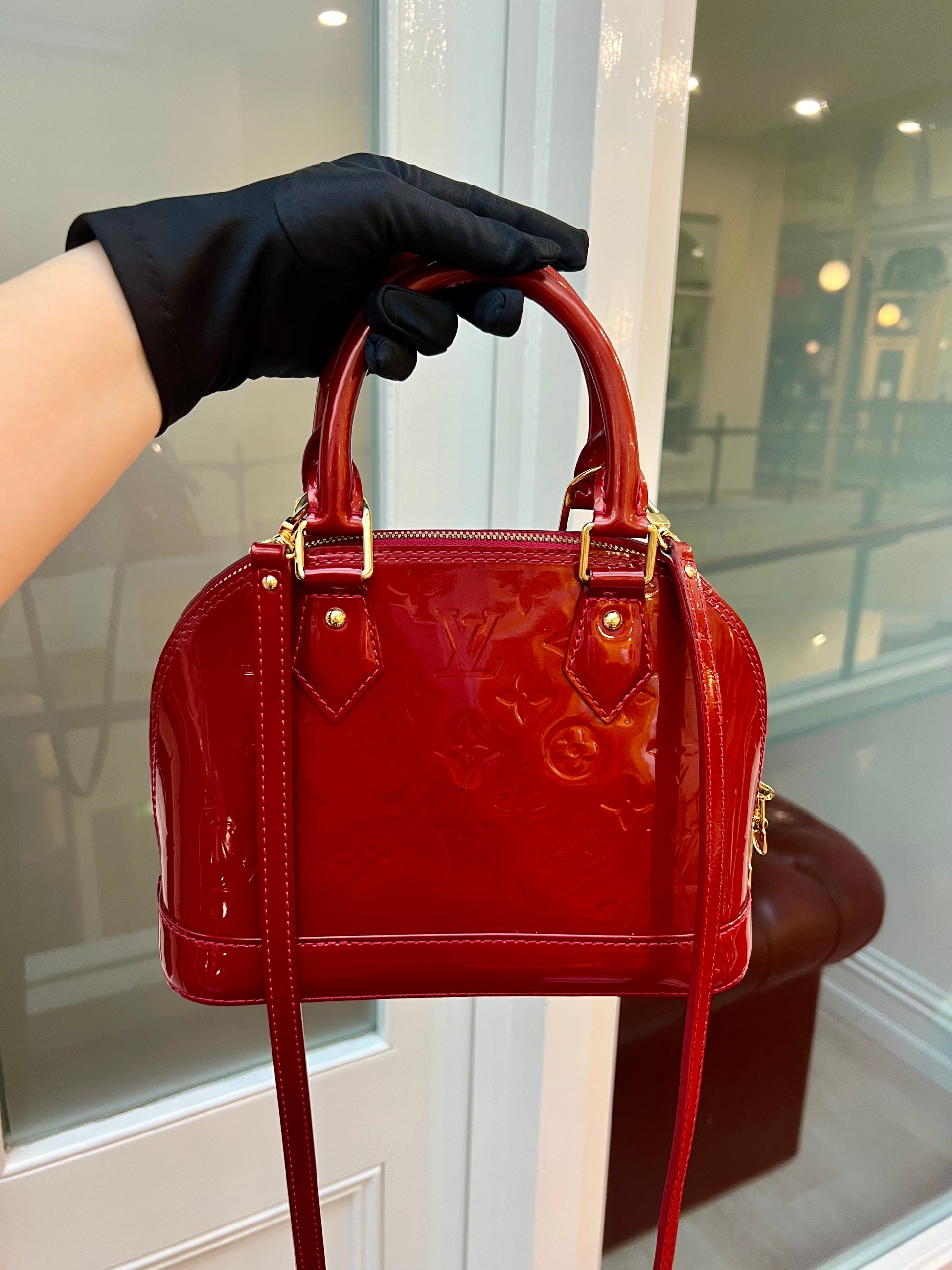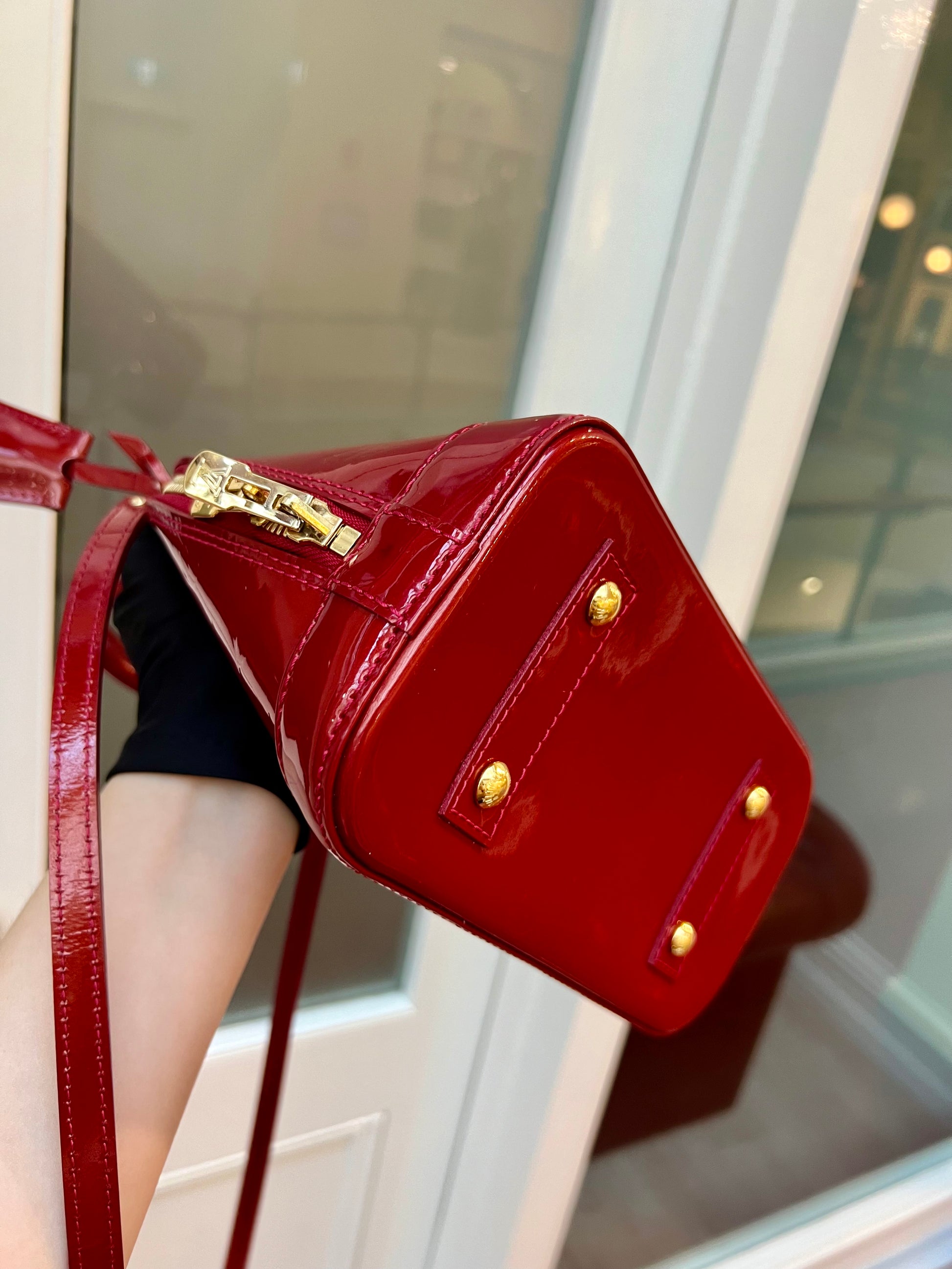 LV Alma BB in Red Patent Leather. Beautiful LV Alma in excellent condition. In a passionate shiny red hue and a coveted size 'BB', you will fall in love with this classic.