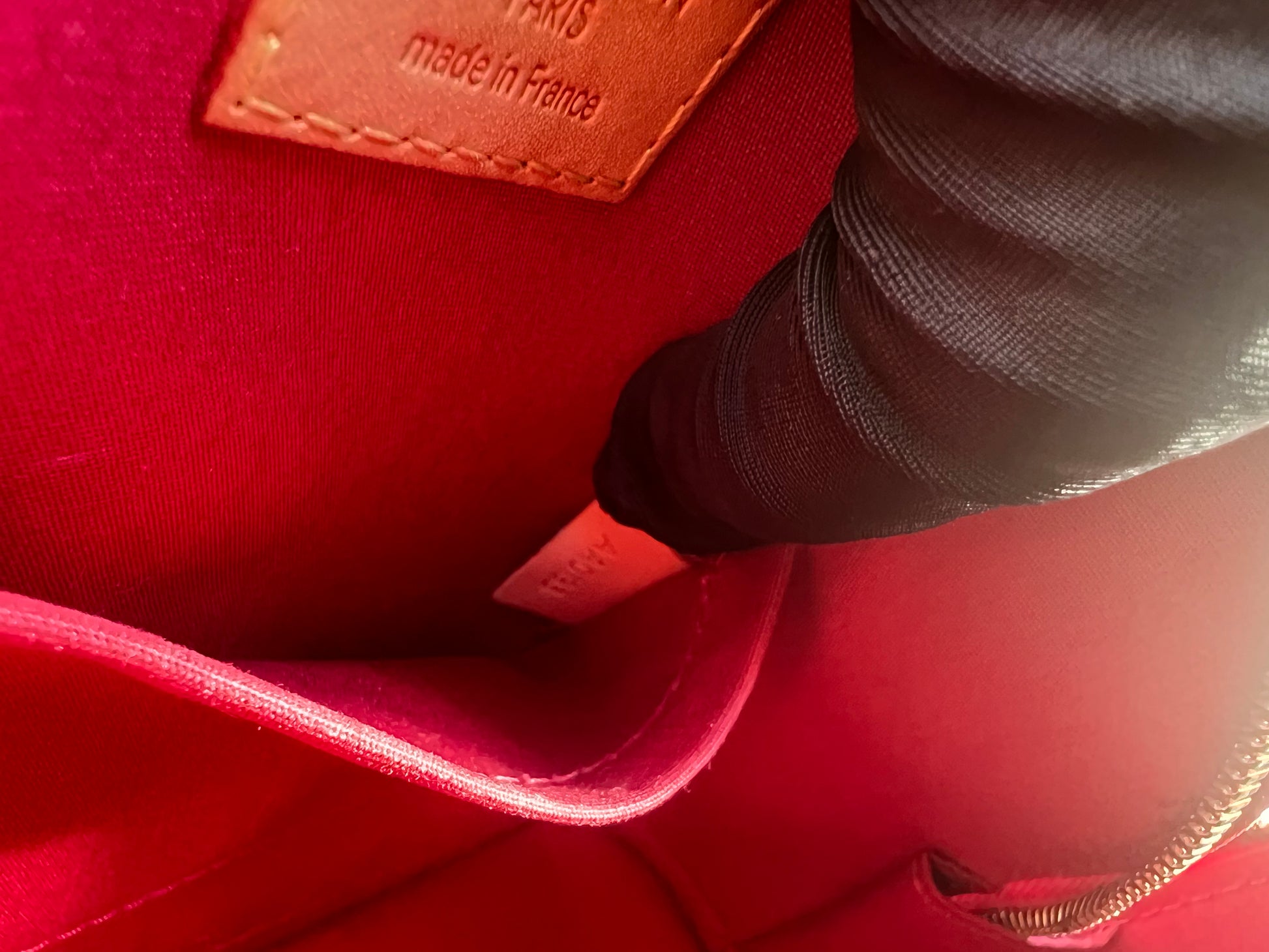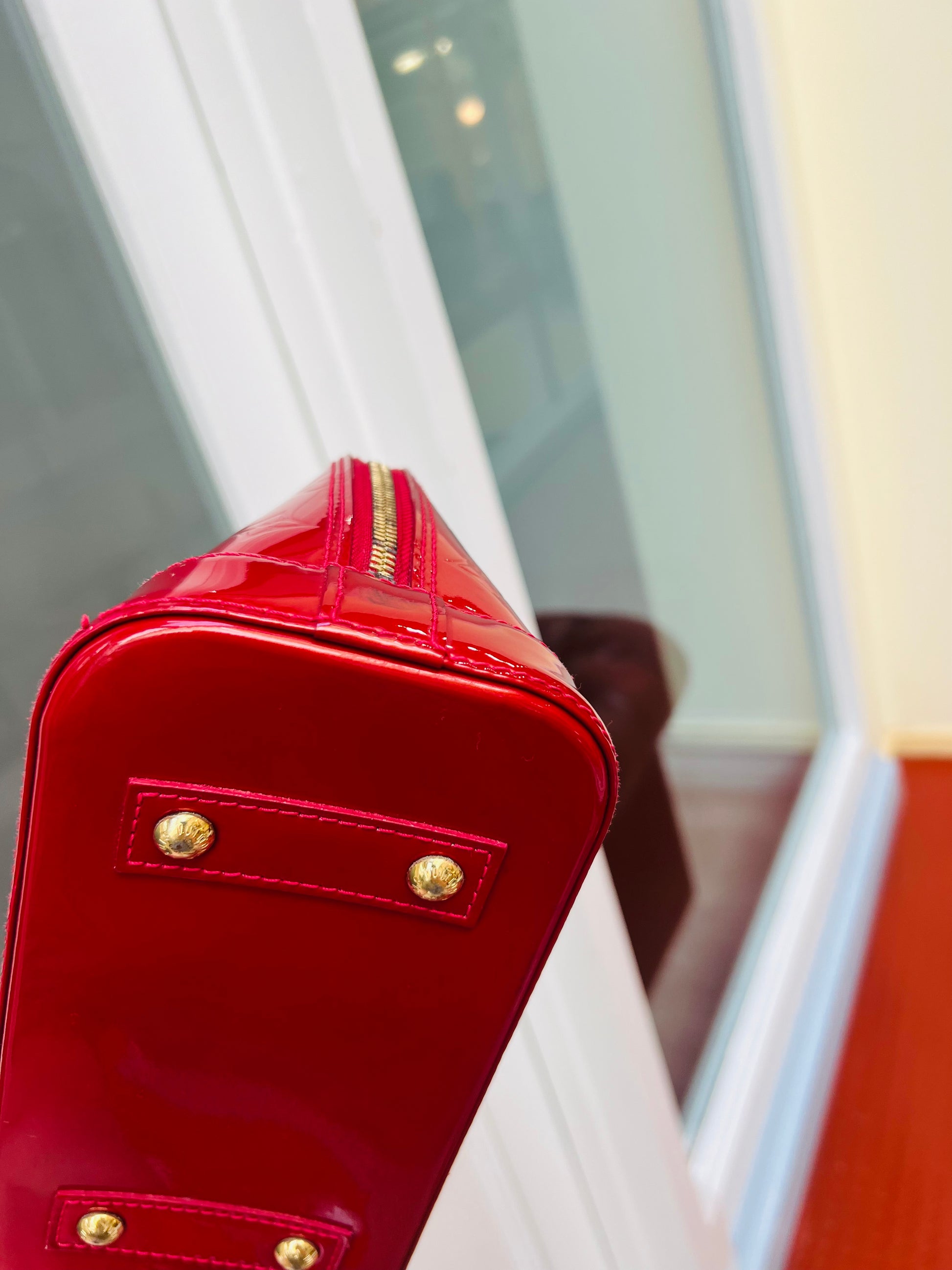 Features: Pomme d'amour red monogram vernis patent leather exterior; double rolled handles; detachable shoulder strap; gold tone hardware including padlock and 2 x keys in removable clochette; double zip closure to main compartment; tonal textile lined interior with 1 x slip pocket.