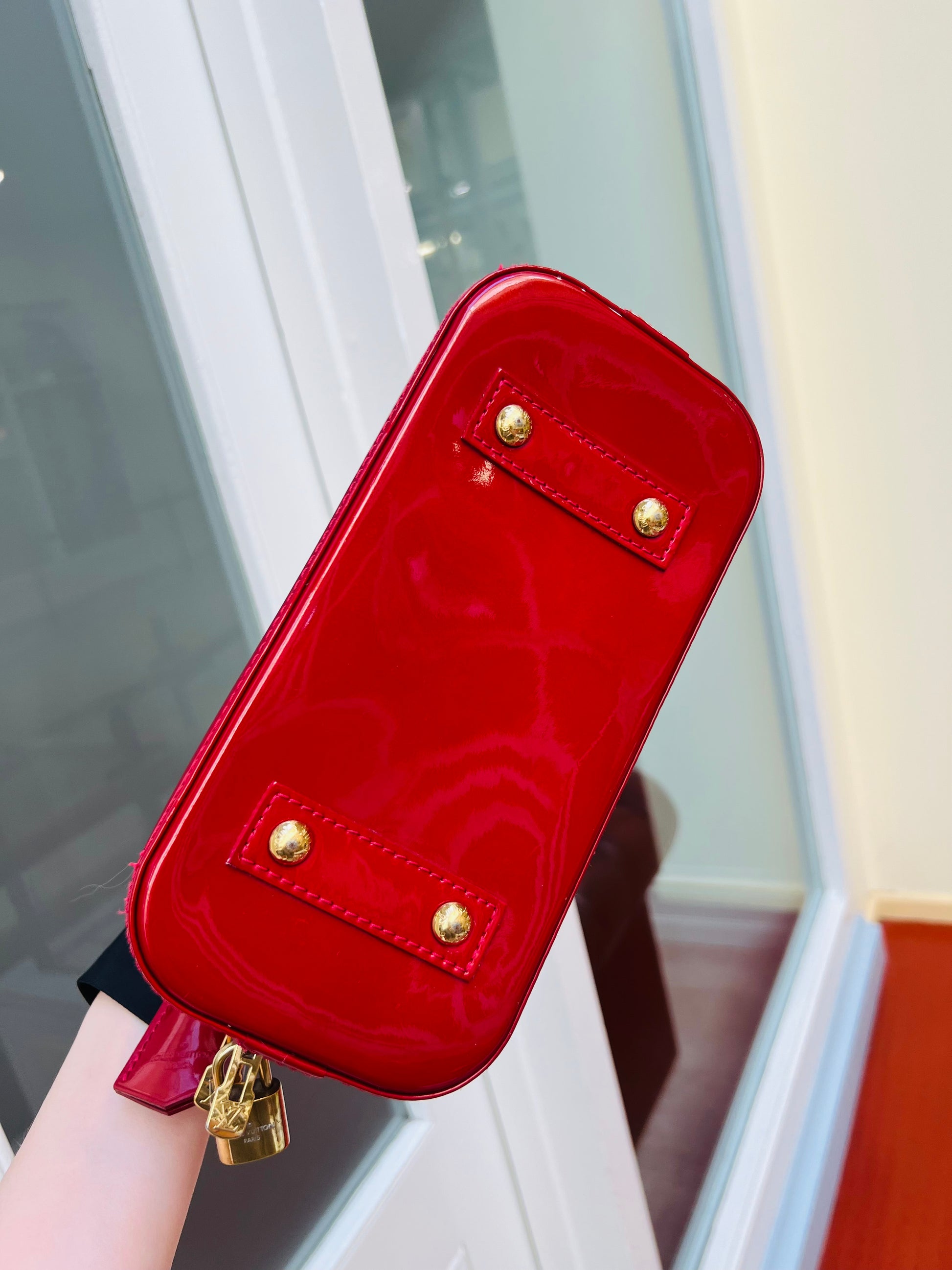 The Red Louis Vuitton Alma BB Monogram Vernis bag with gold hardware is a timeless accessory that exudes elegance and sophistication. Its glossy patent leather and signature monogram pattern make it a standout piece in any collection. This compact yet spacious bag is perfect for carrying essentials while making a chic fashion statement.
