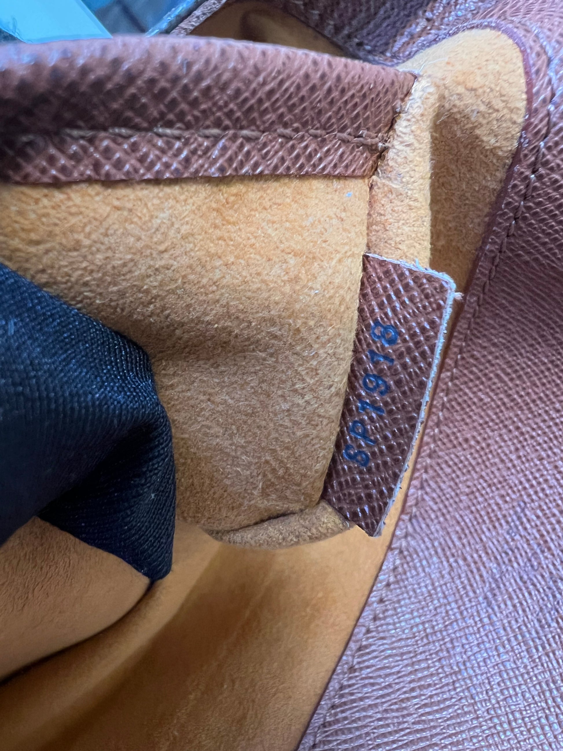 The Musette Tango features a monogram canvas body, an adjustable vachetta leather shoulder strap, a front flap with magnetic snap closure, and an interior slip pocket. Color: Brown. Serial Number: SP1918.